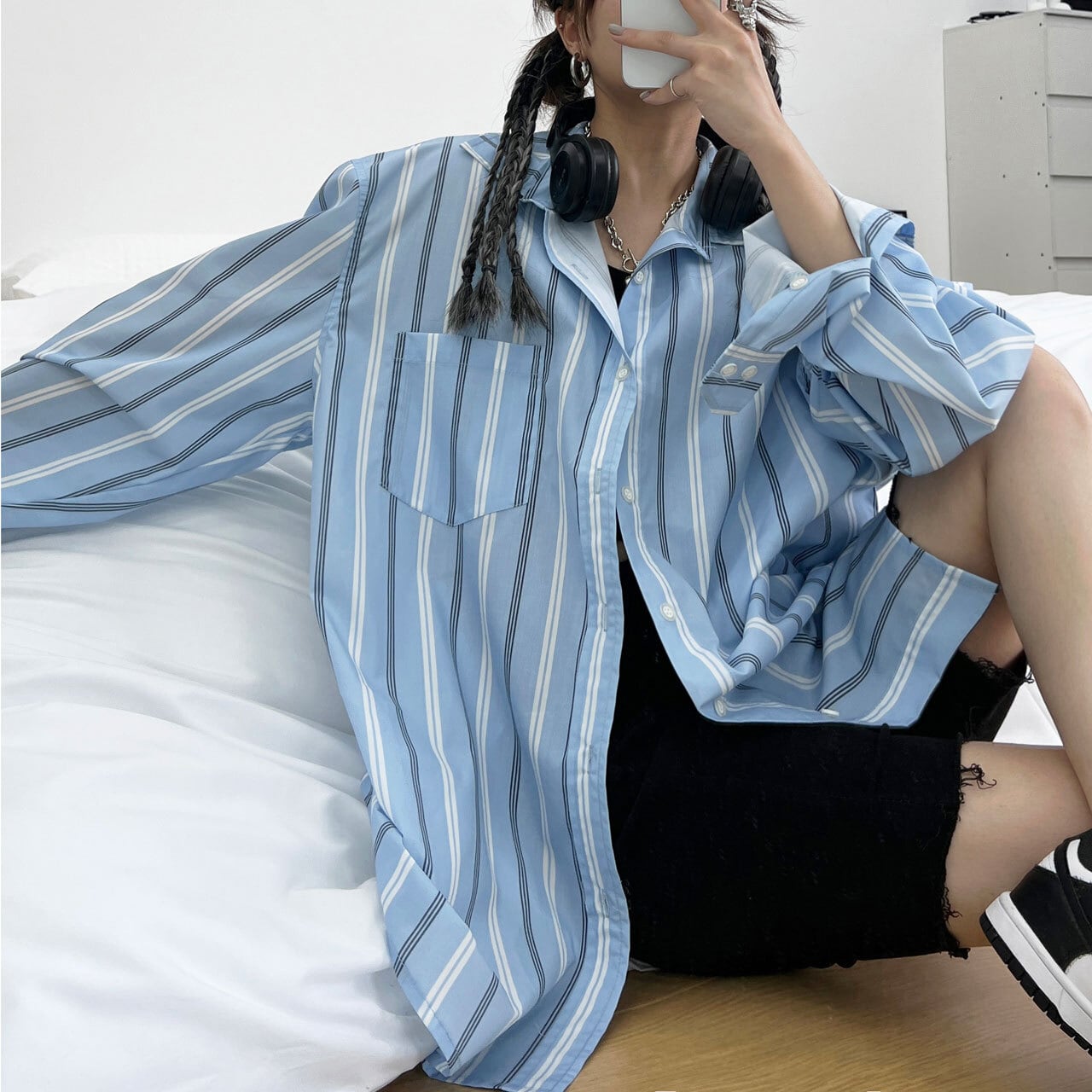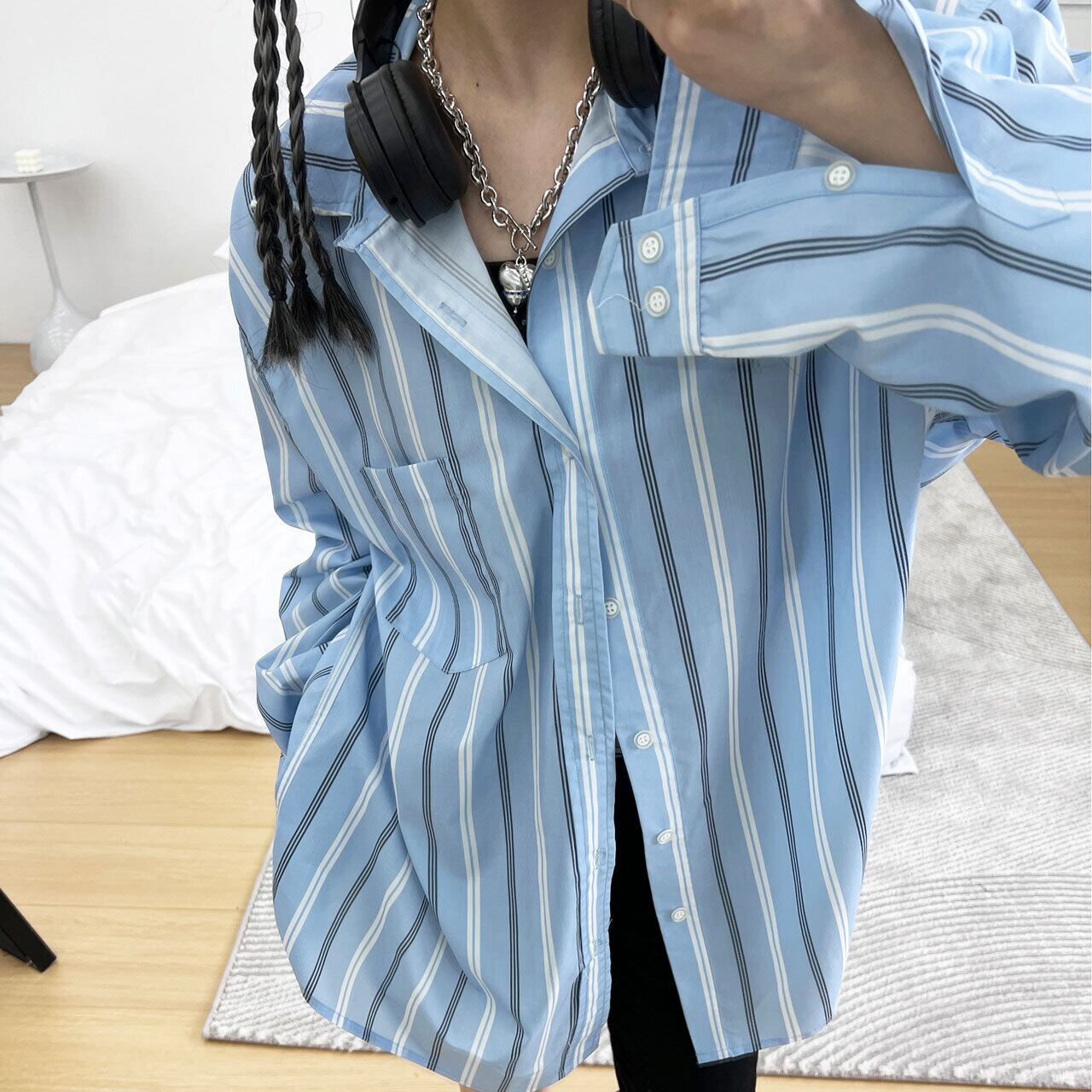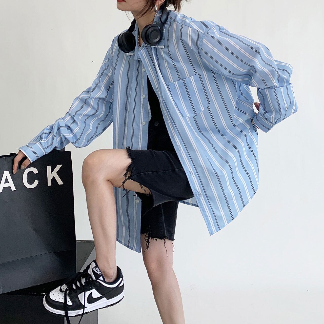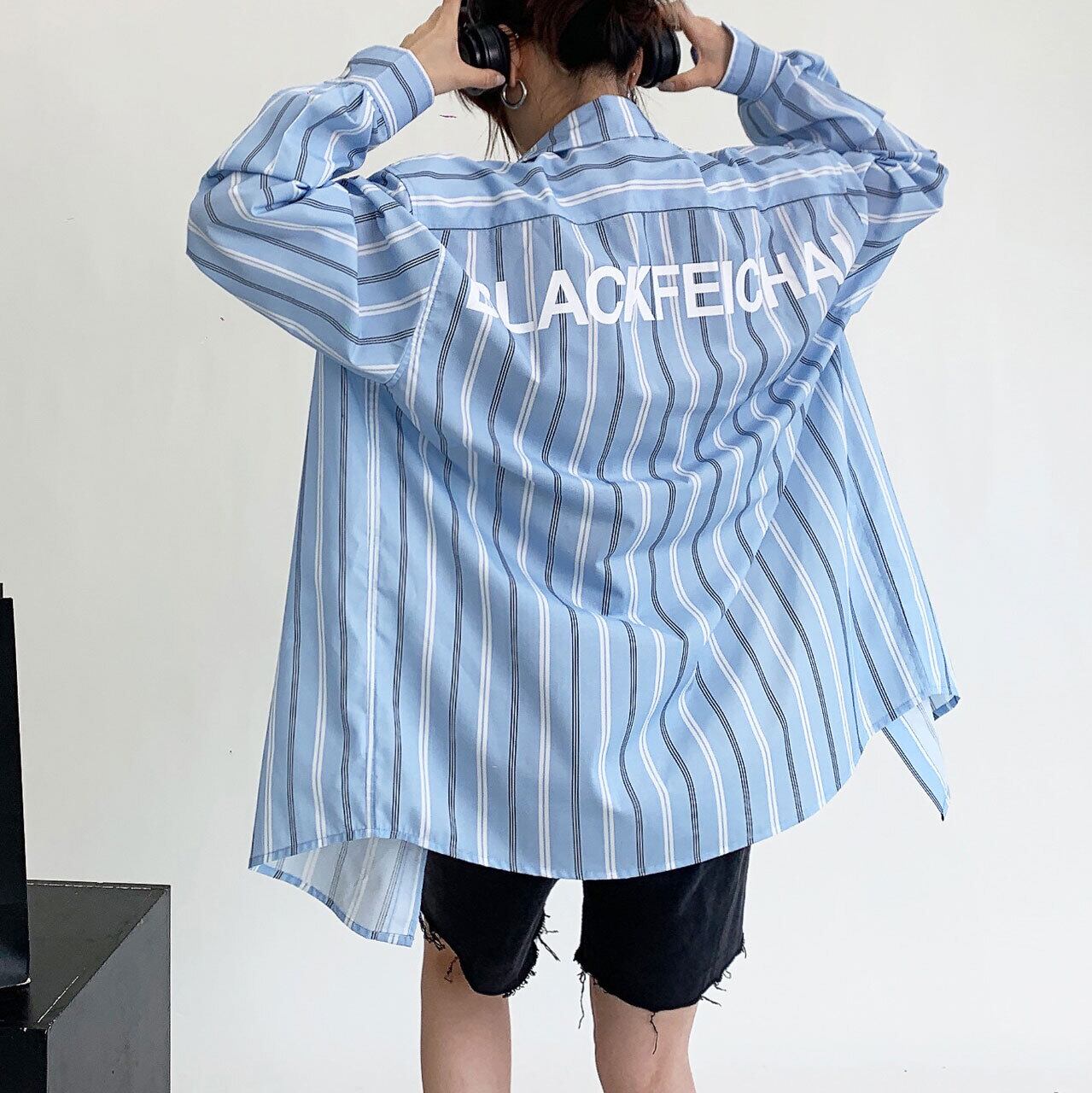 バックロゴプリントストライプオーバーサイズシャツ R00151