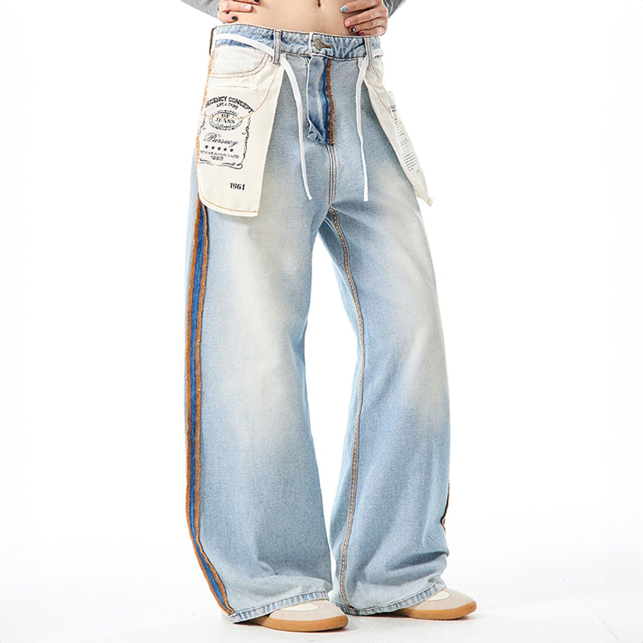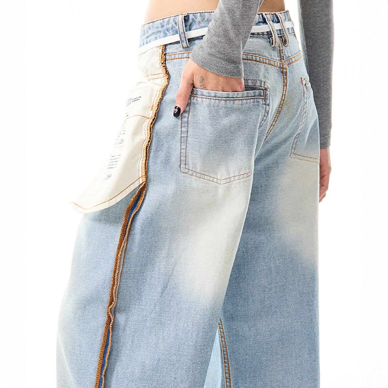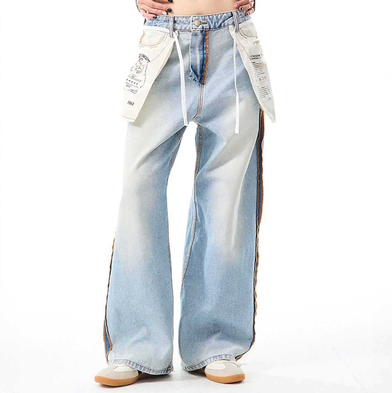 サイドの配色ステッチや、タグ風ディテールが目を引くデザインデニム。