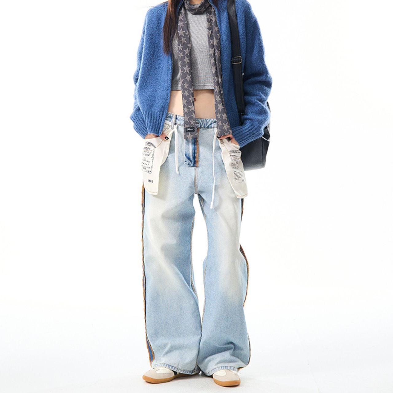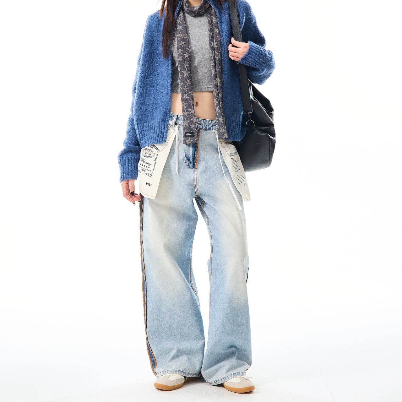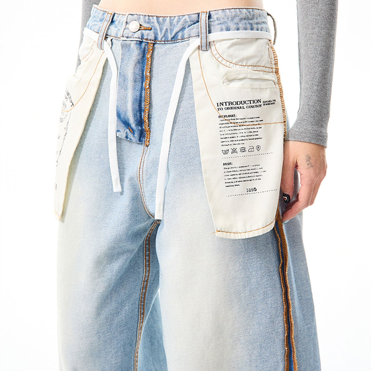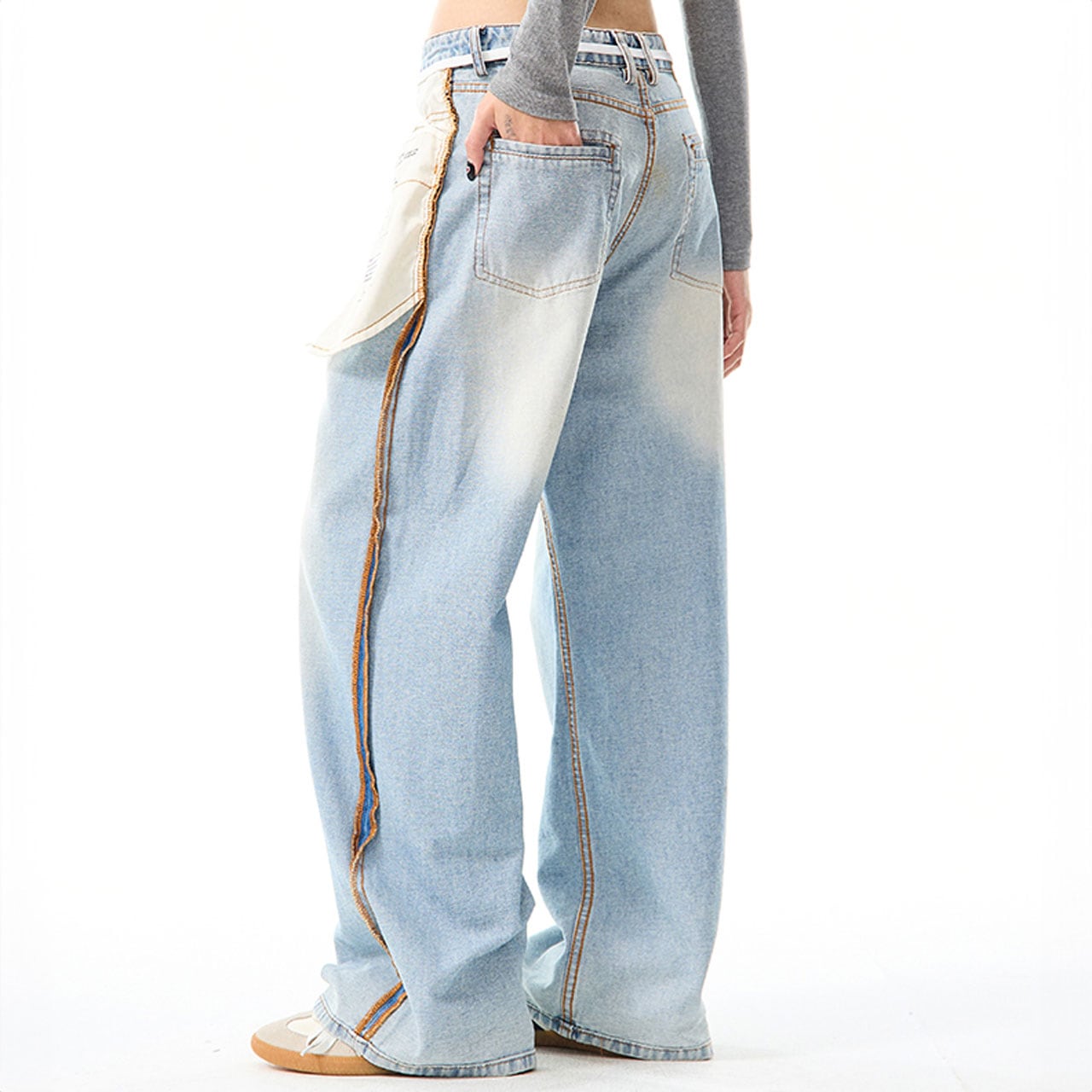 サイドの配色ステッチや、タグ風ディテールが目を引くデザインデニム。