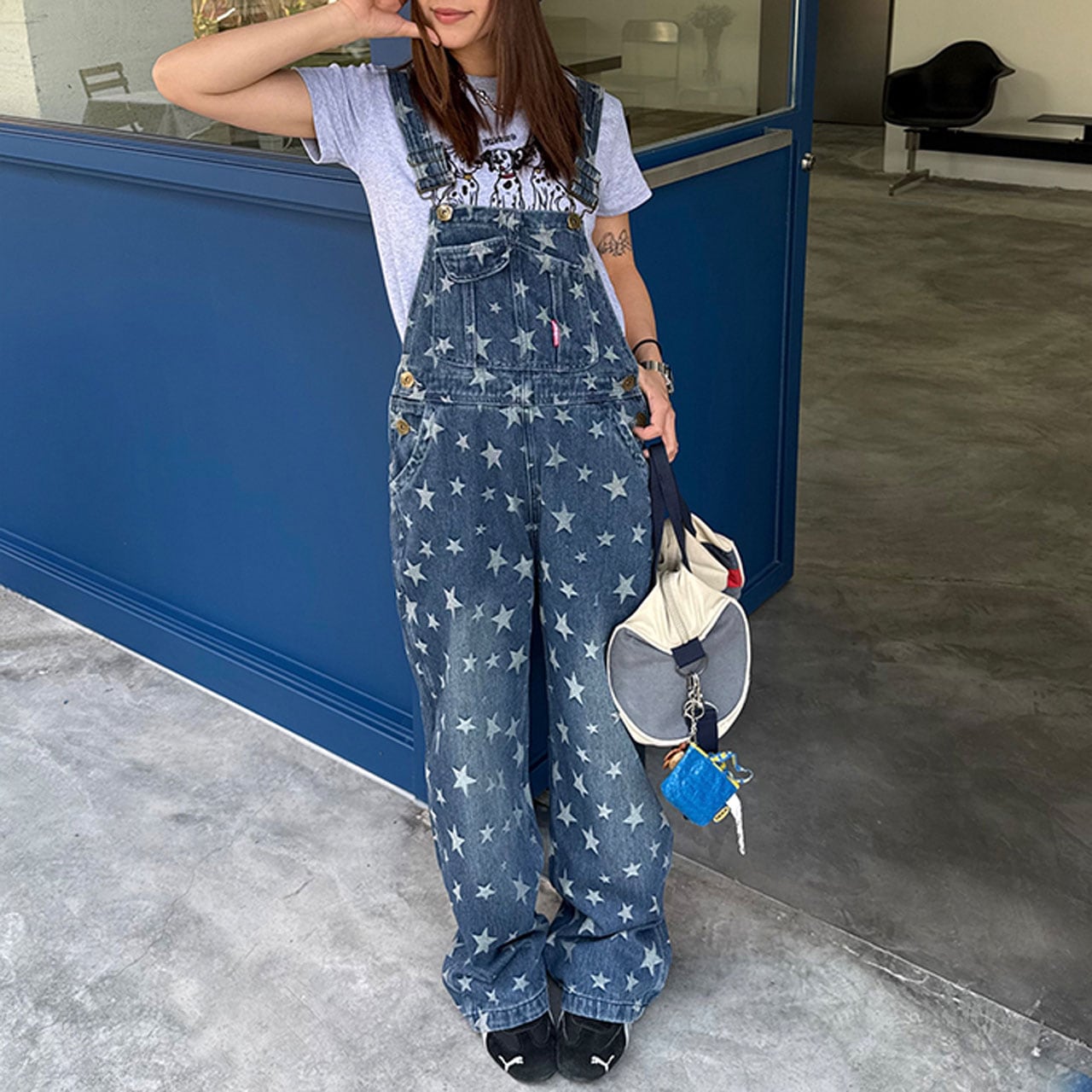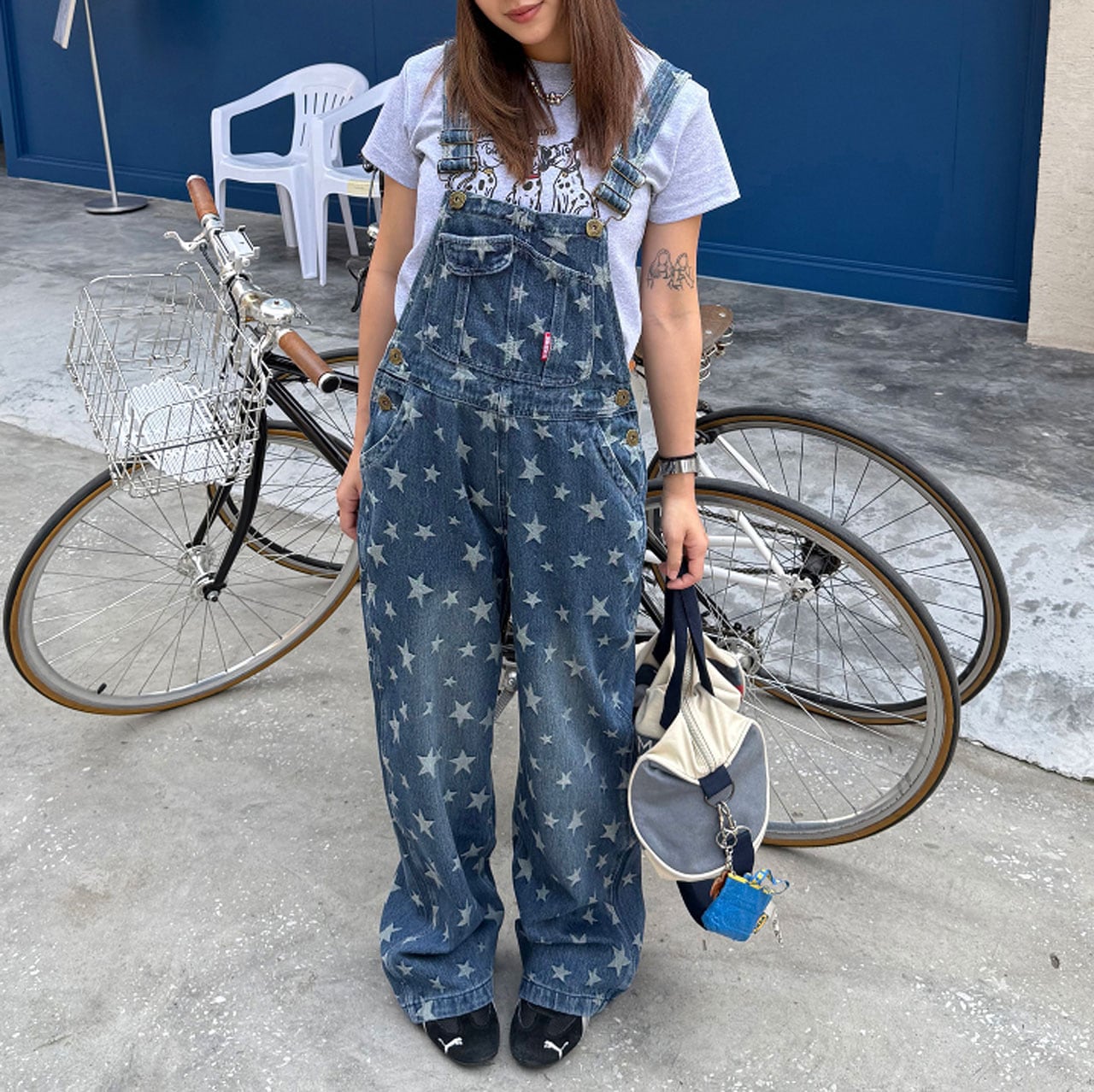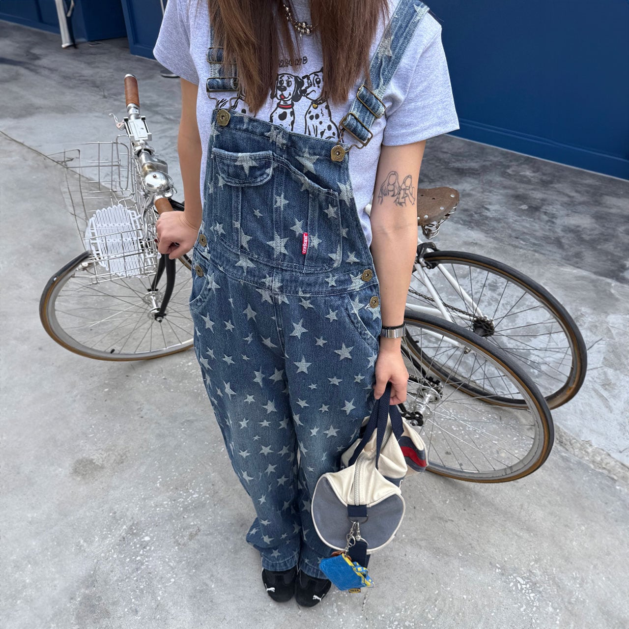 星柄プリントが目を引くデニムオーバーオールは、遊び心とヴィンテージ感を兼ね備えた1着。