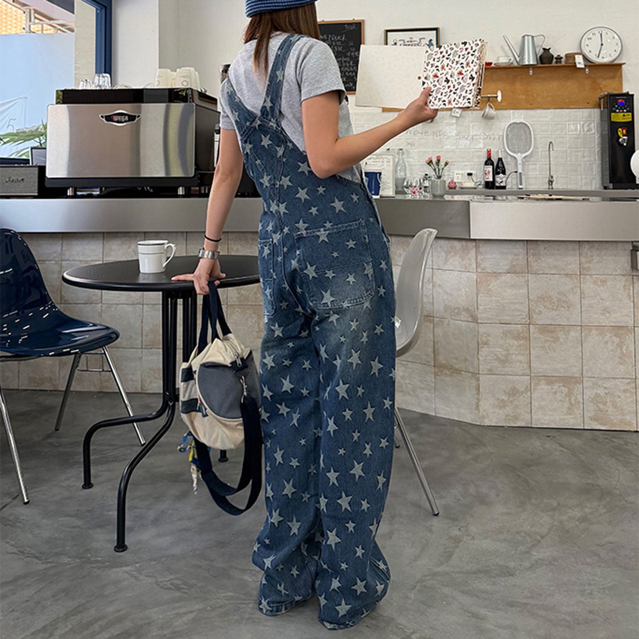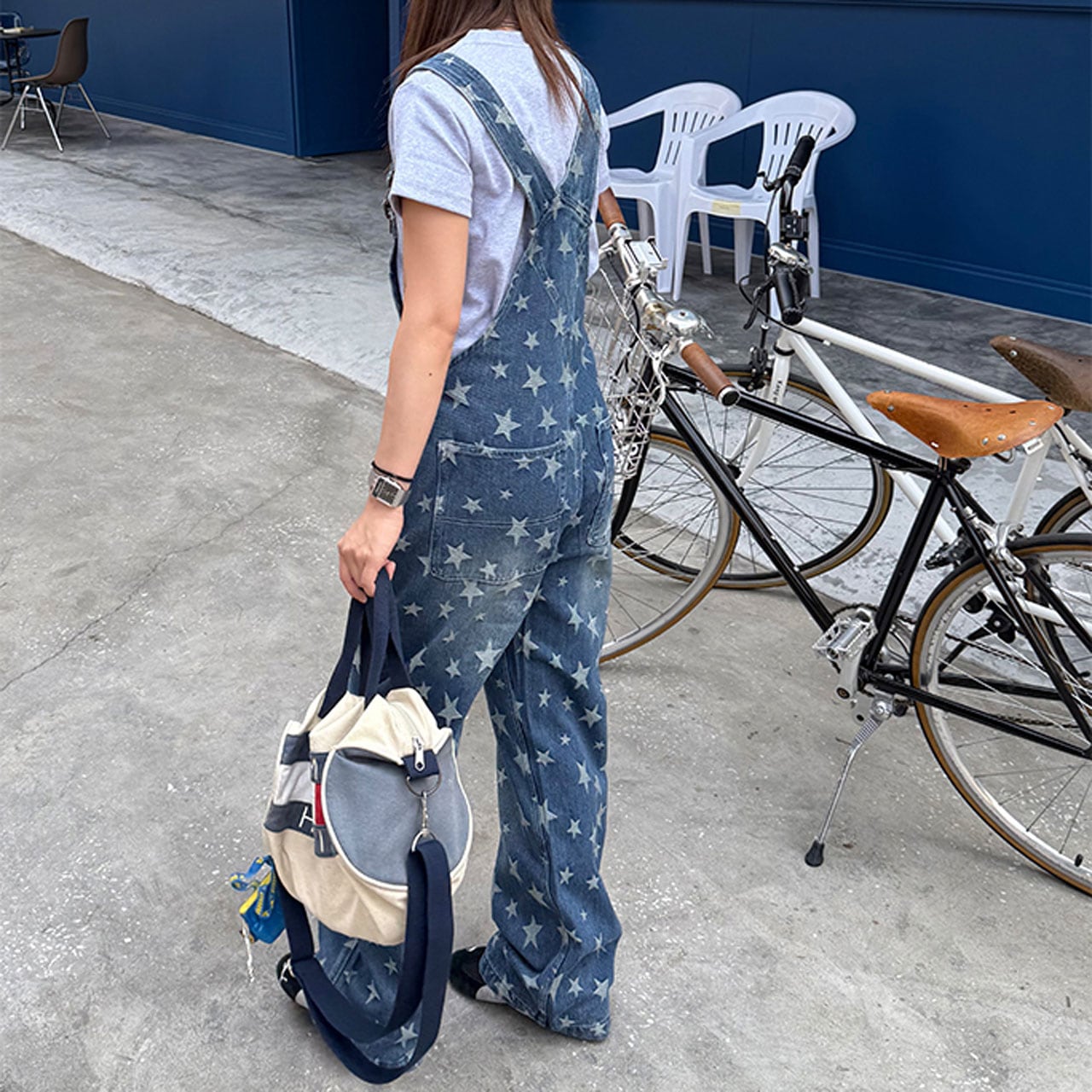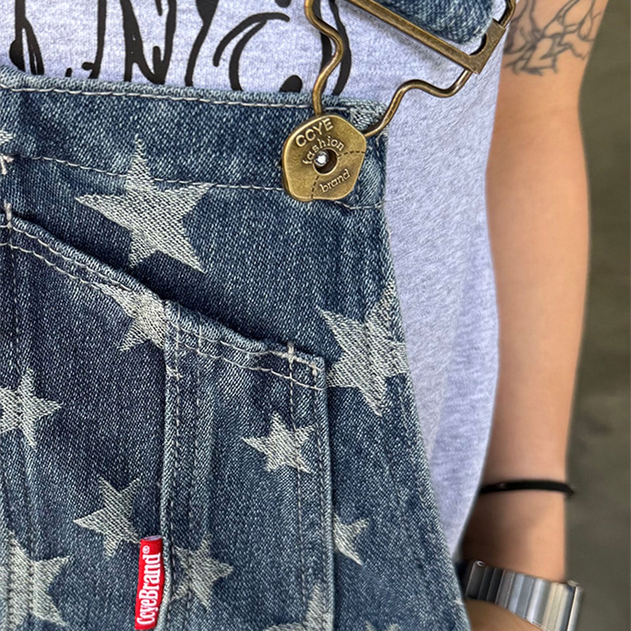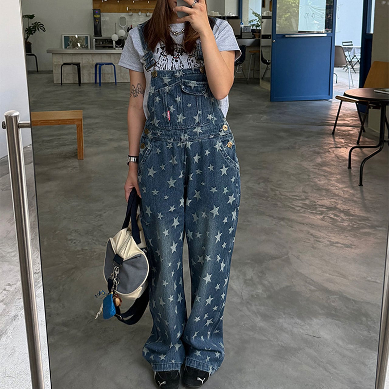 星柄プリントが目を引くデニムオーバーオールは、遊び心とヴィンテージ感を兼ね備えた1着。