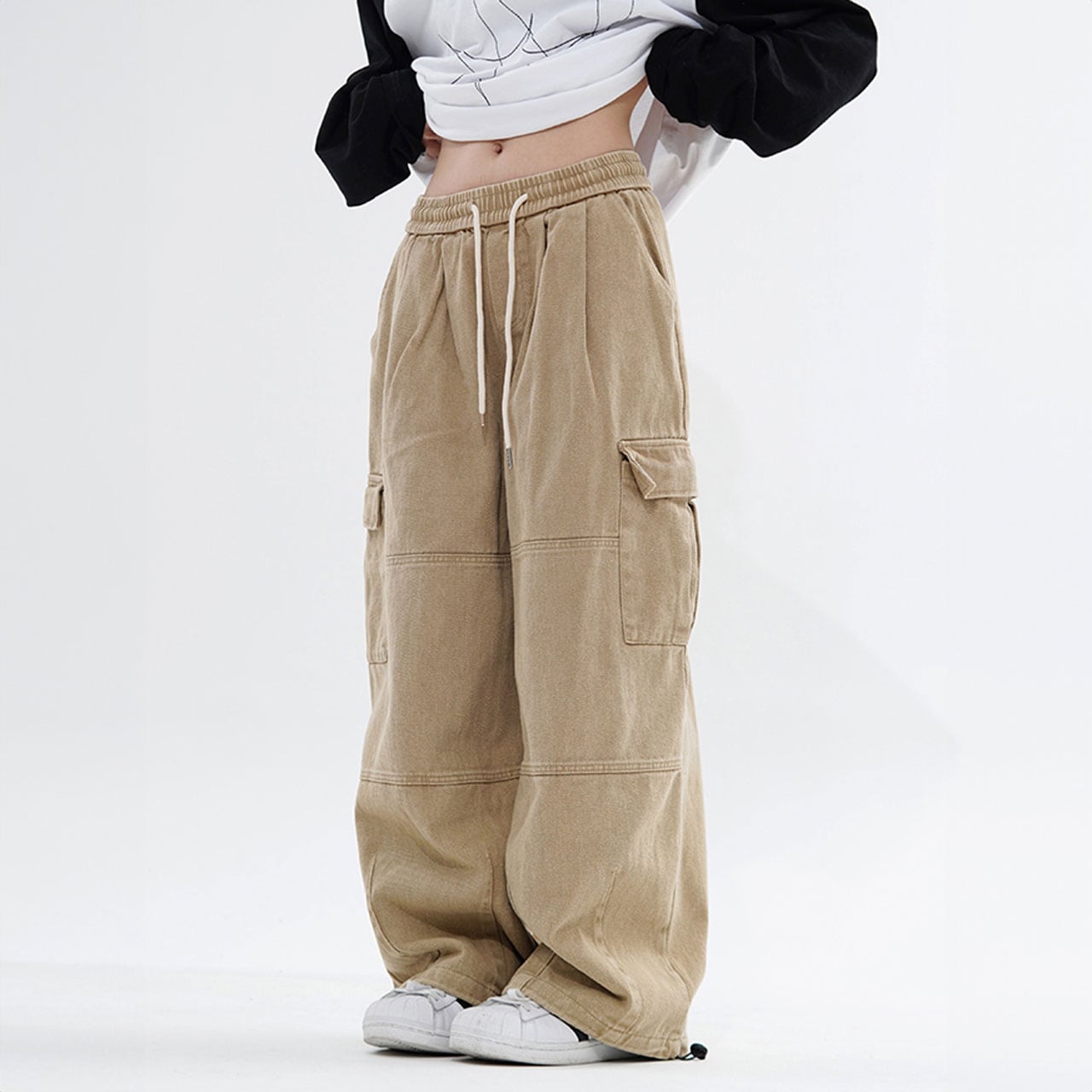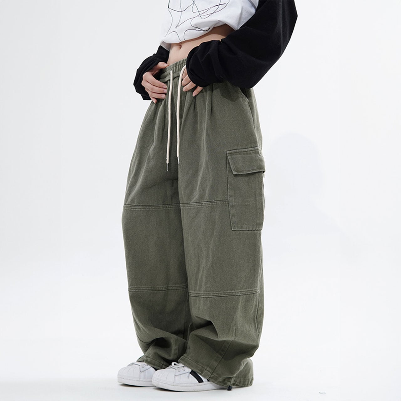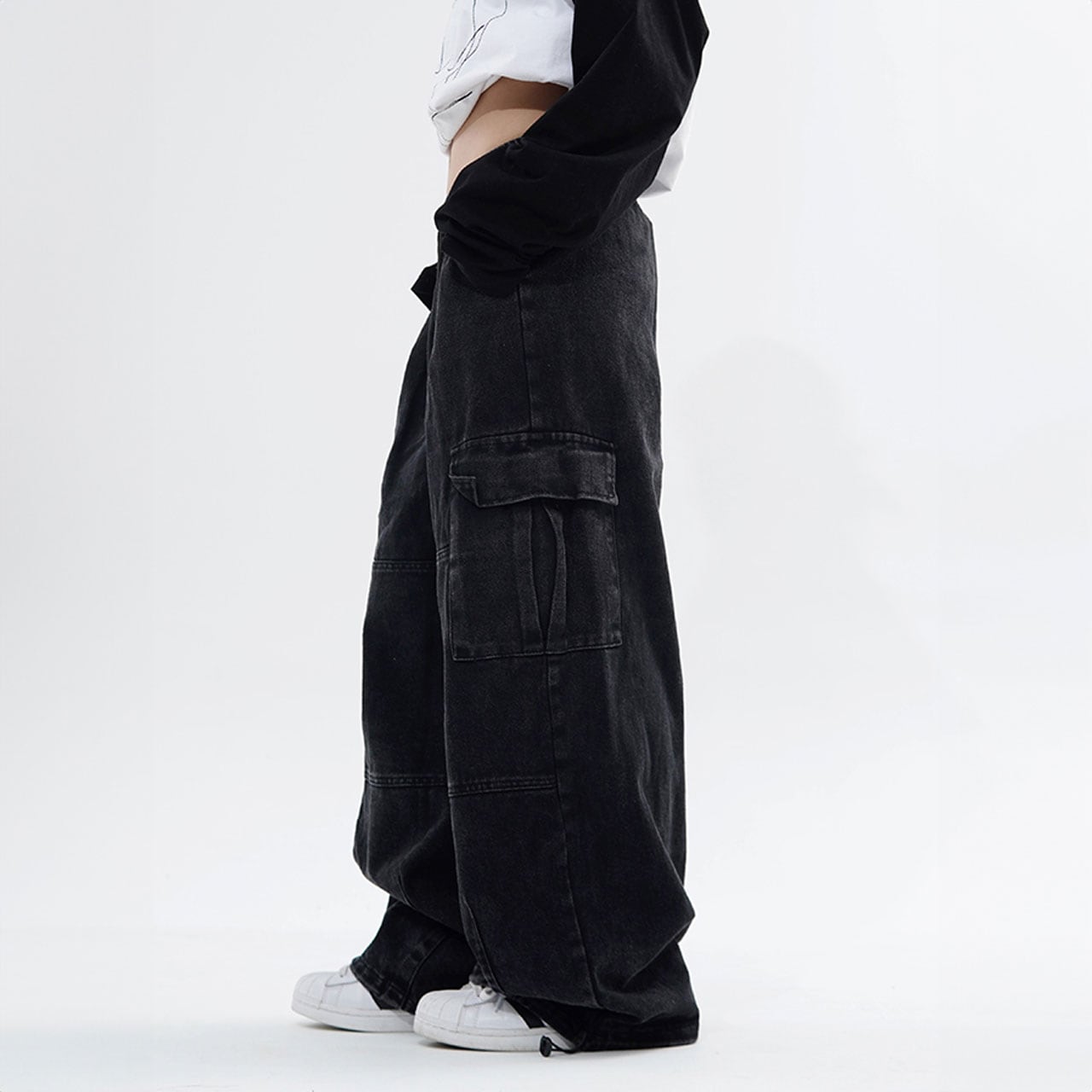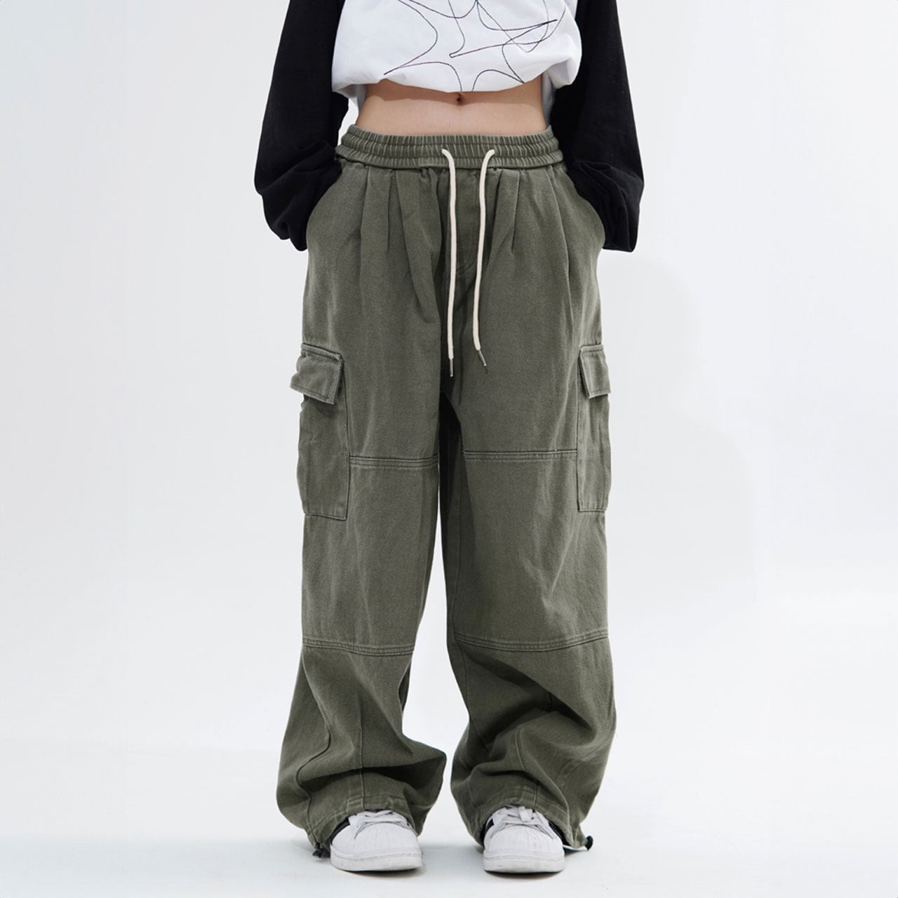 ゆったりシルエットとカーゴポケットがポイントのデザインパンツ。