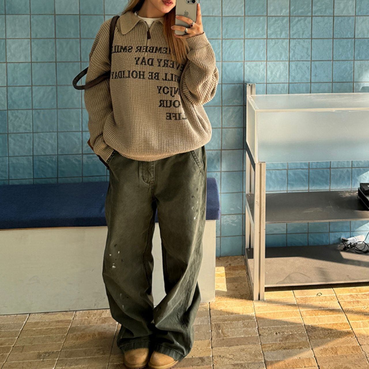 フロントロゴが目を引く、ハーフジップタイプのゆるニットトップス。
