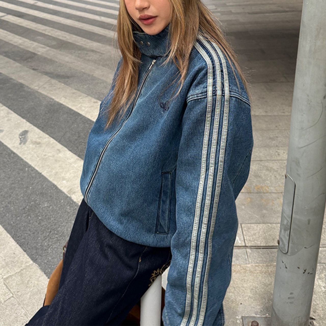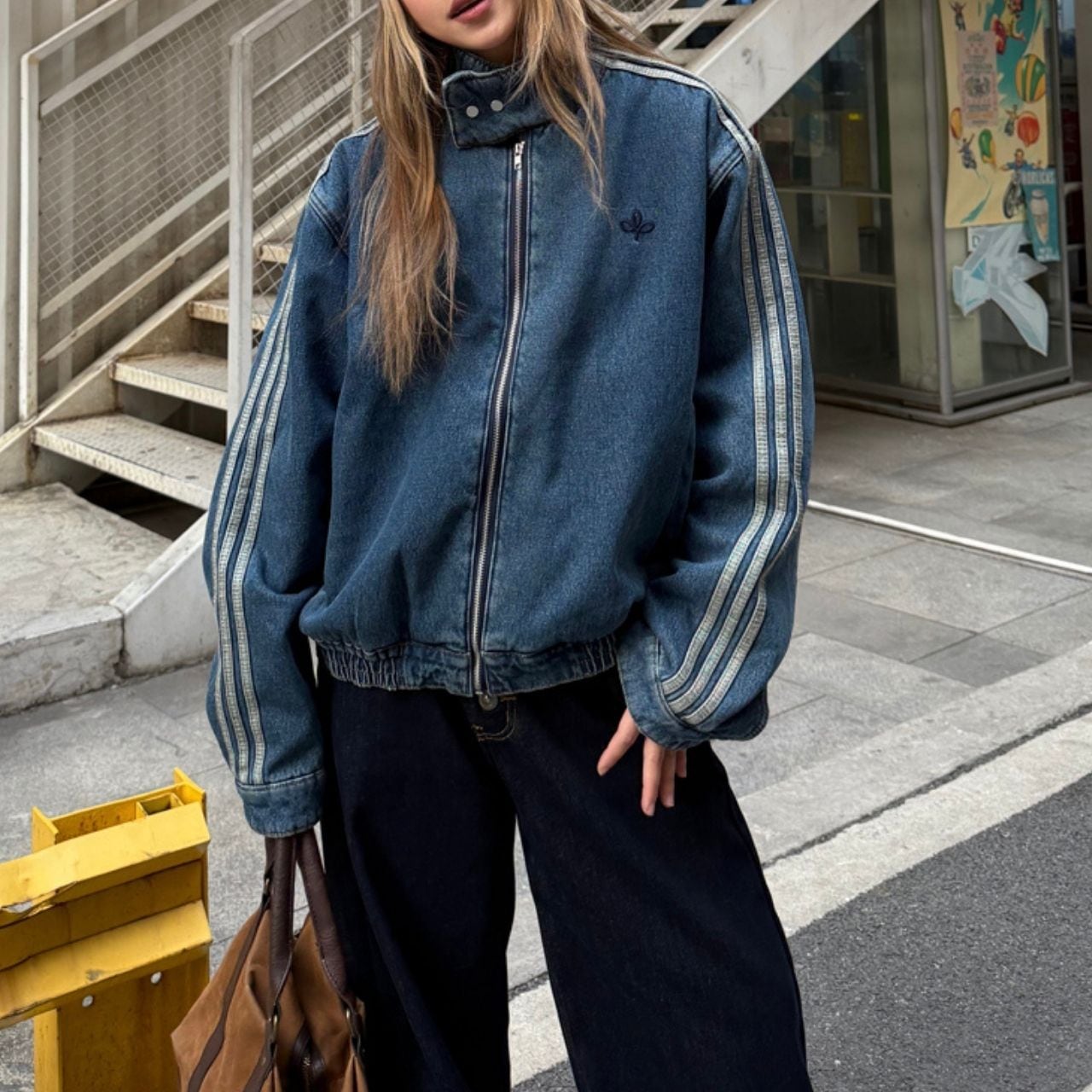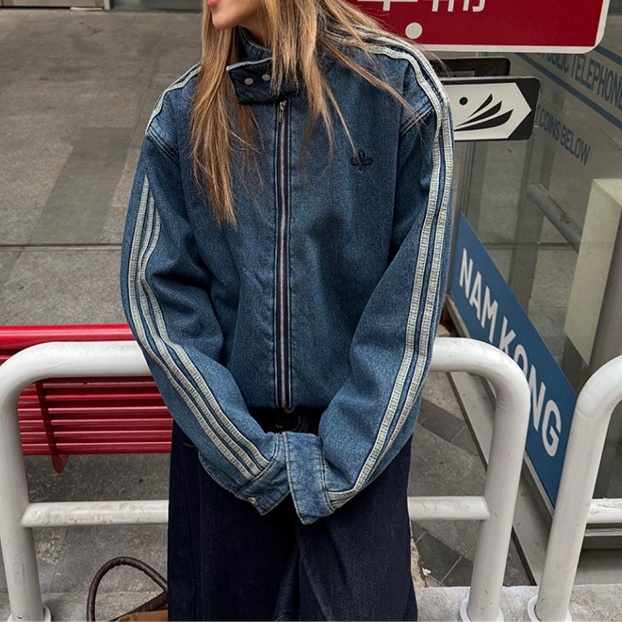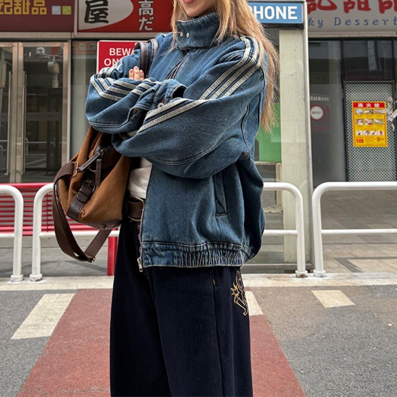 袖ラインがアクセントになった、スタンドカラーのデニムジャケット。