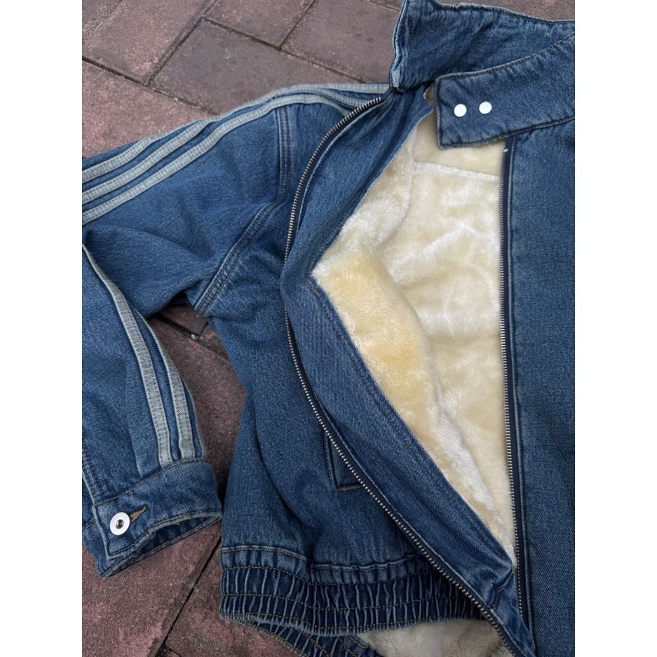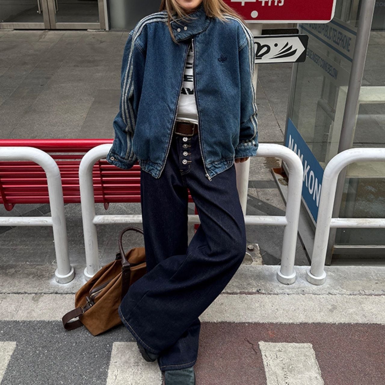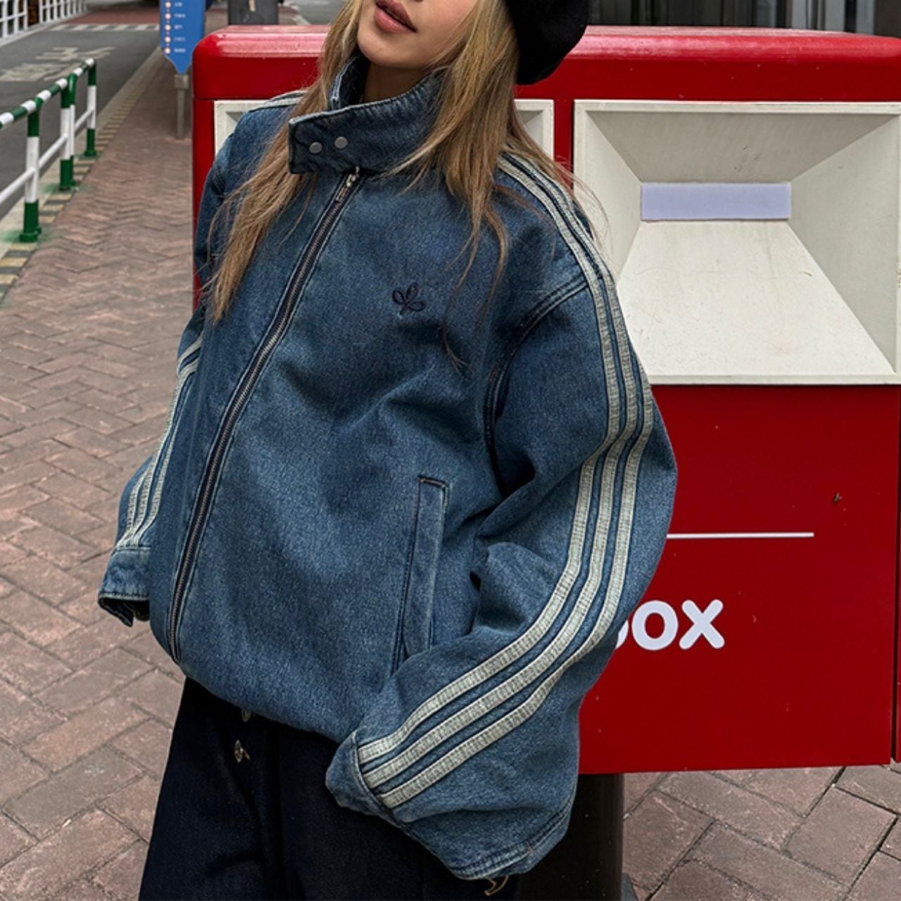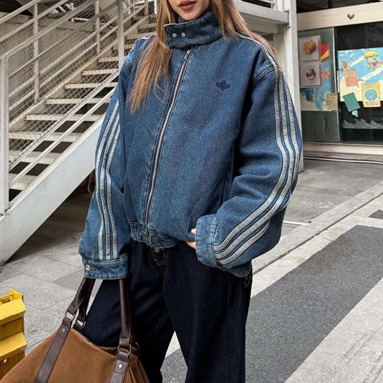 袖ラインがアクセントになった、スタンドカラーのデニムジャケット。