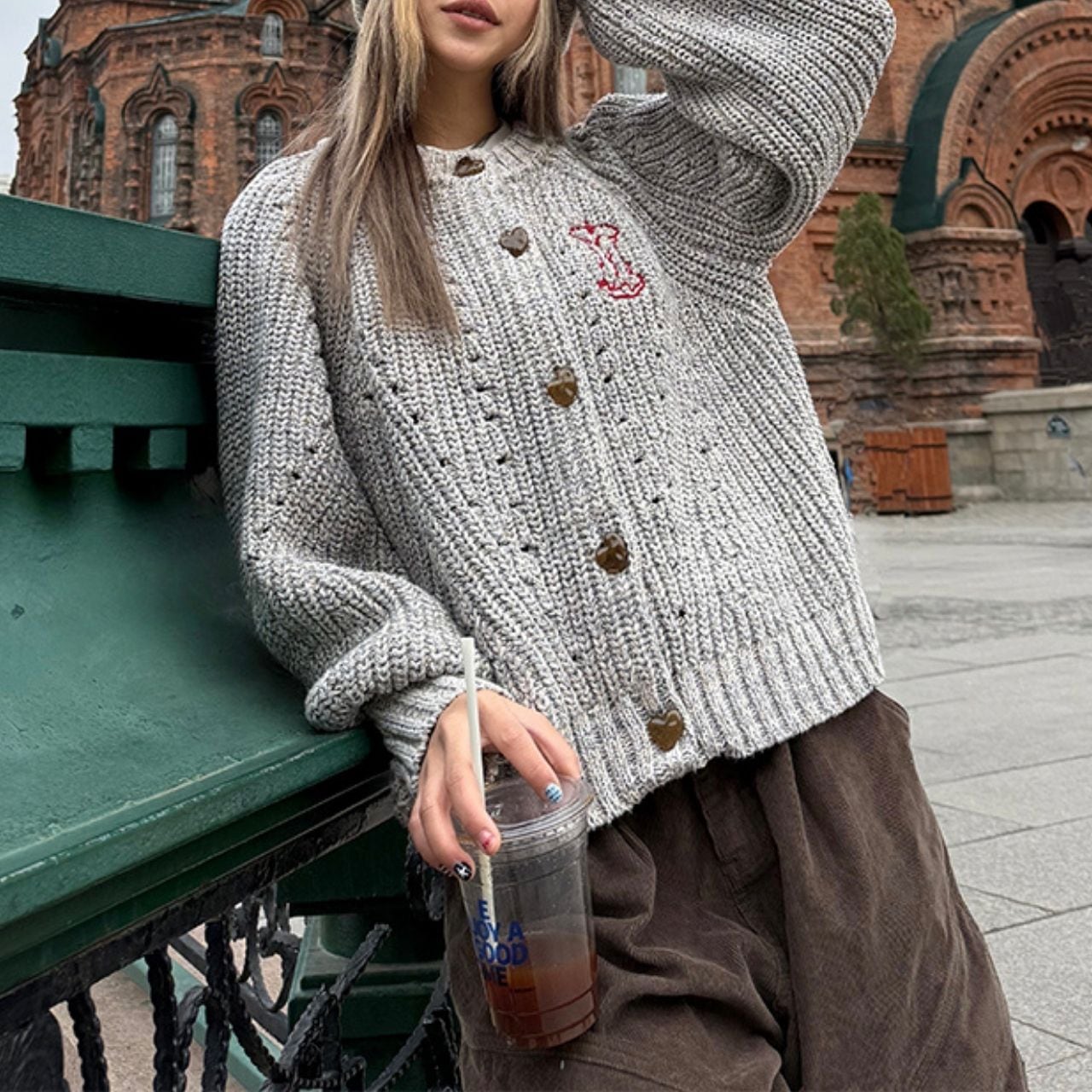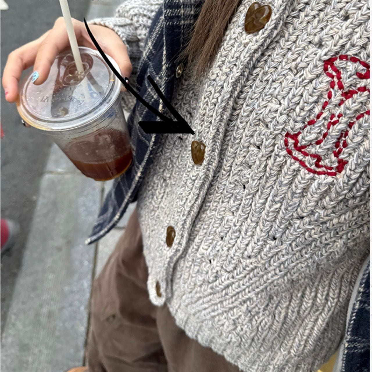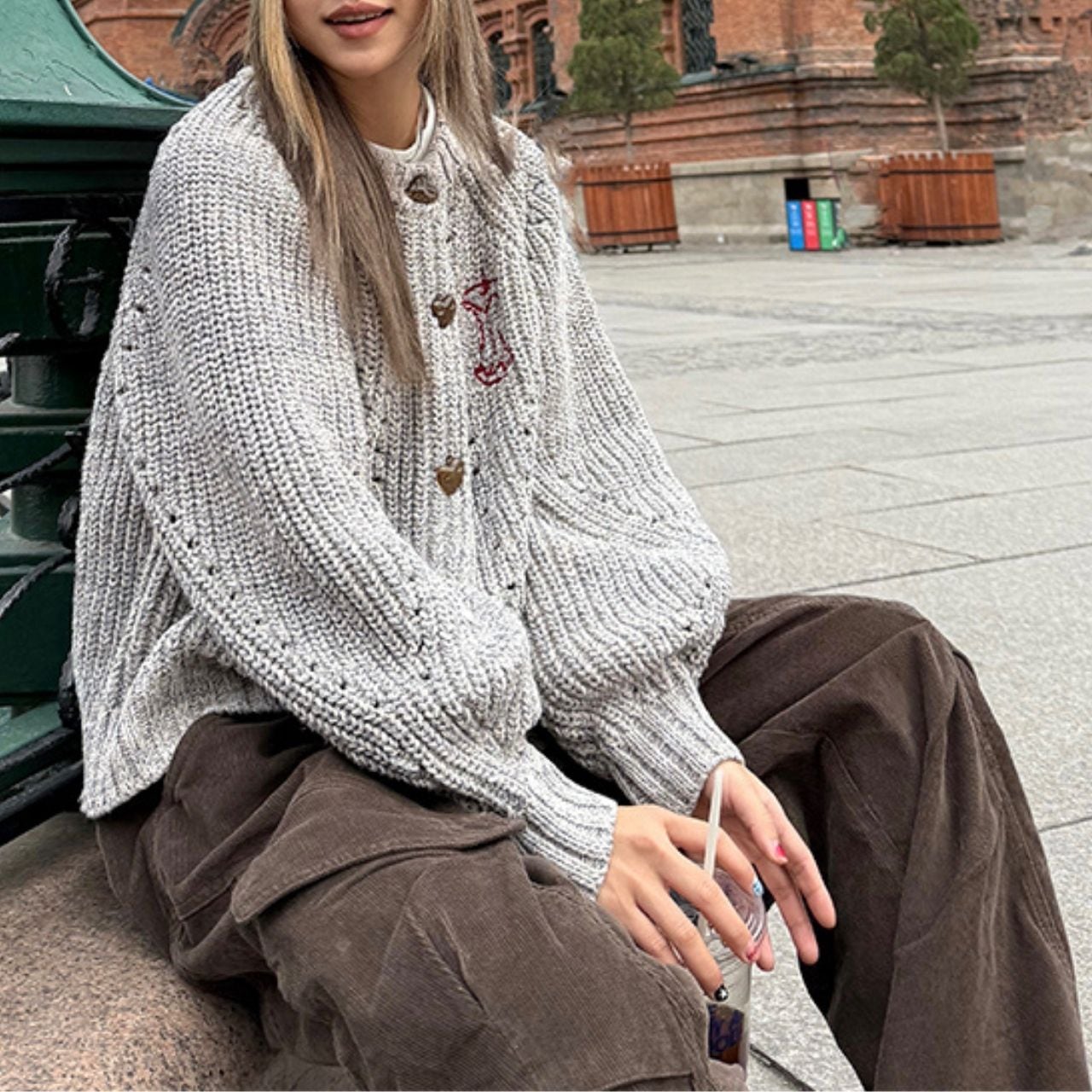 ころんとしたハートボタンとざっくり編みのシルエットで、ゆるかわ×ストリートな雰囲気に。