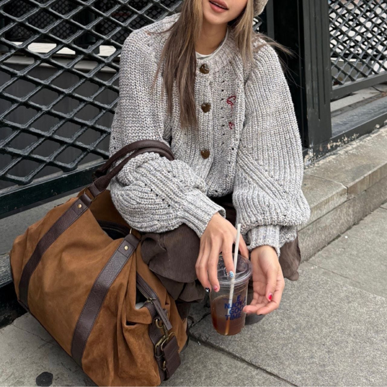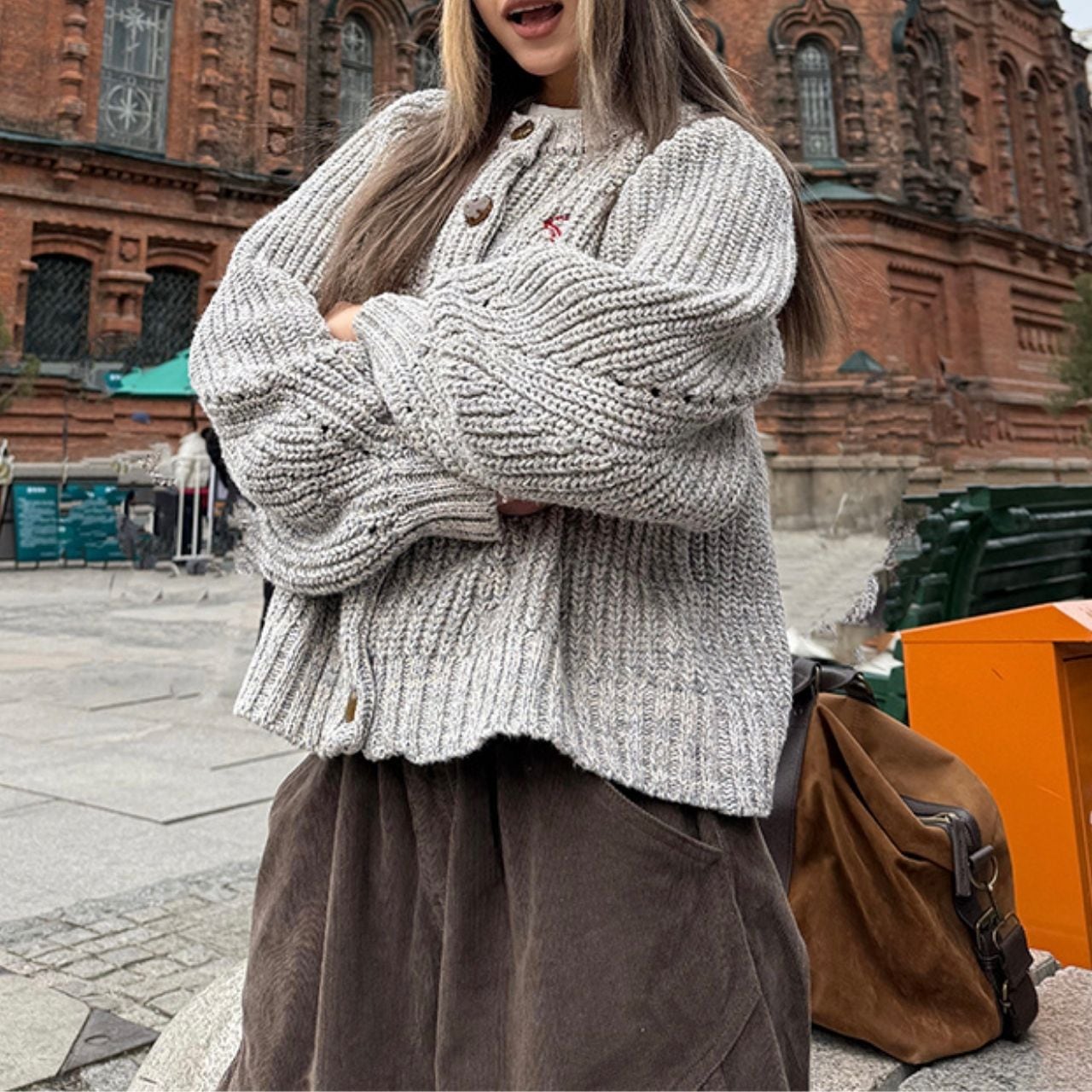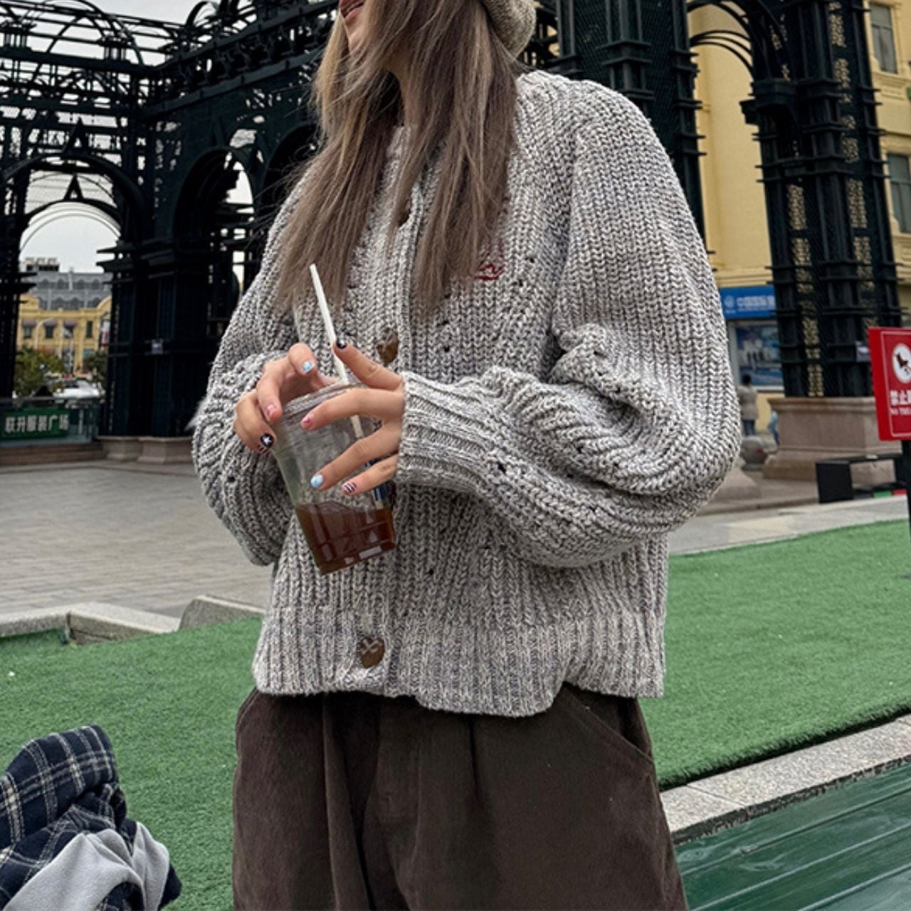 ころんとしたハートボタンとざっくり編みのシルエットで、ゆるかわ×ストリートな雰囲気に。