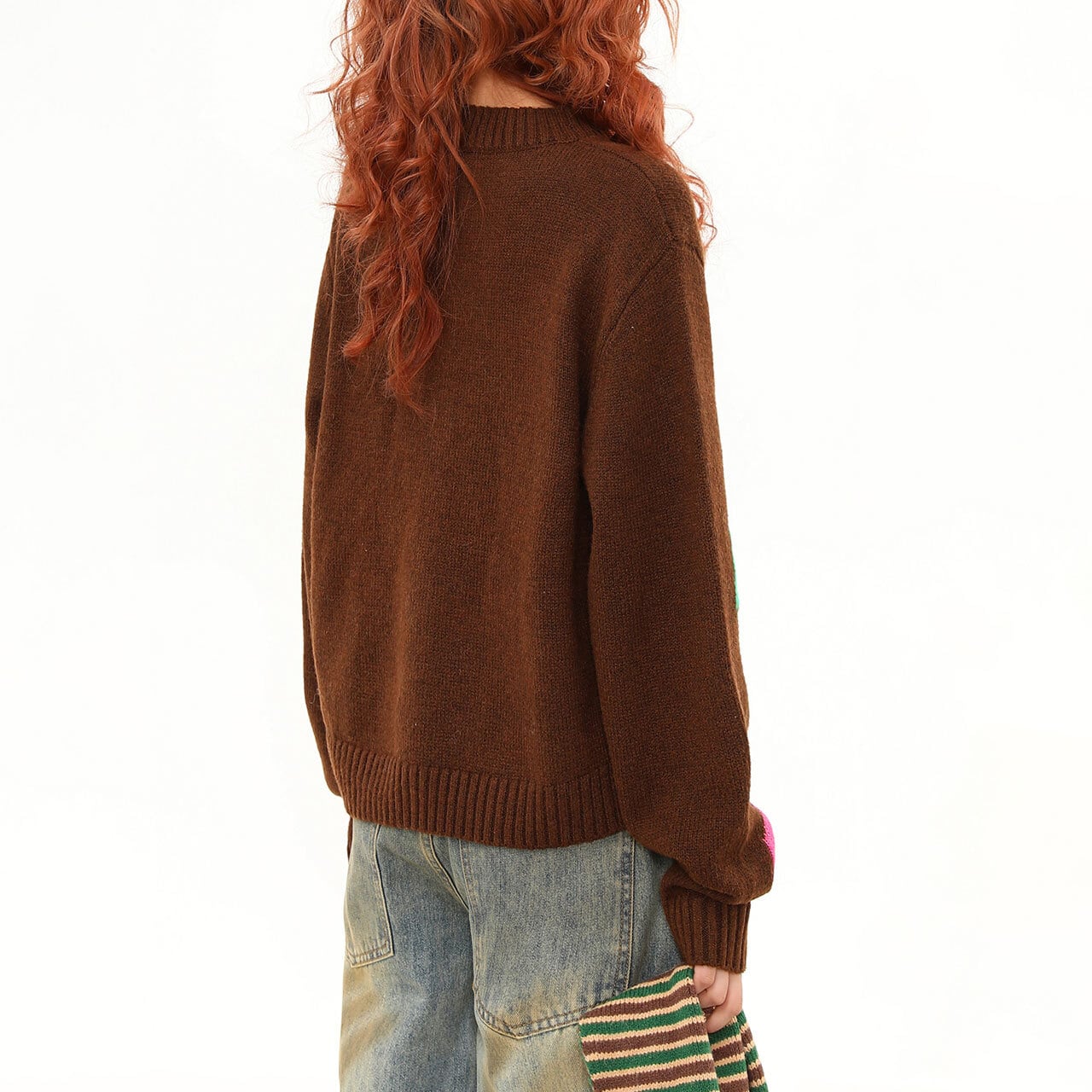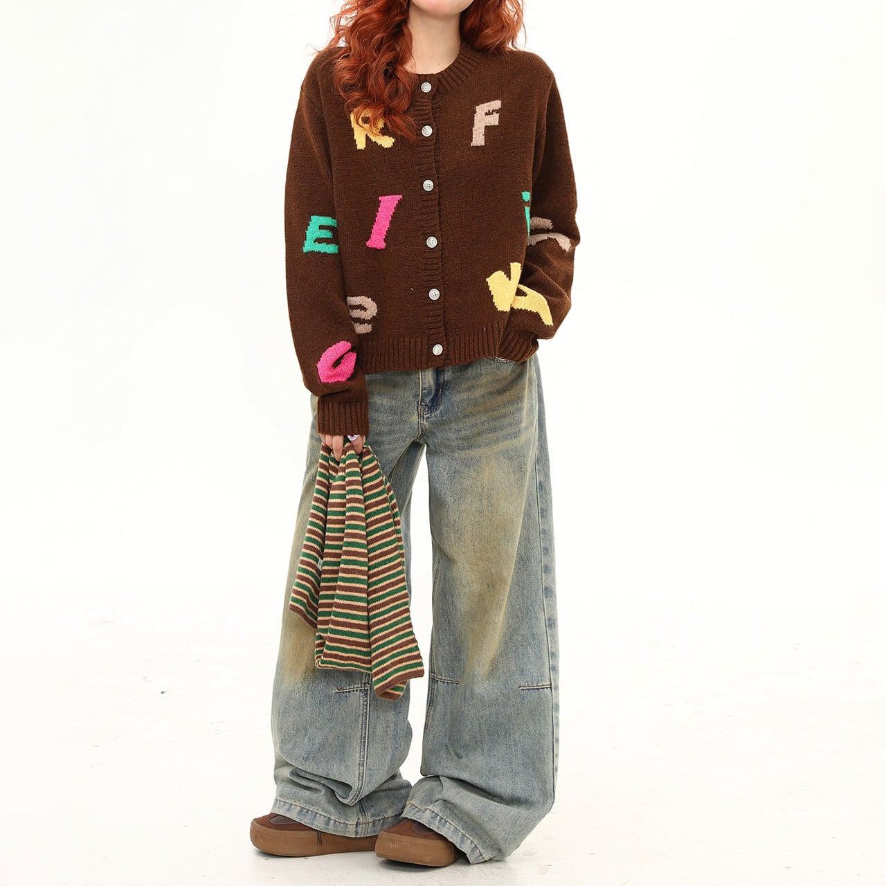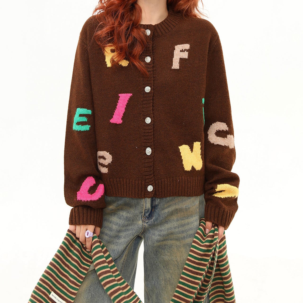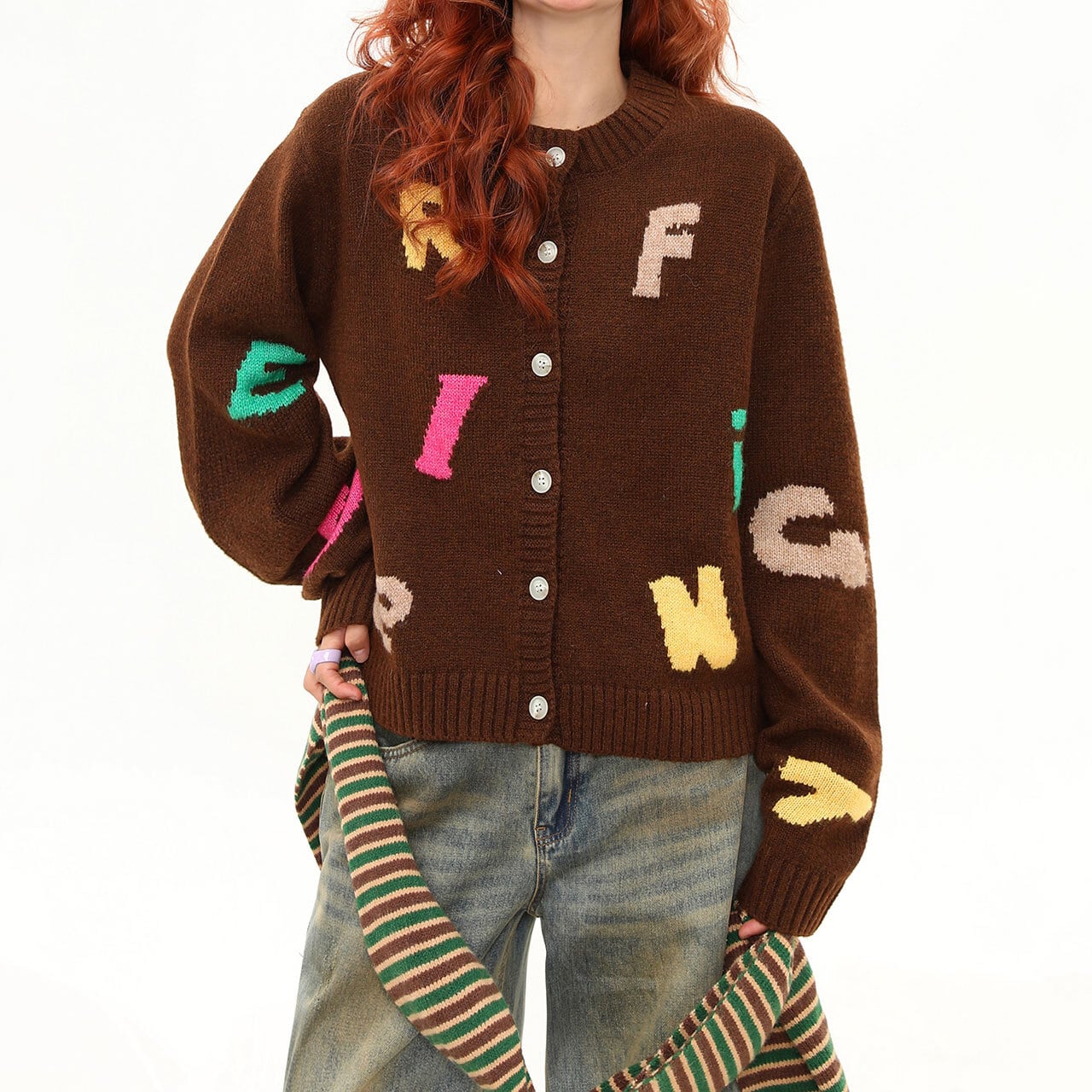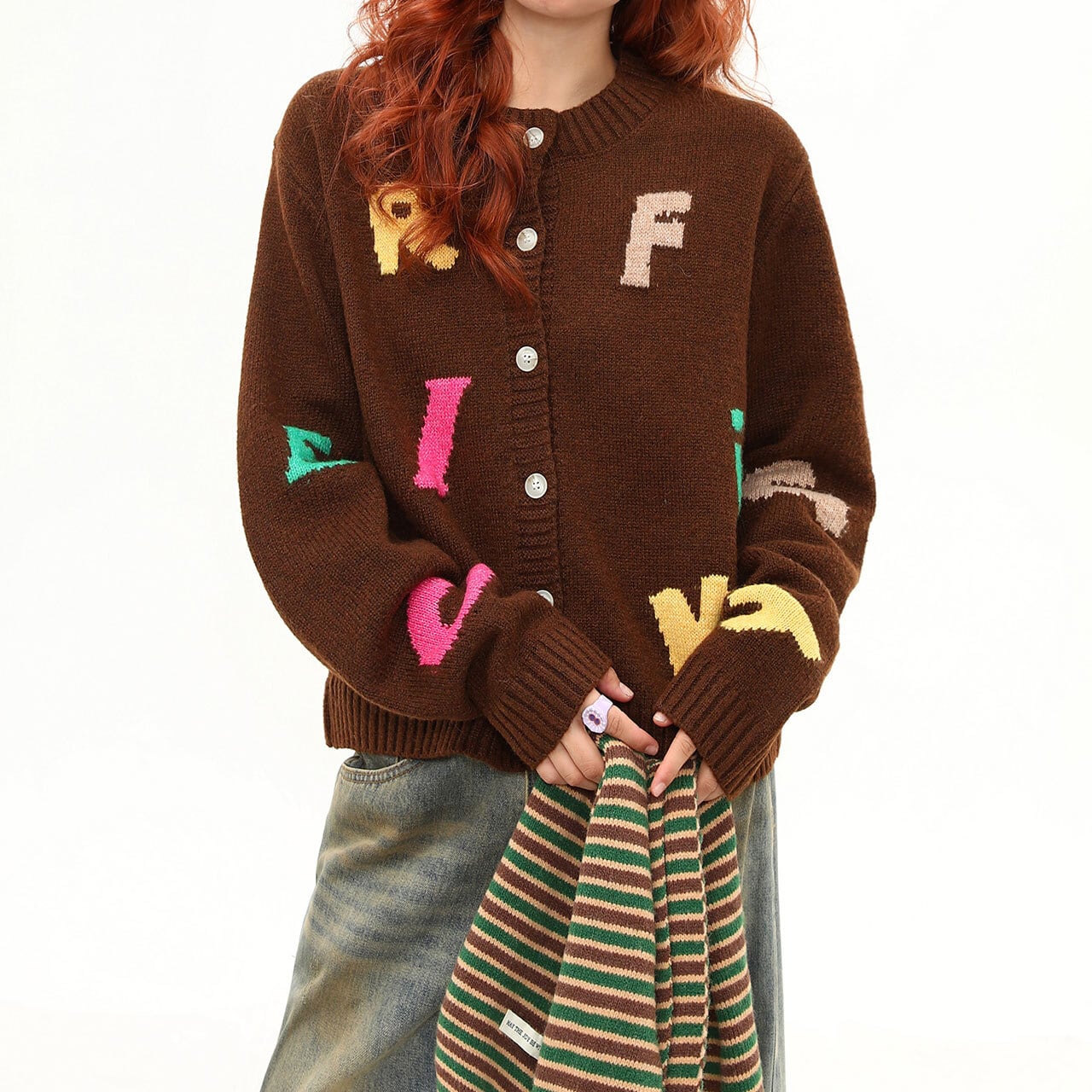 ポップなアルファベットが散りばめられた、遊び心満点のニットカーディガン。