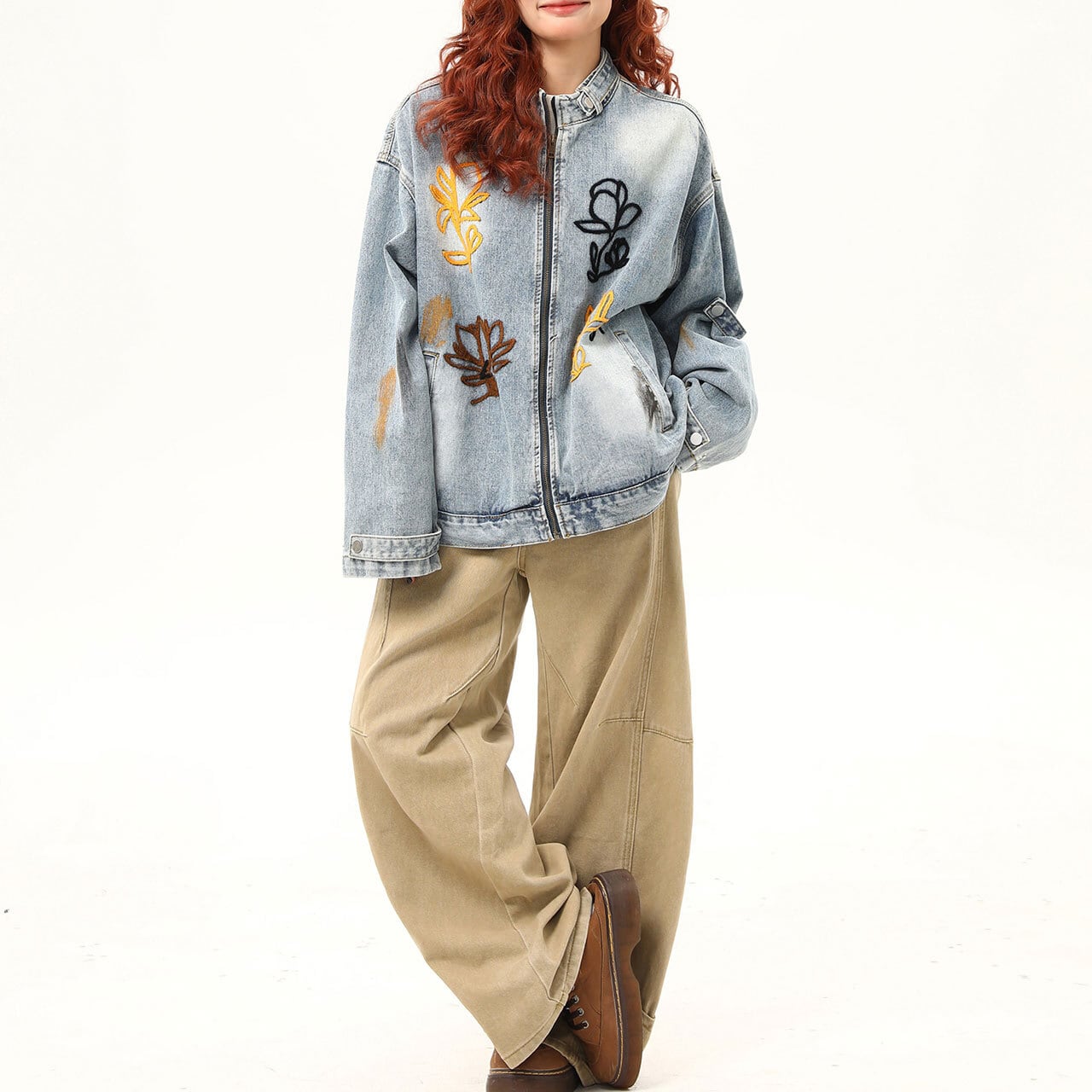 手描き風のフラワー刺繍が目を引く、アート感あふれるデニムジャケット。