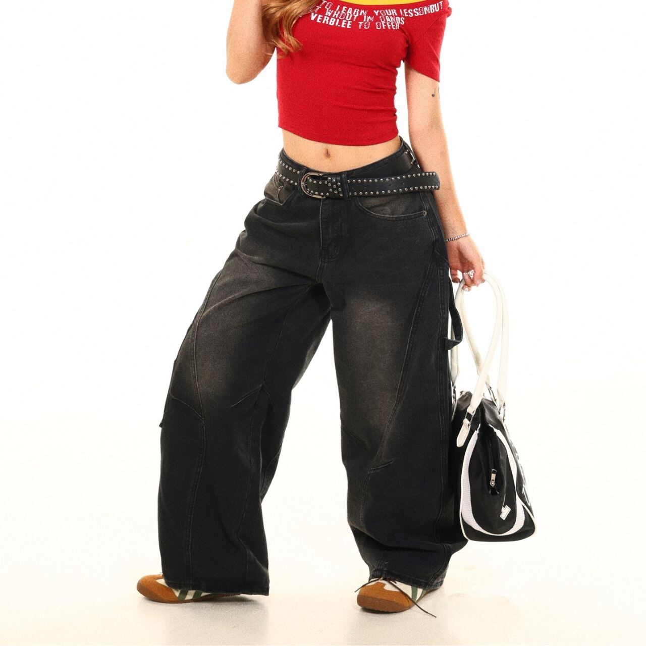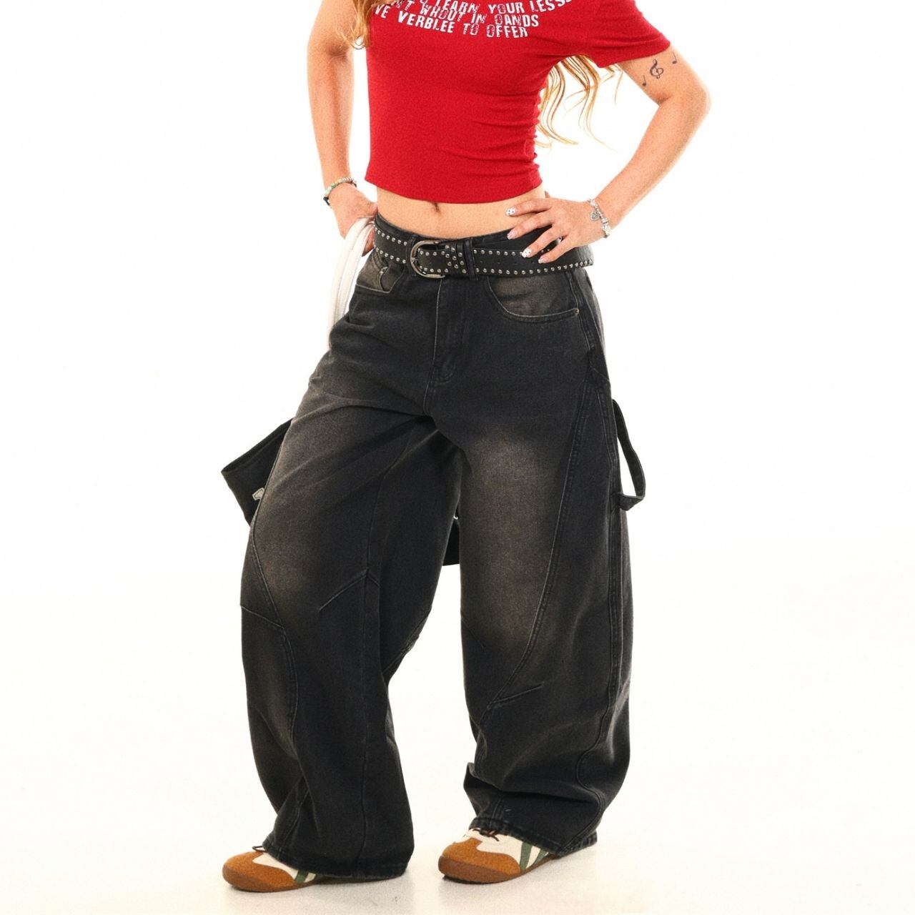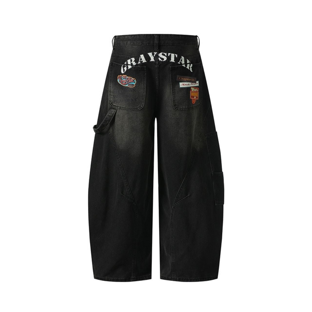 バックの大胆なロゴとワッペン風デザインが目を引くワイドパンツ。