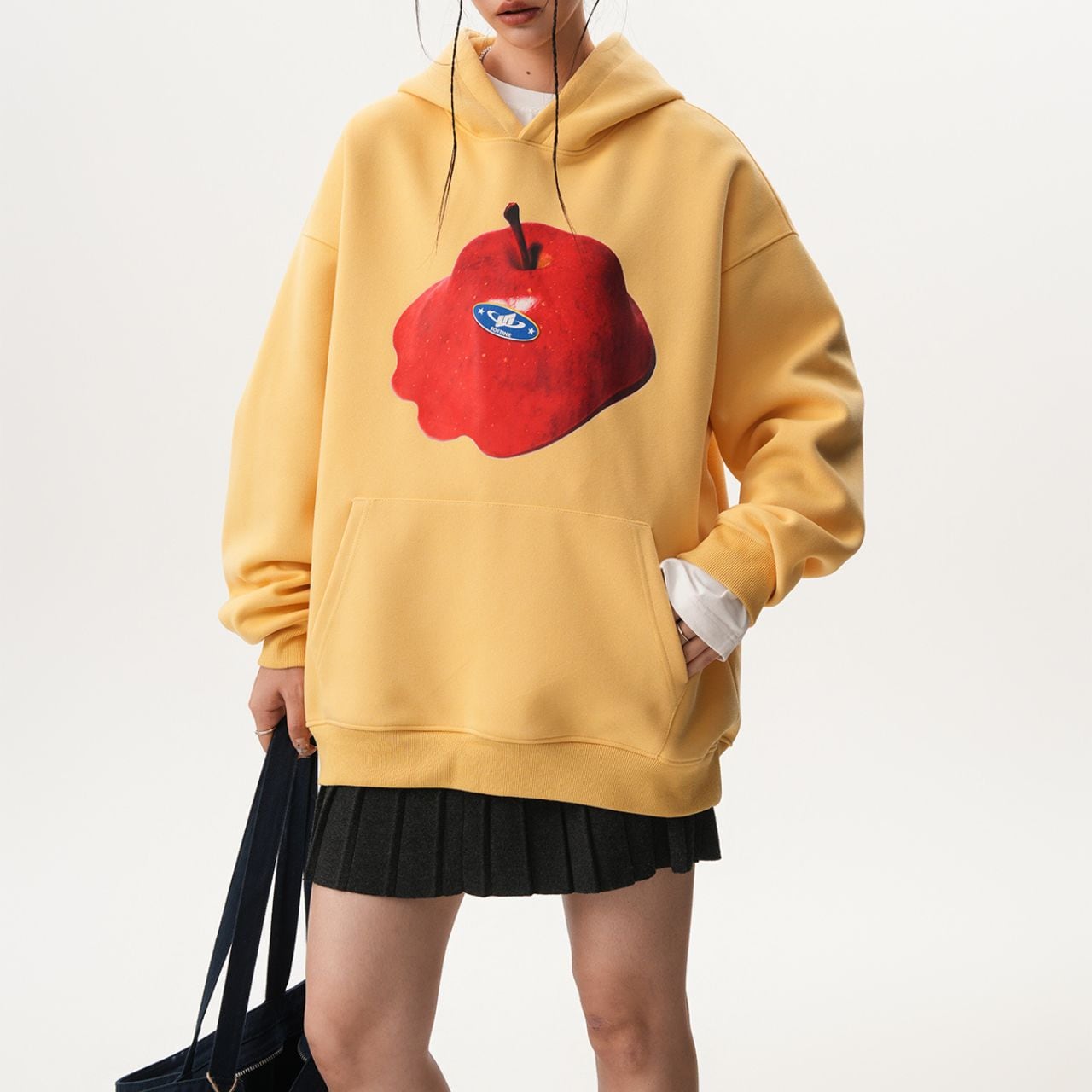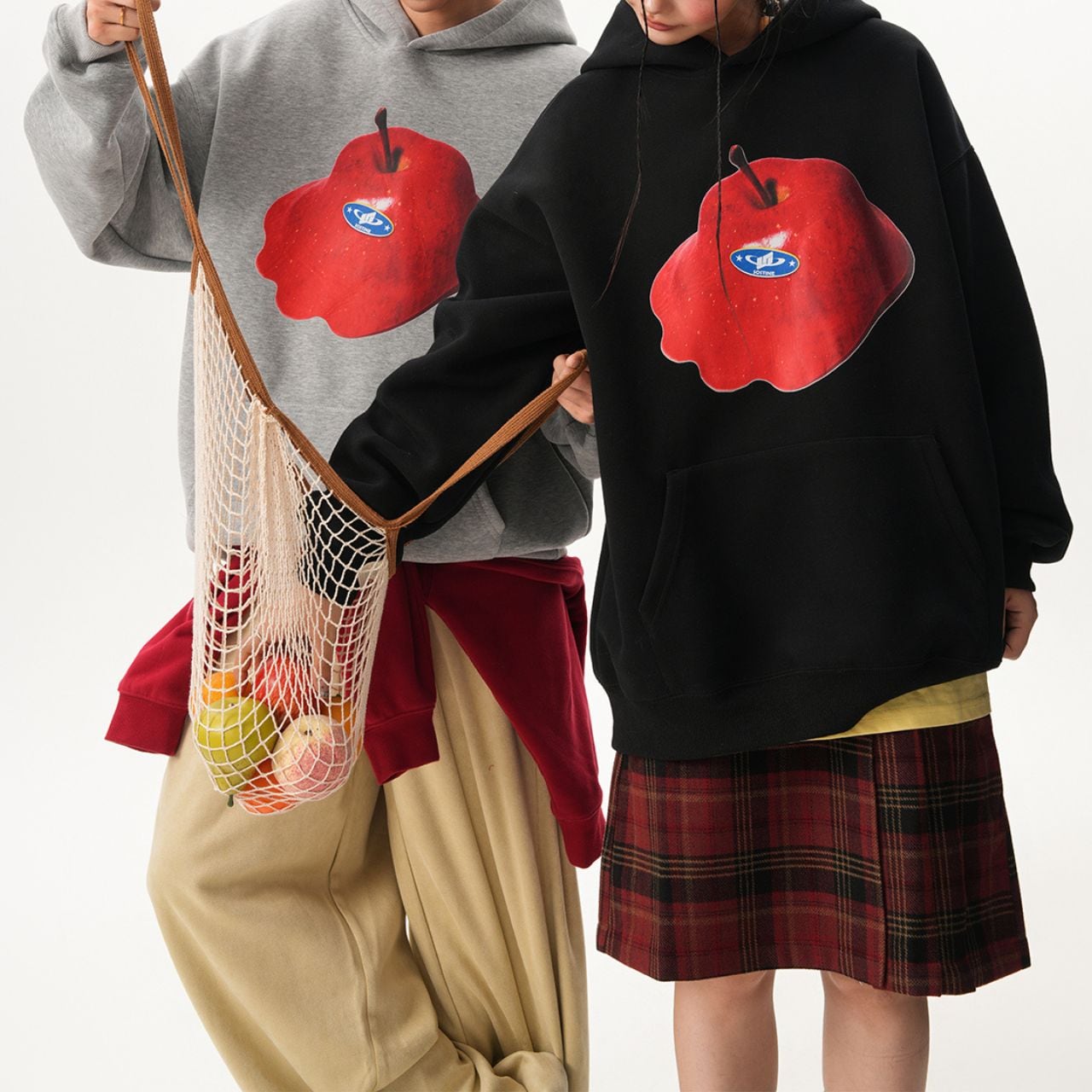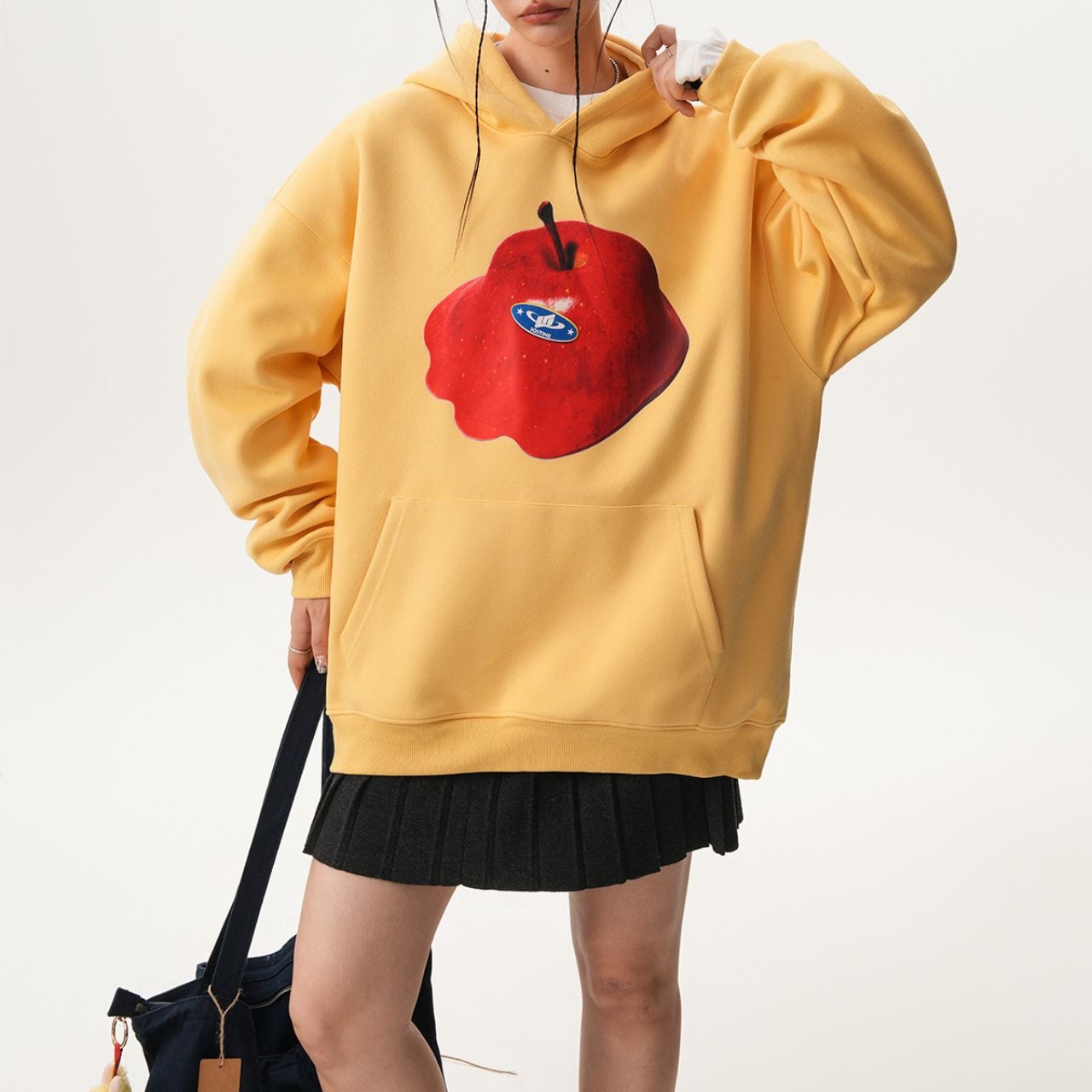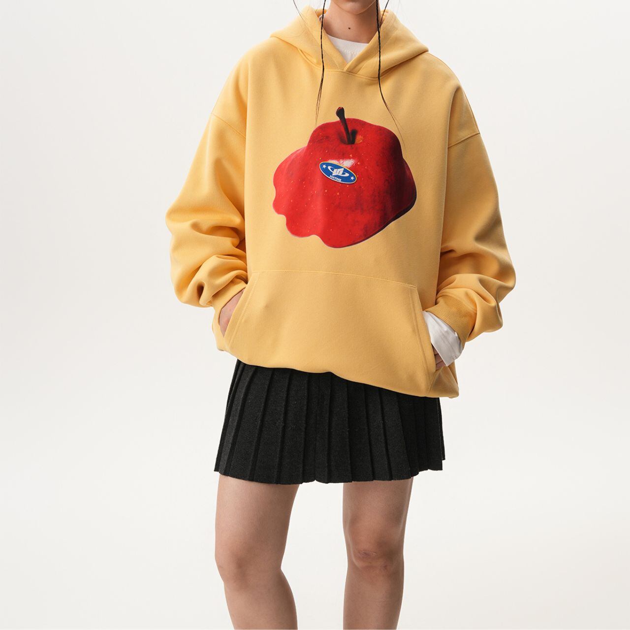大きなアップルプリントが視線を奪うユニークなデザイン。