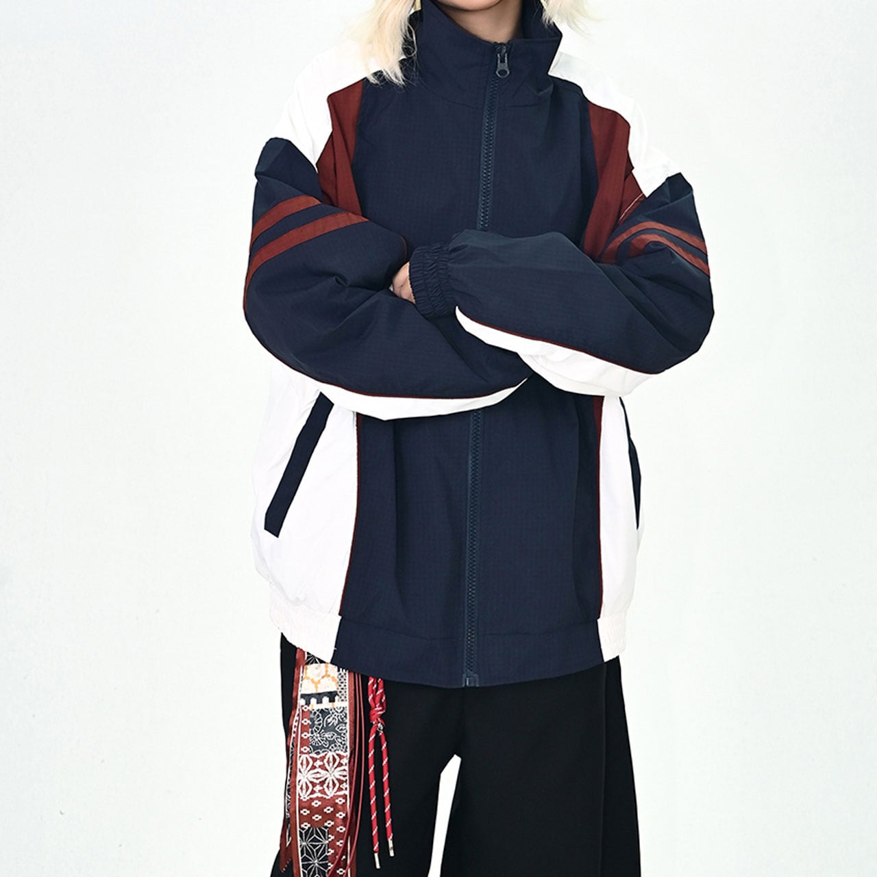 ネイビー×ホワイト×ボルドーの切り替えが映えるジップジャケット。