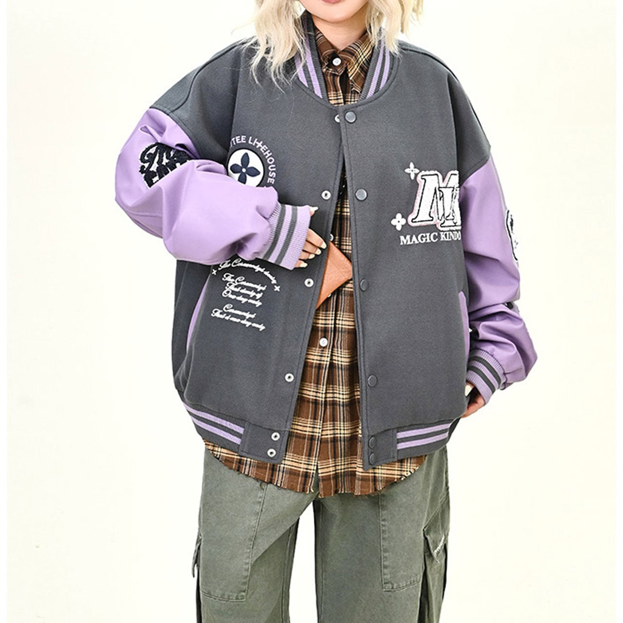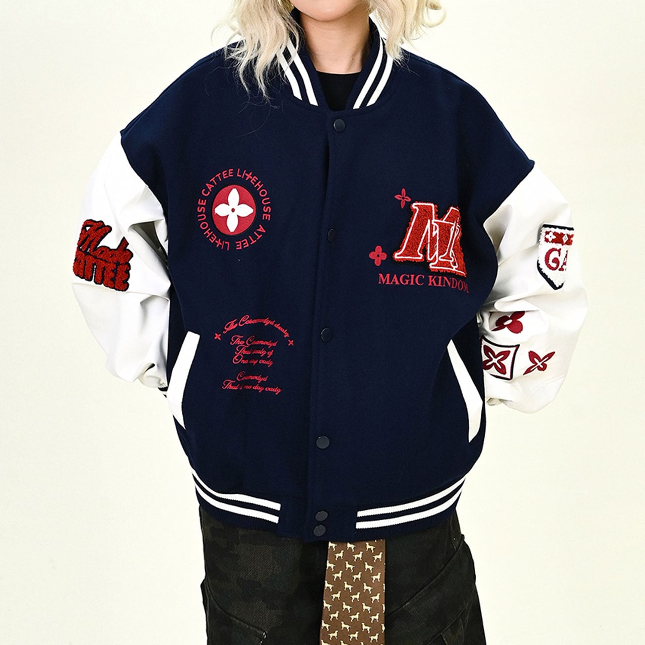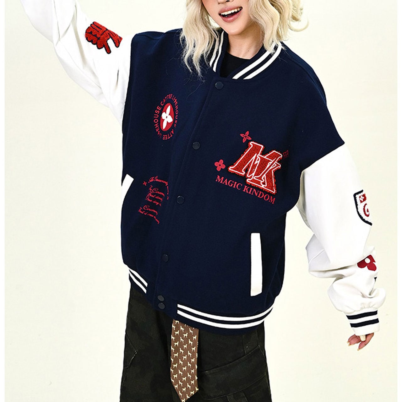 バイカラーの切り替えが映えるスタジャン風ブルゾン。