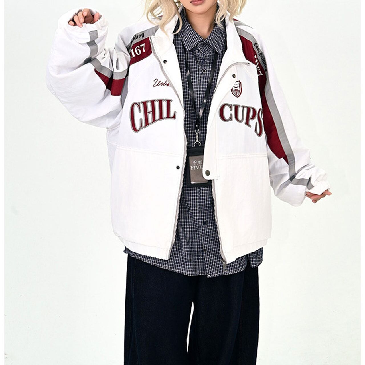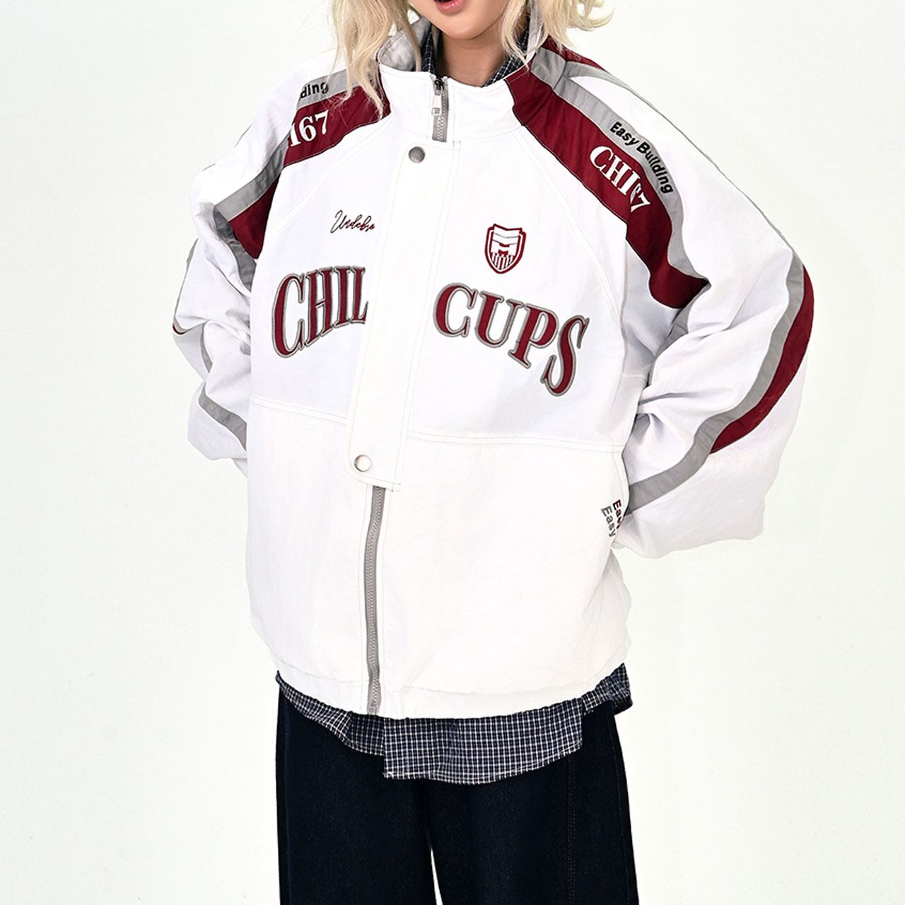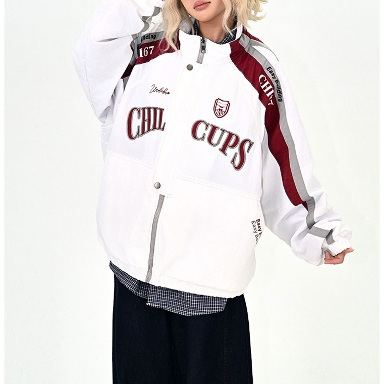 スポーティな配色と大胆なロゴが印象的なジップジャケット。