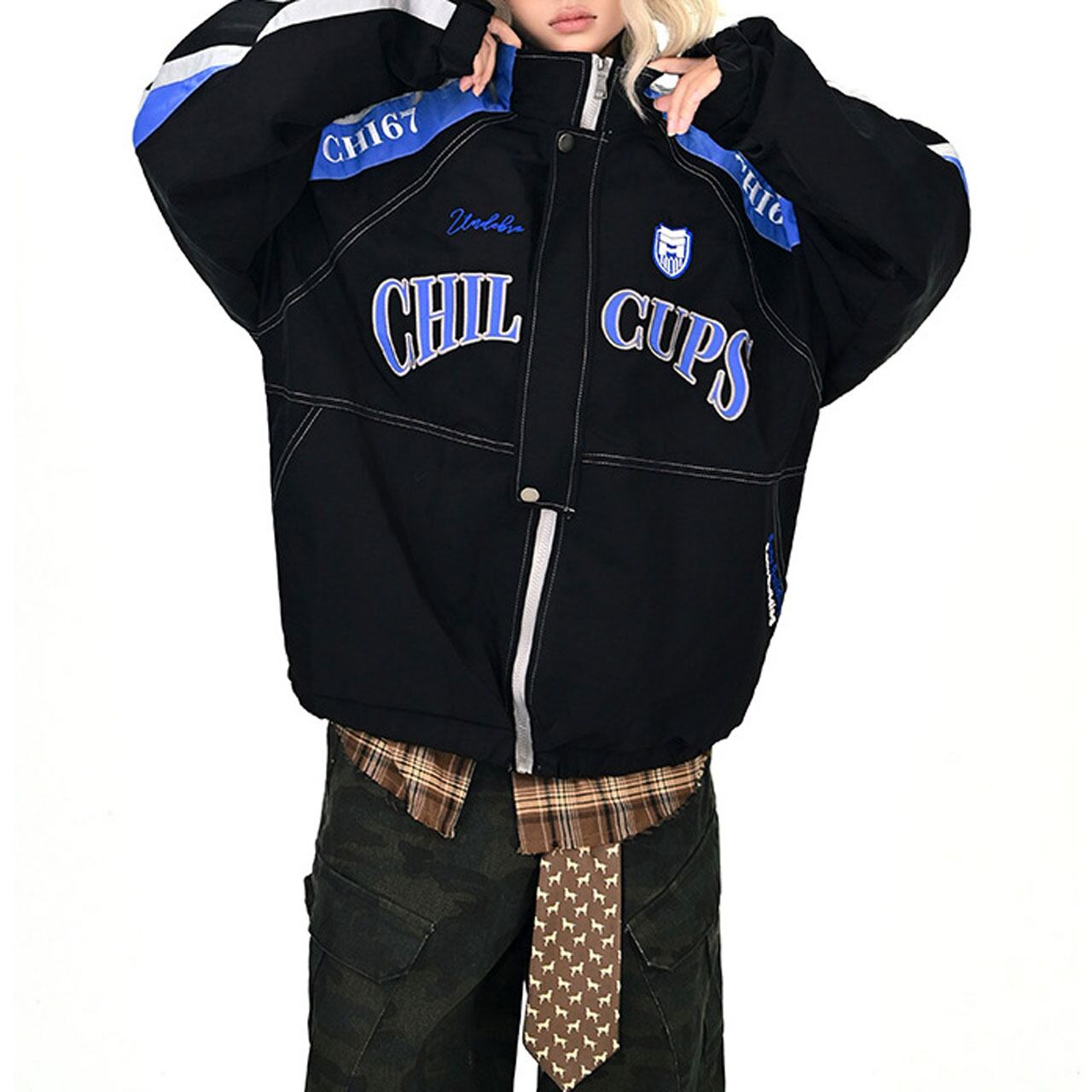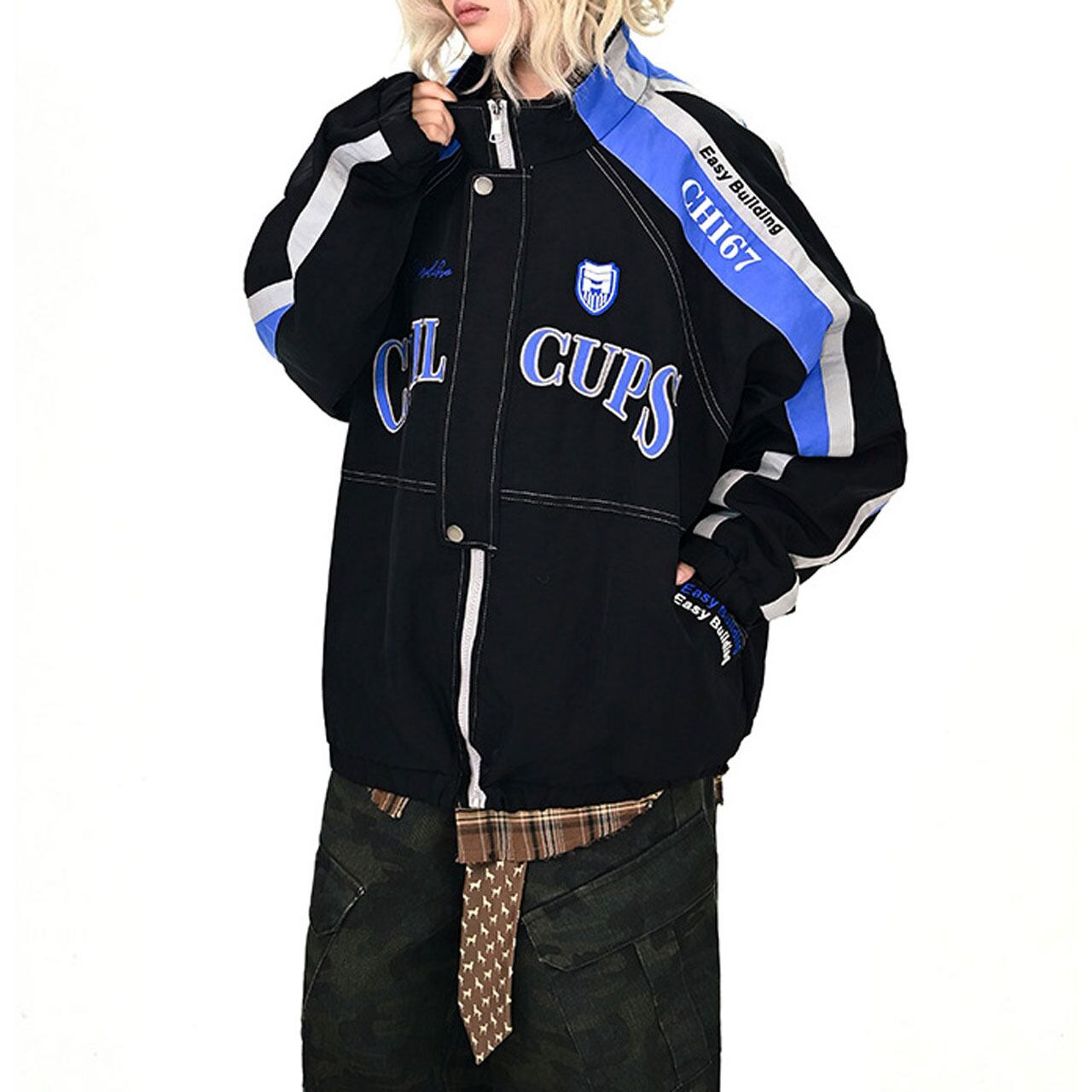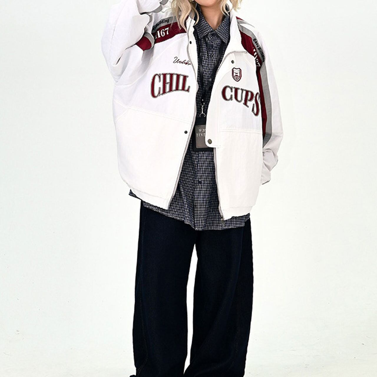 スポーティな配色と大胆なロゴが印象的なジップジャケット。