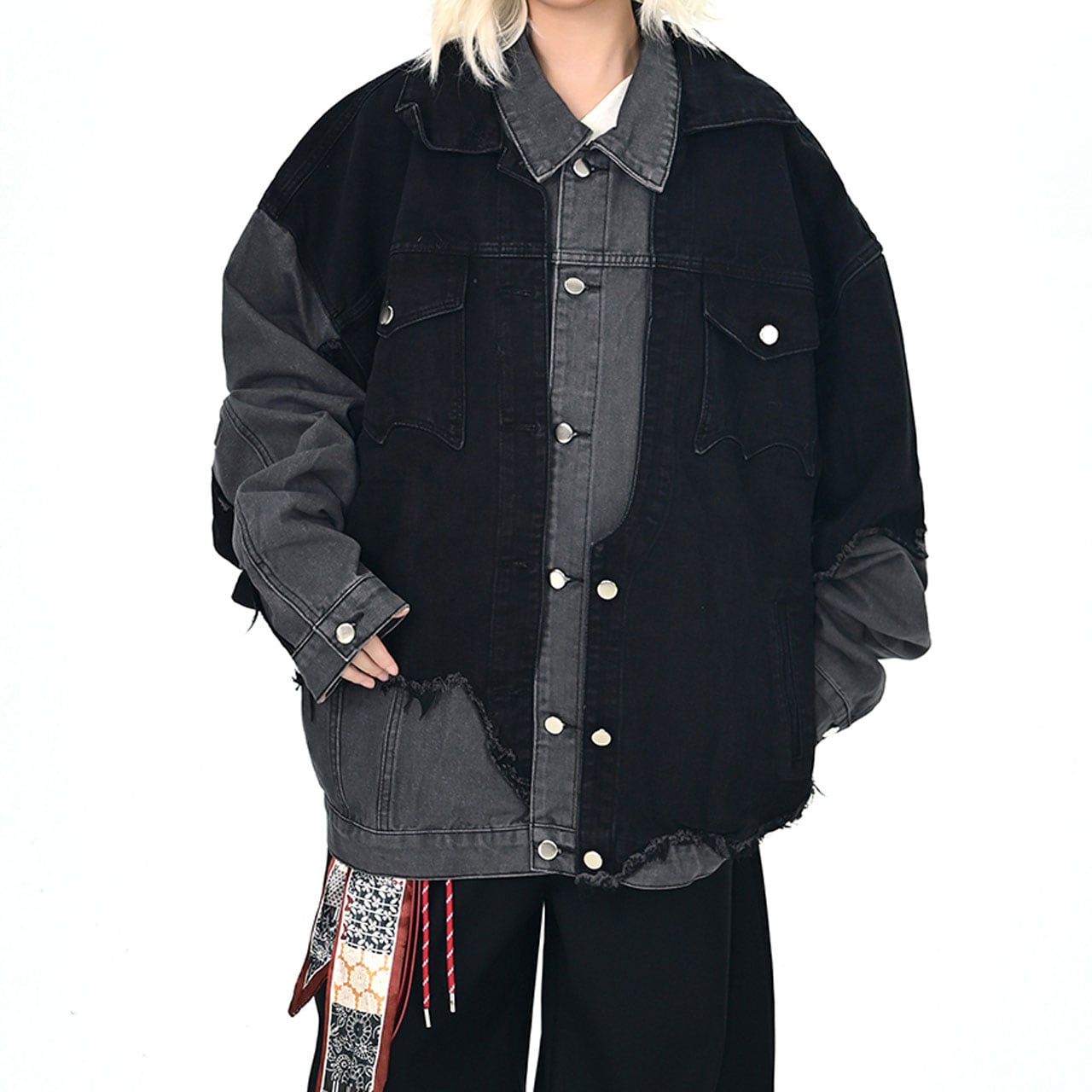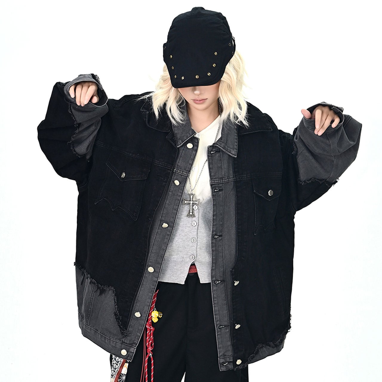大胆な切り替えデザインとバックロゴが際立つデニムジャケット。
