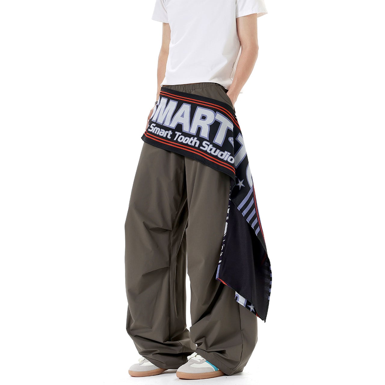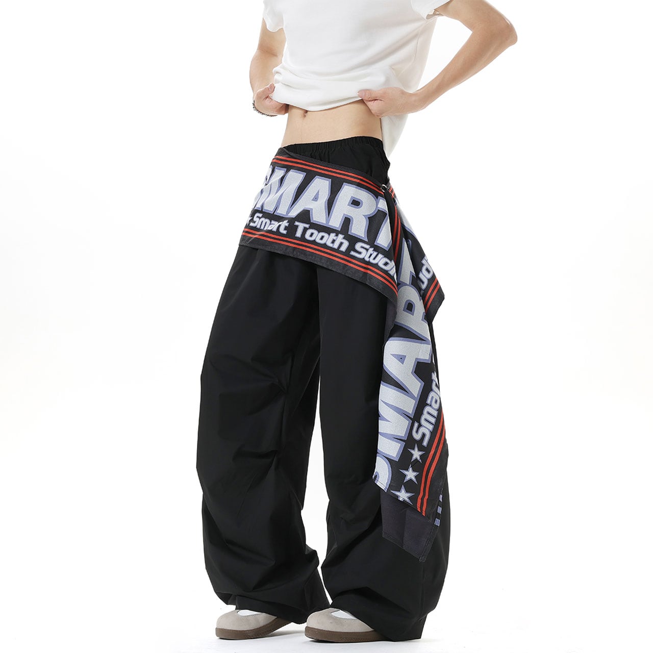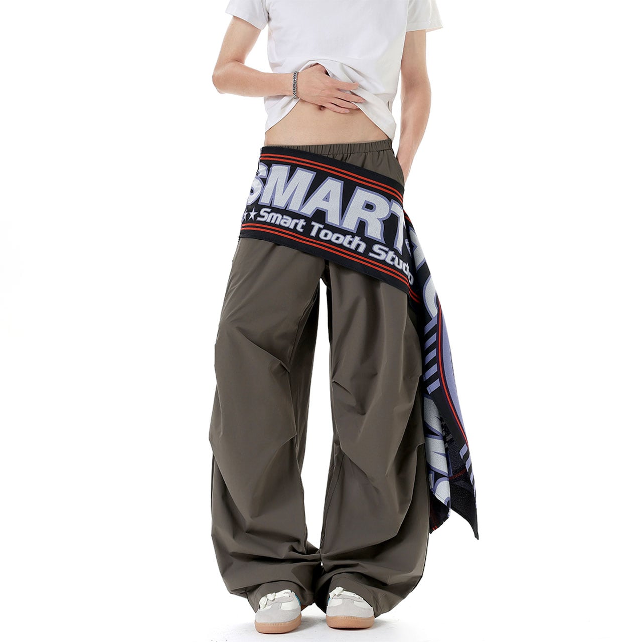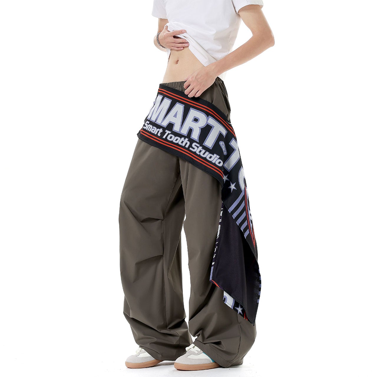 ウエストに巻き付いたビッグロゴ布が視線を奪うデザイン。