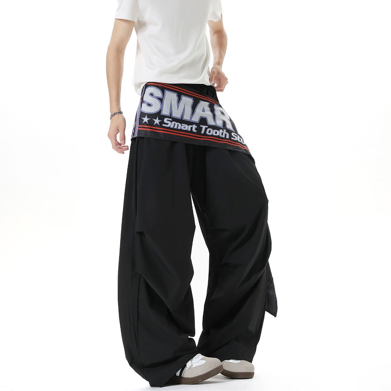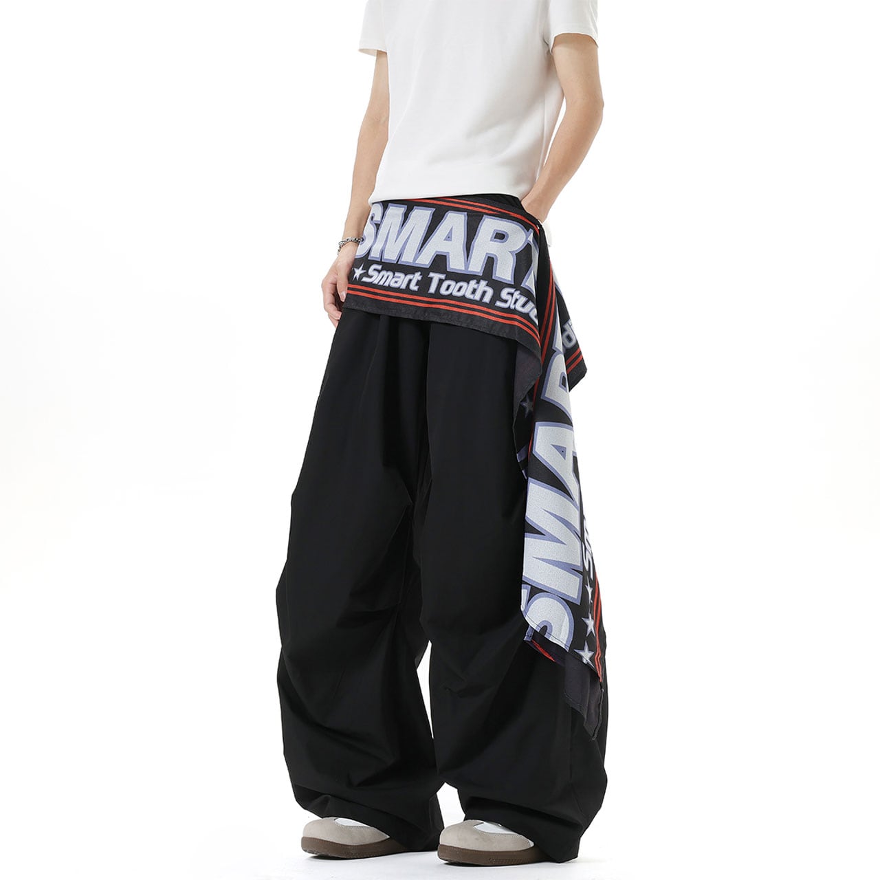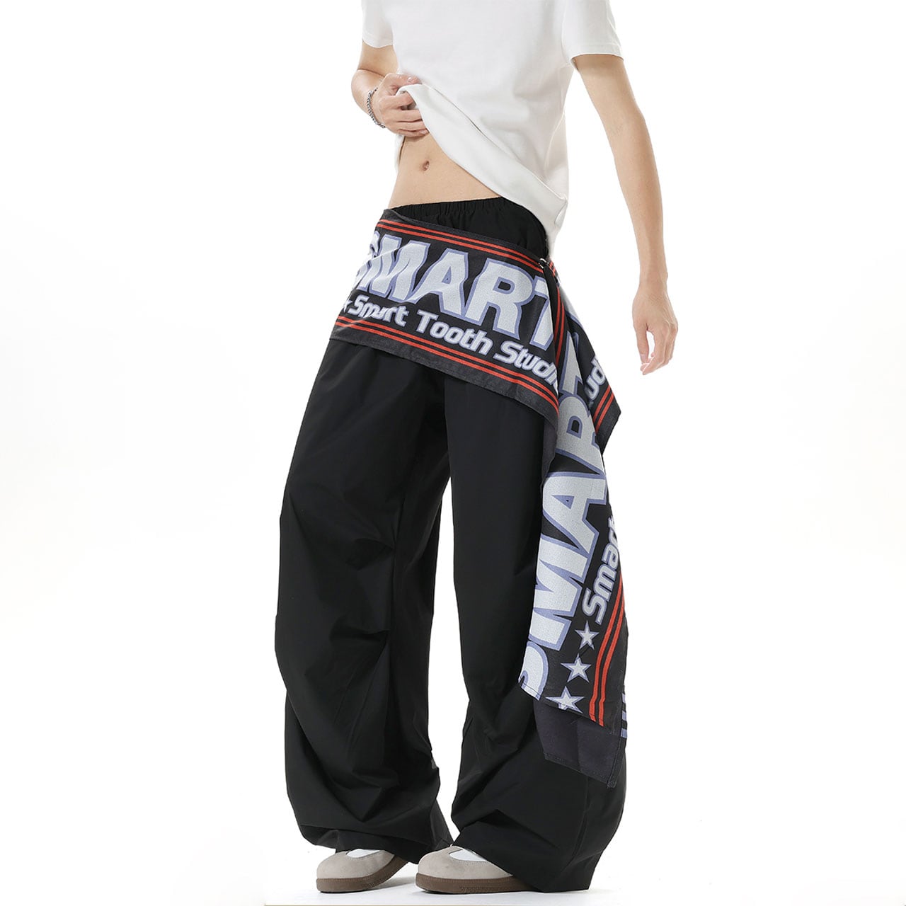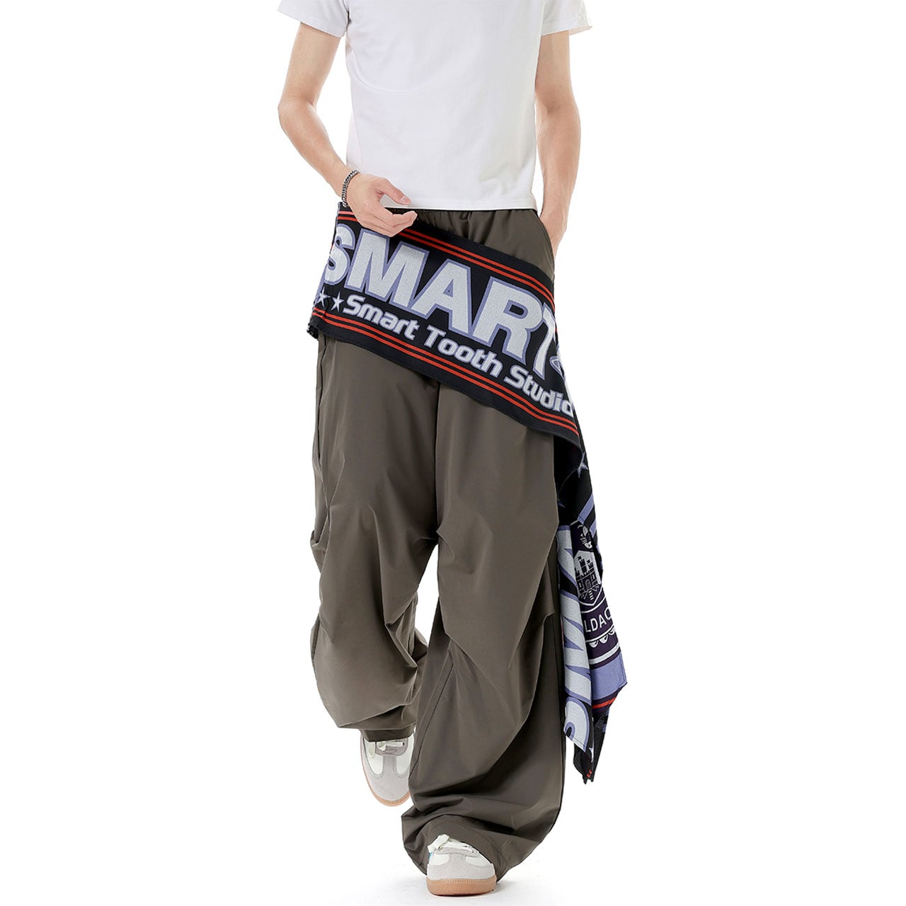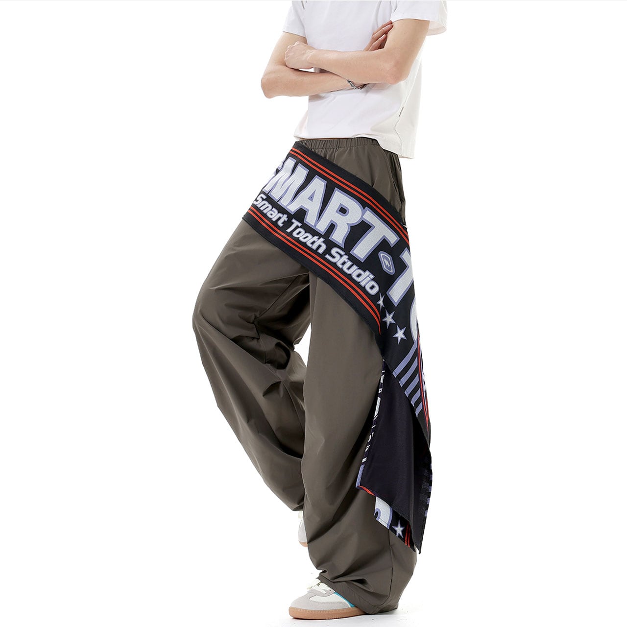 ウエストに巻き付いたビッグロゴ布が視線を奪うデザイン。