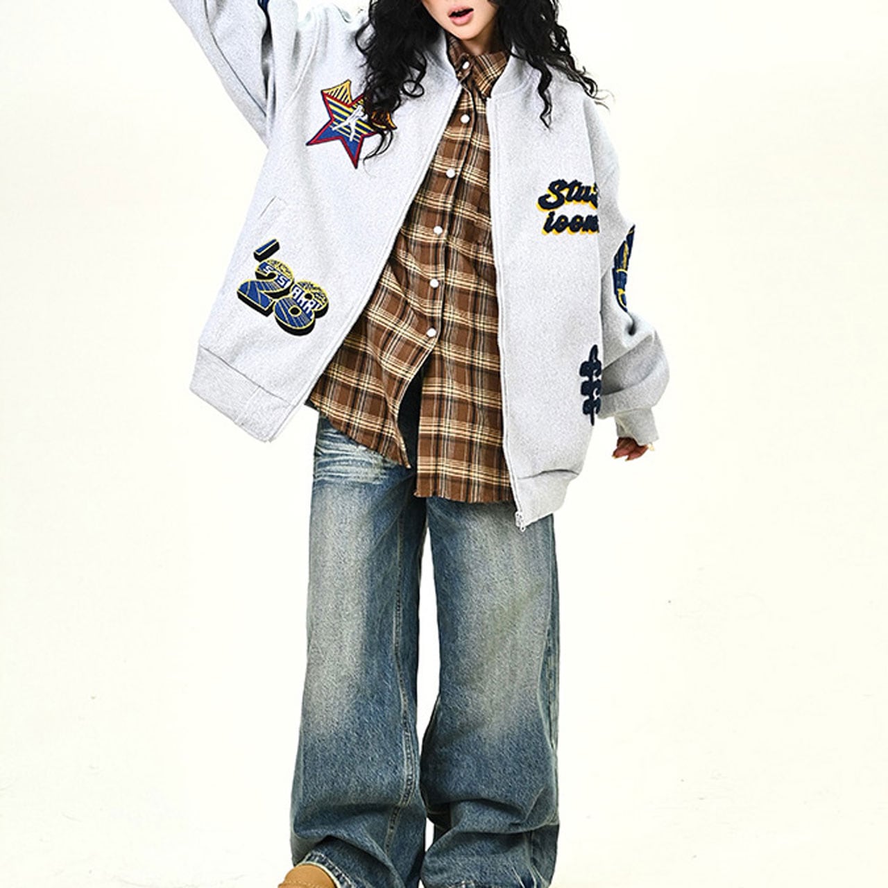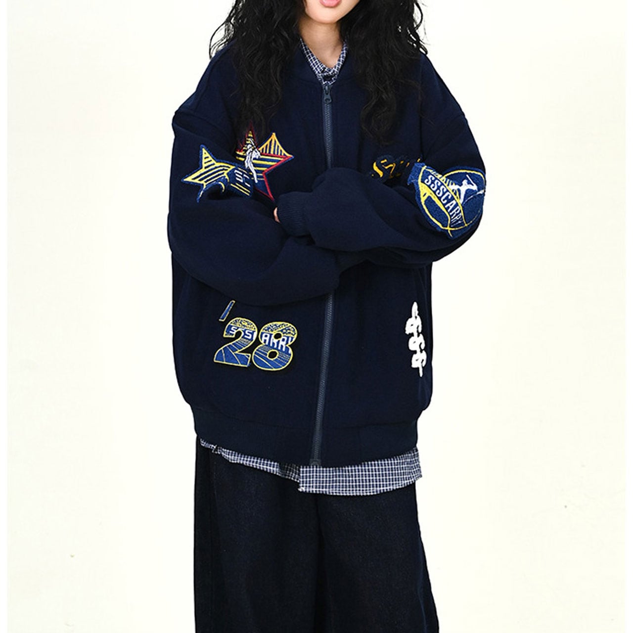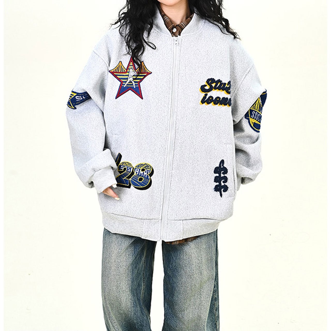 大胆なスターとレタリング刺繍が存在感を放つジップジャケット。