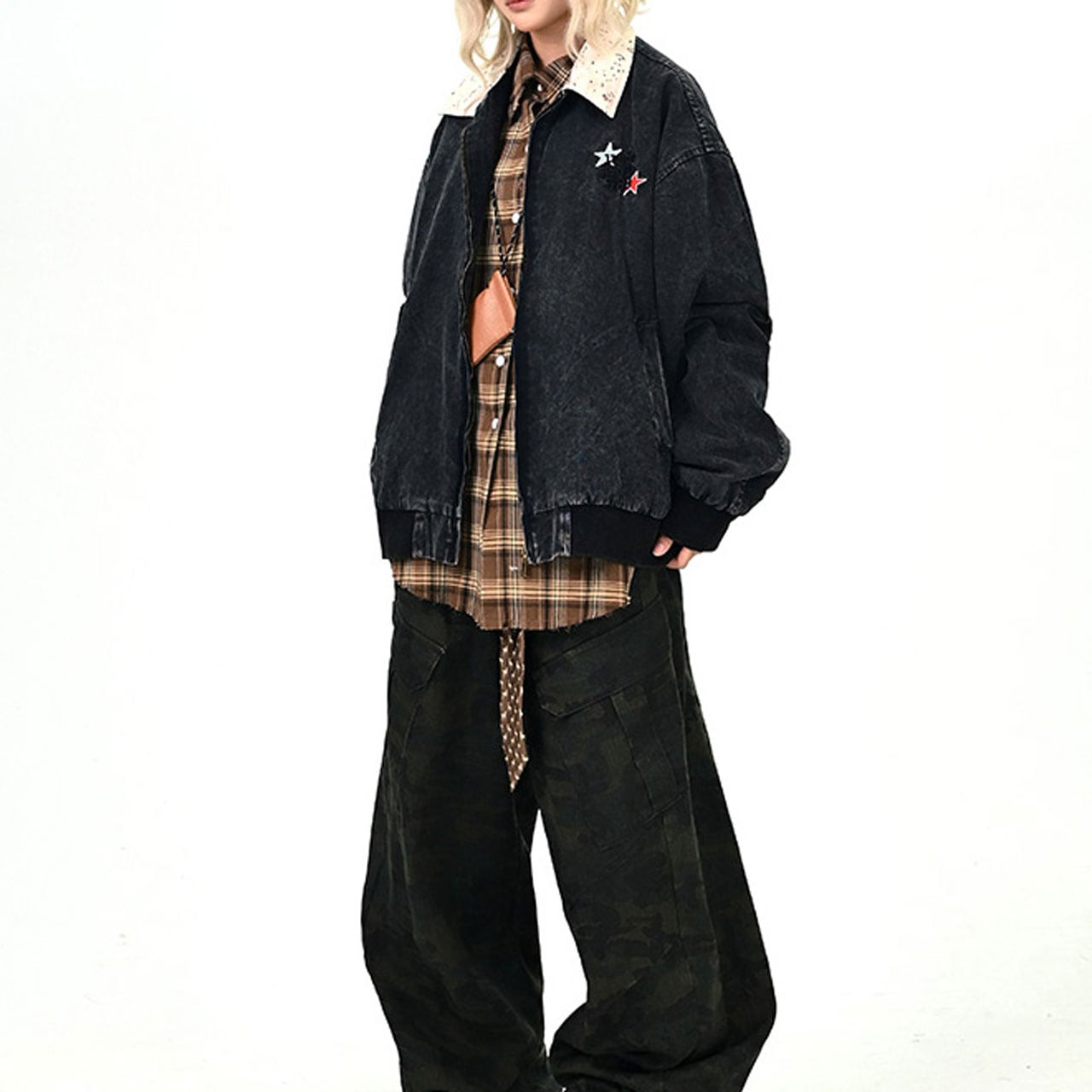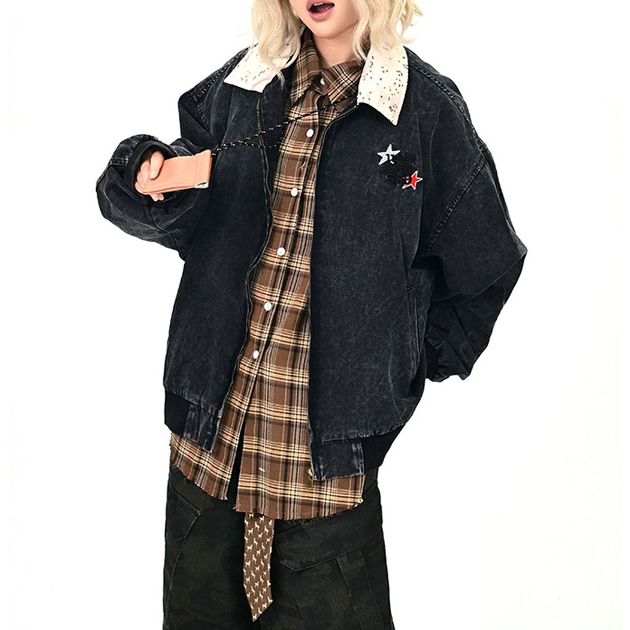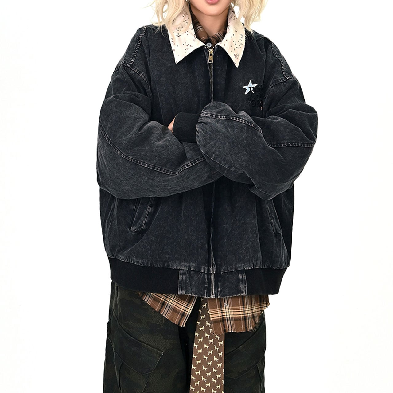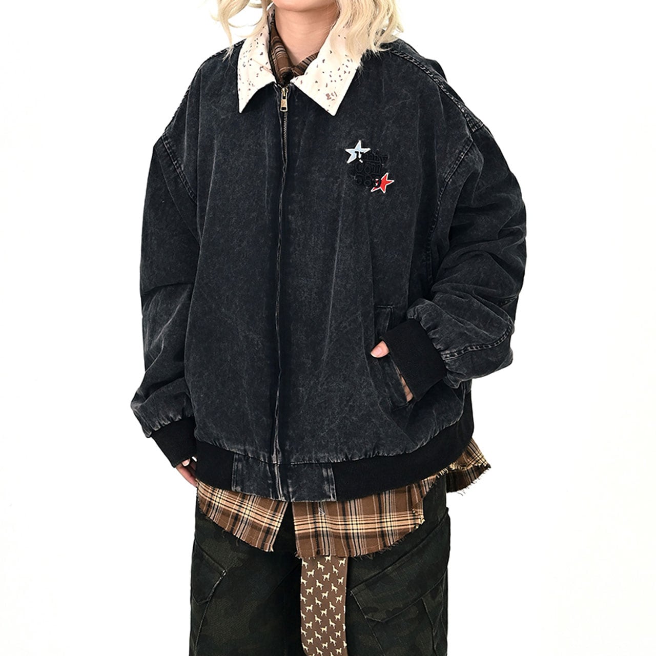 ウォッシュ感のあるブラックボディに、星モチーフを散りばめたジップジャケット。