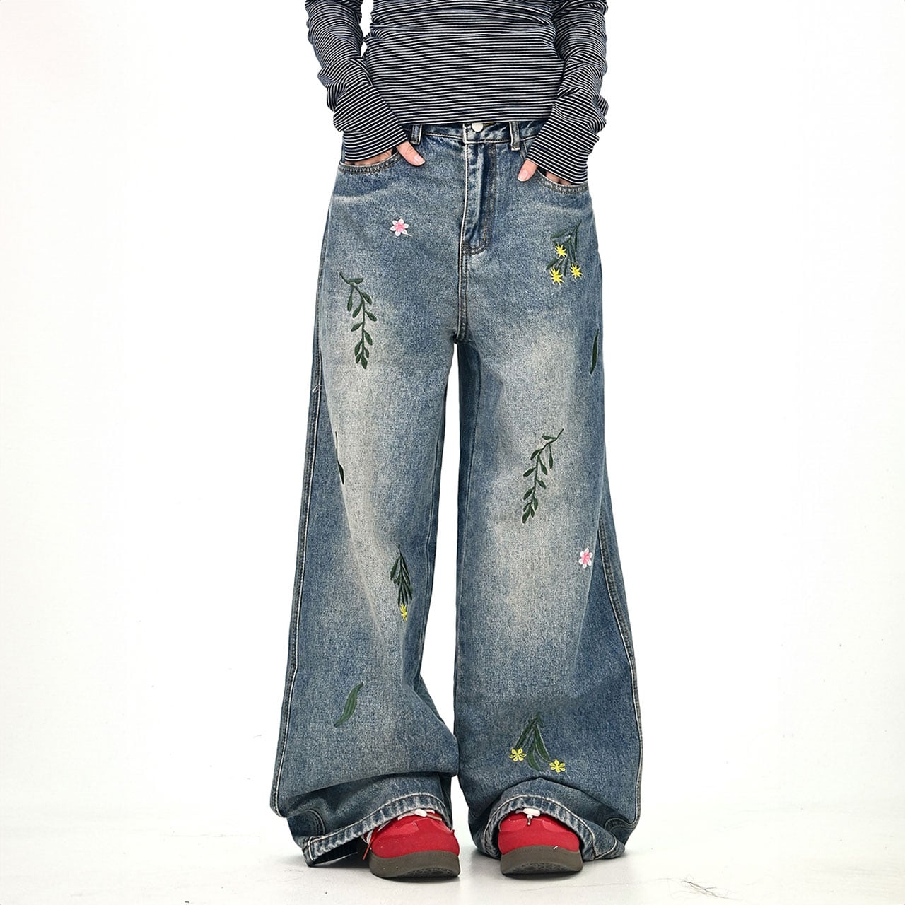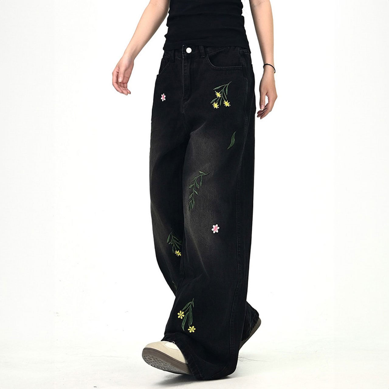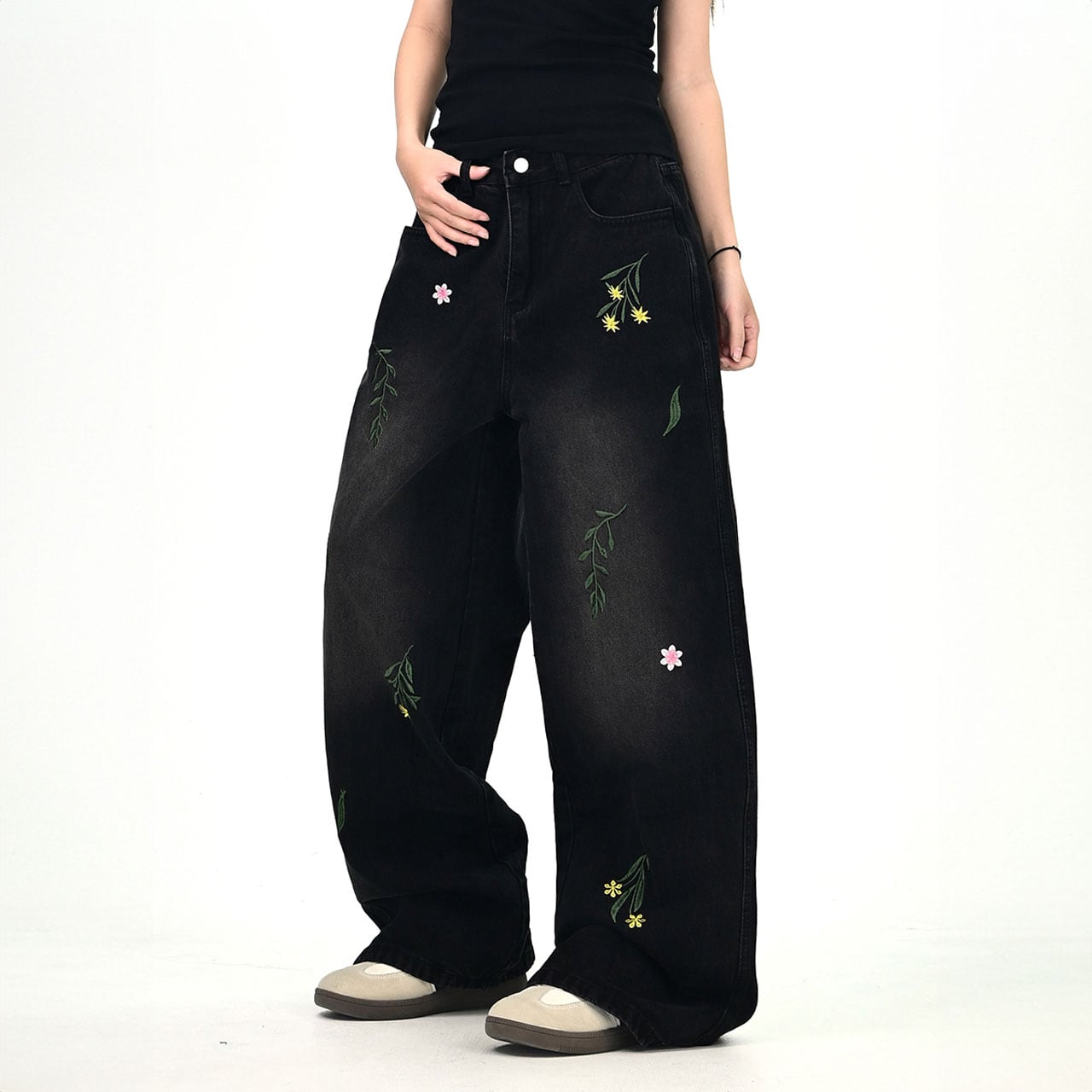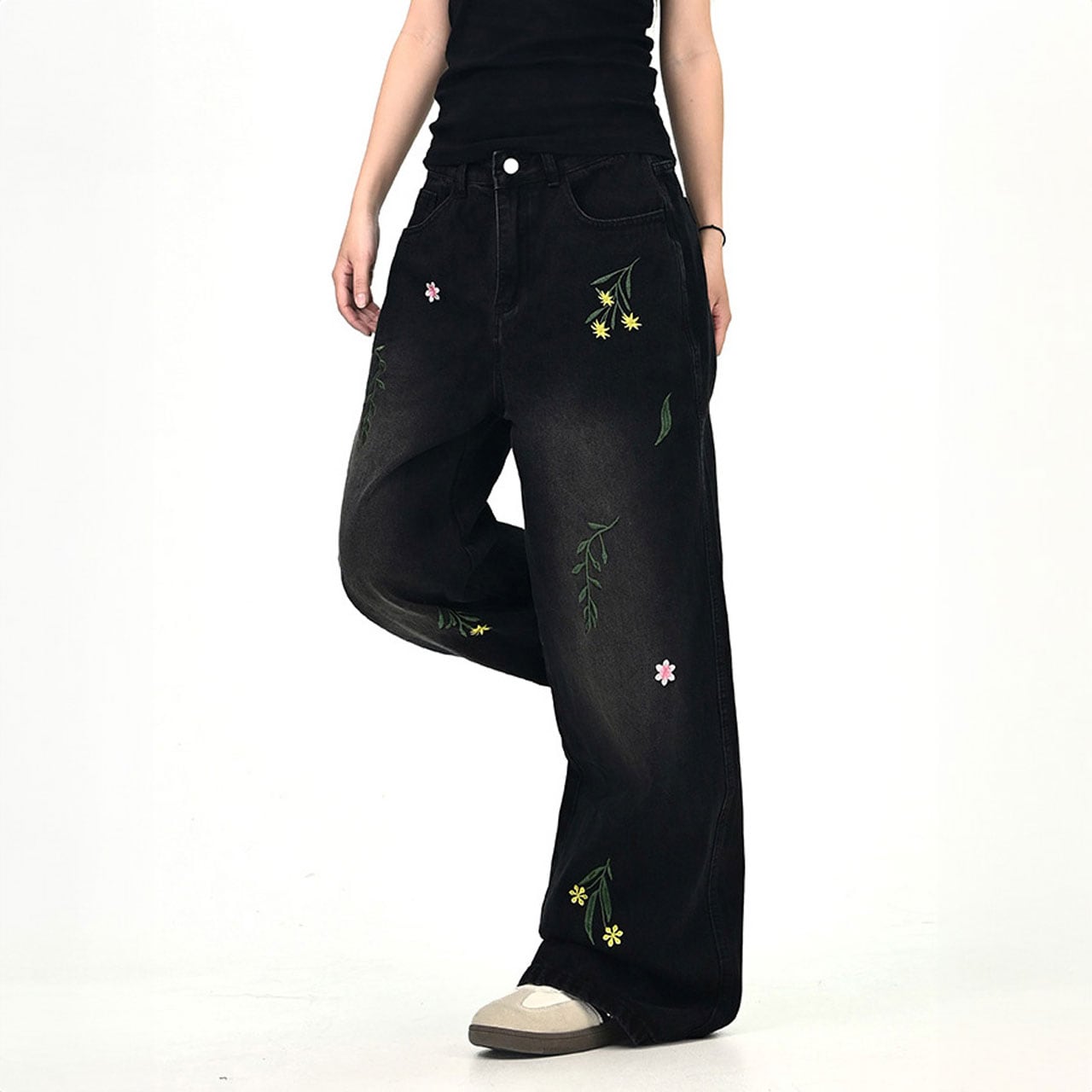 フラワーリーフステッチデニムパンツ 2col R01020