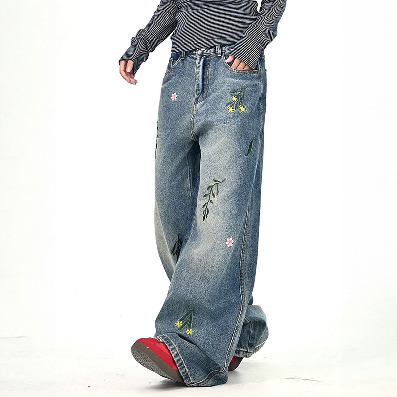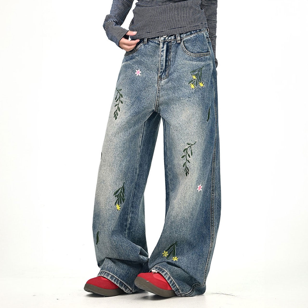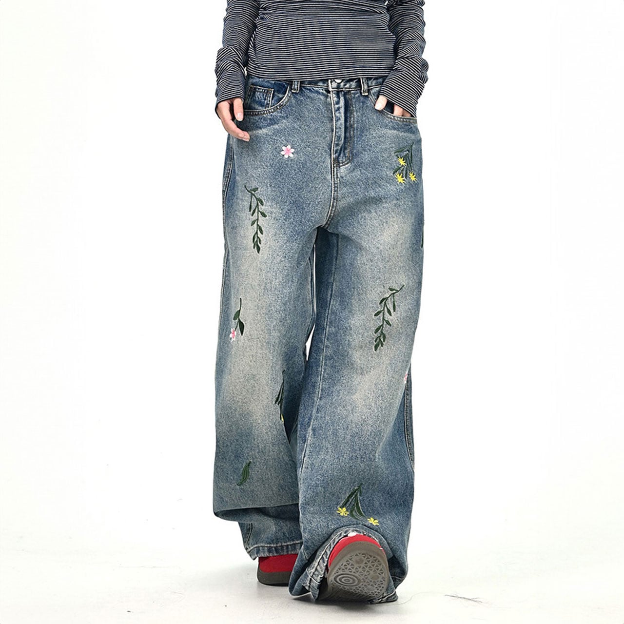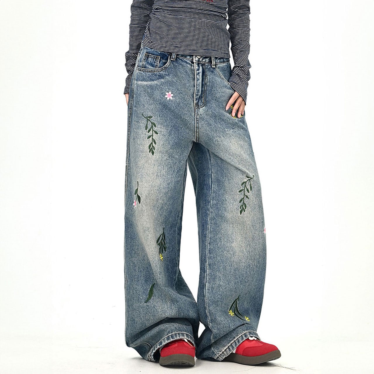 フラワーリーフステッチデニムパンツ 2col R01020