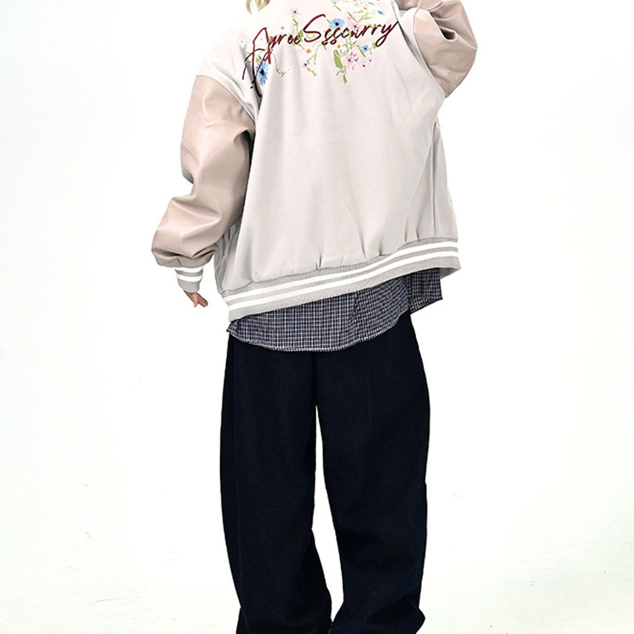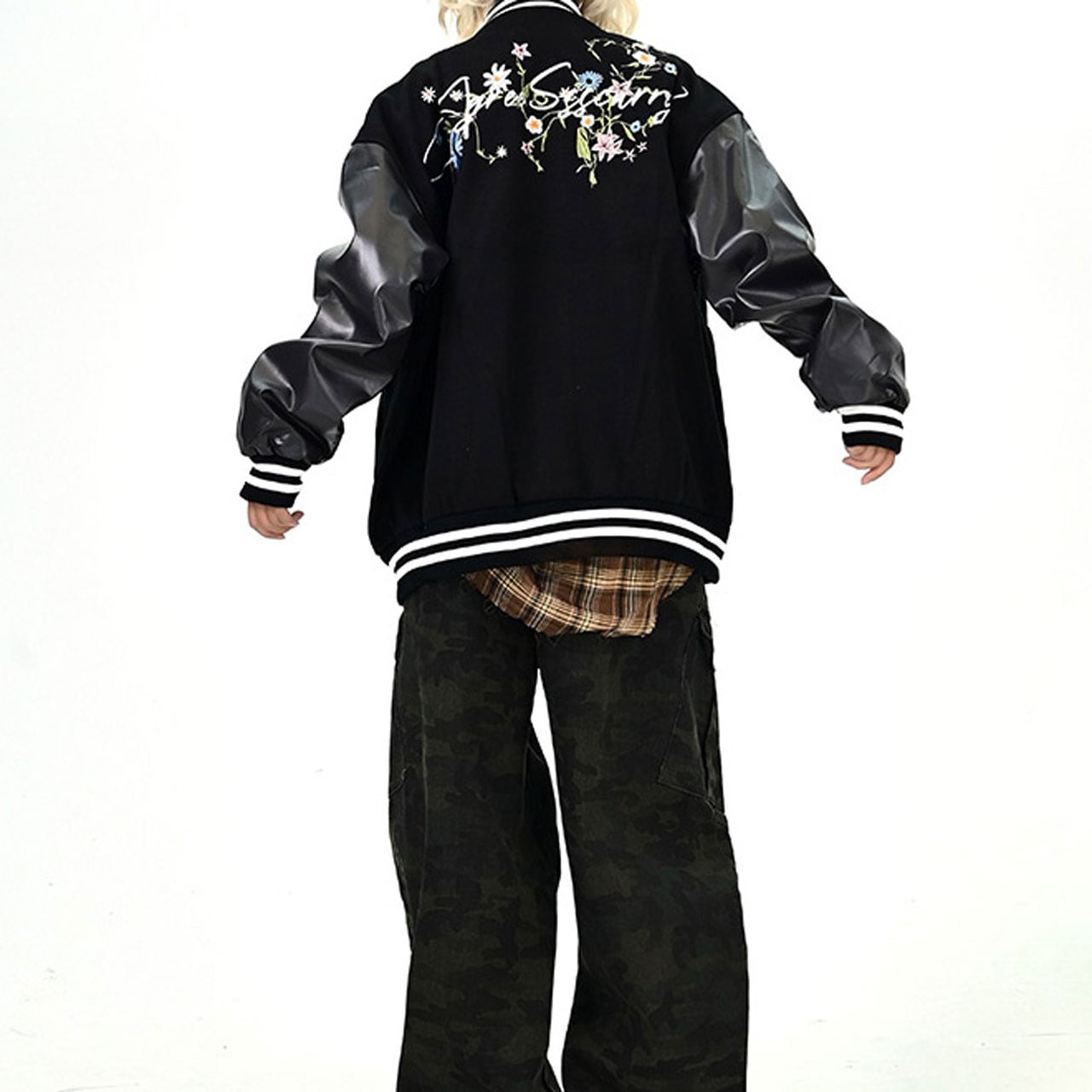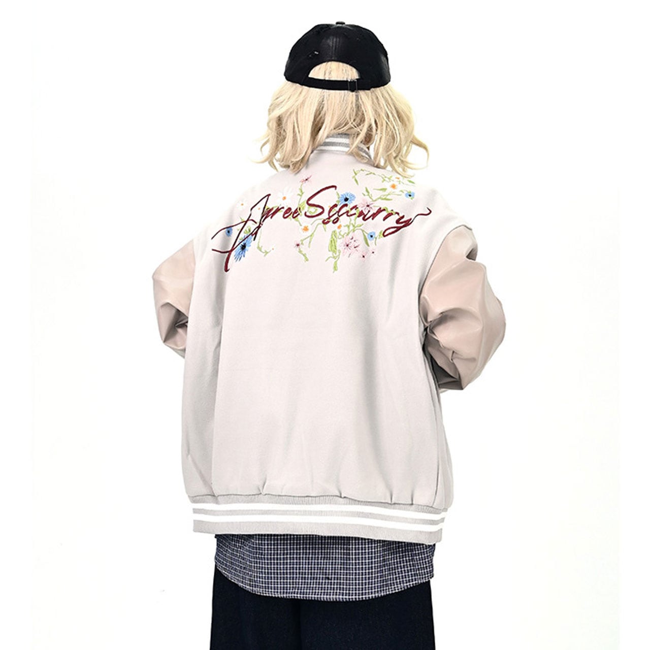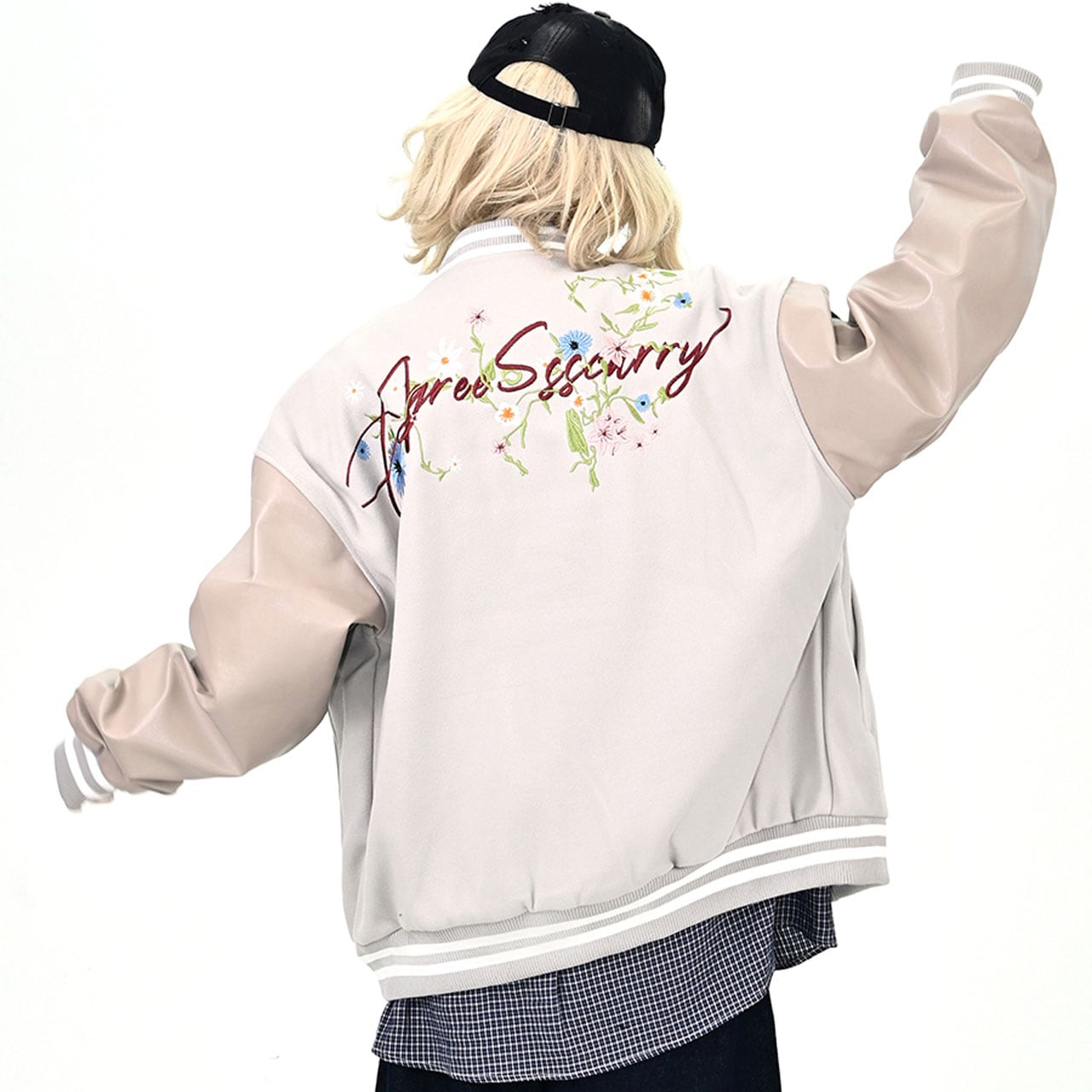 背中の花刺繍と筆記体ロゴが印象的なデザイン。