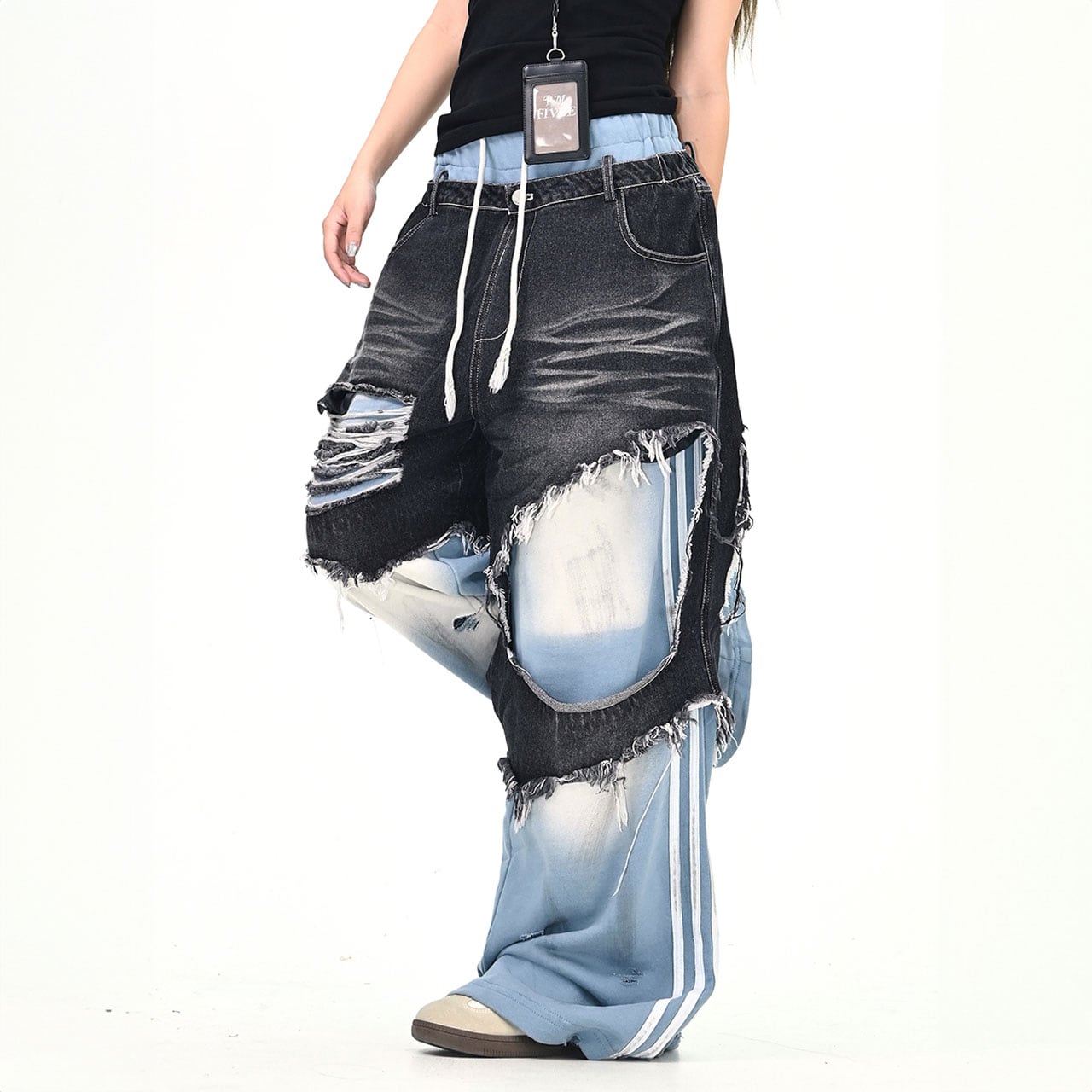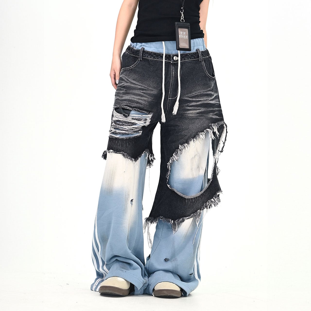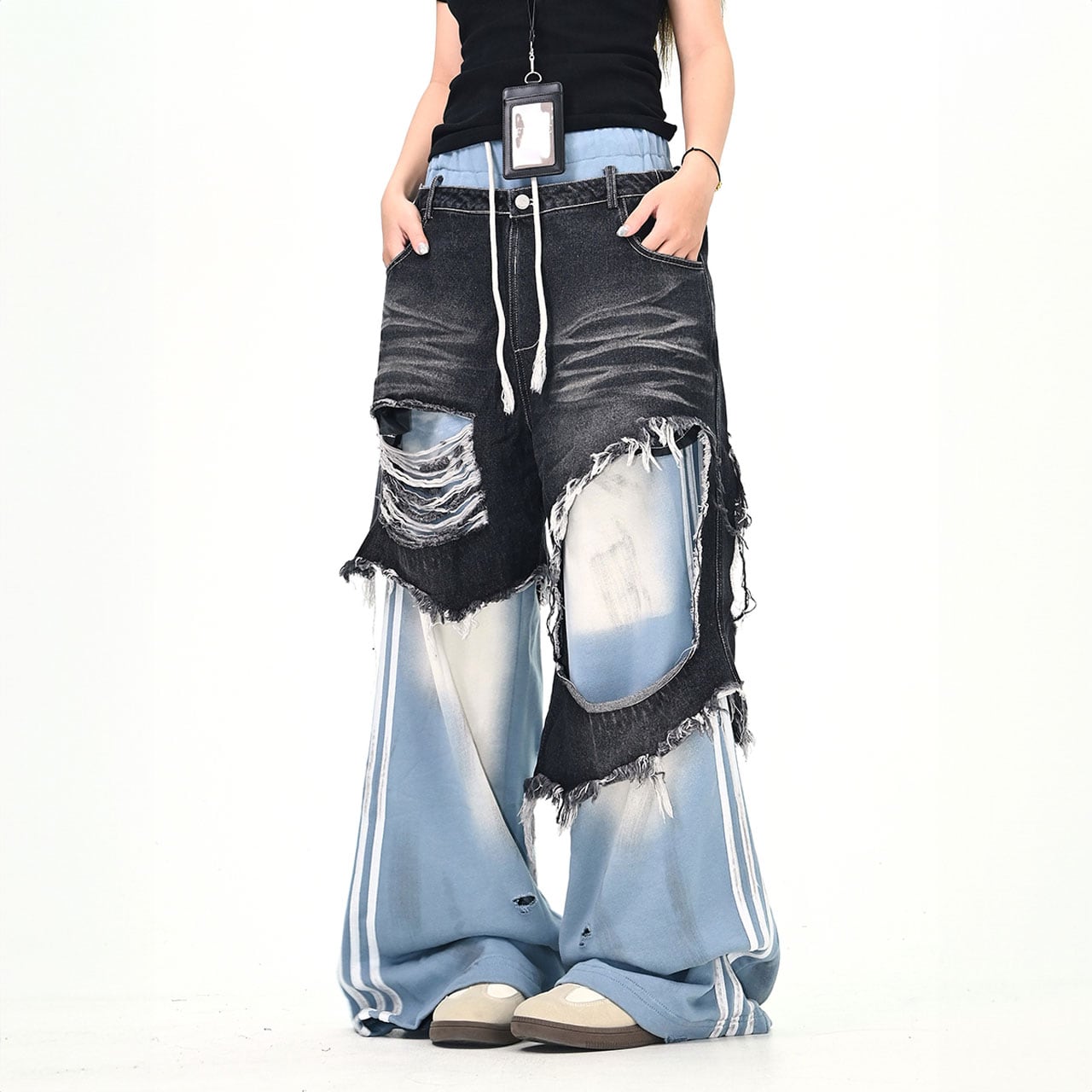 大胆なダメージと異素材切替が特徴のデザインパンツ。