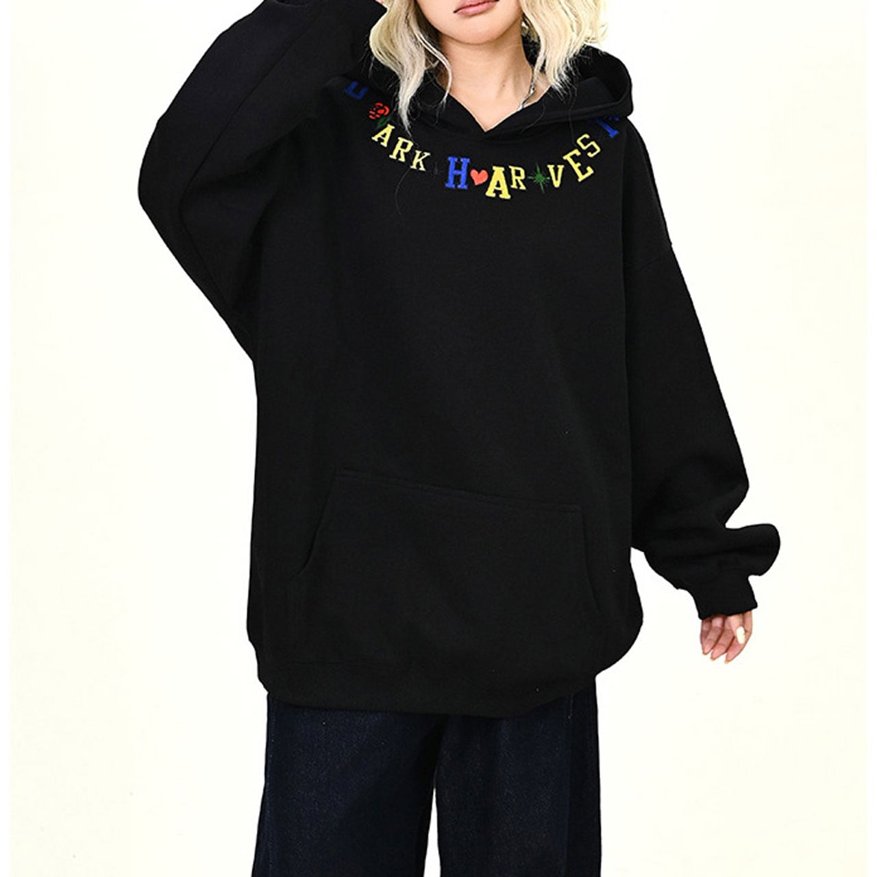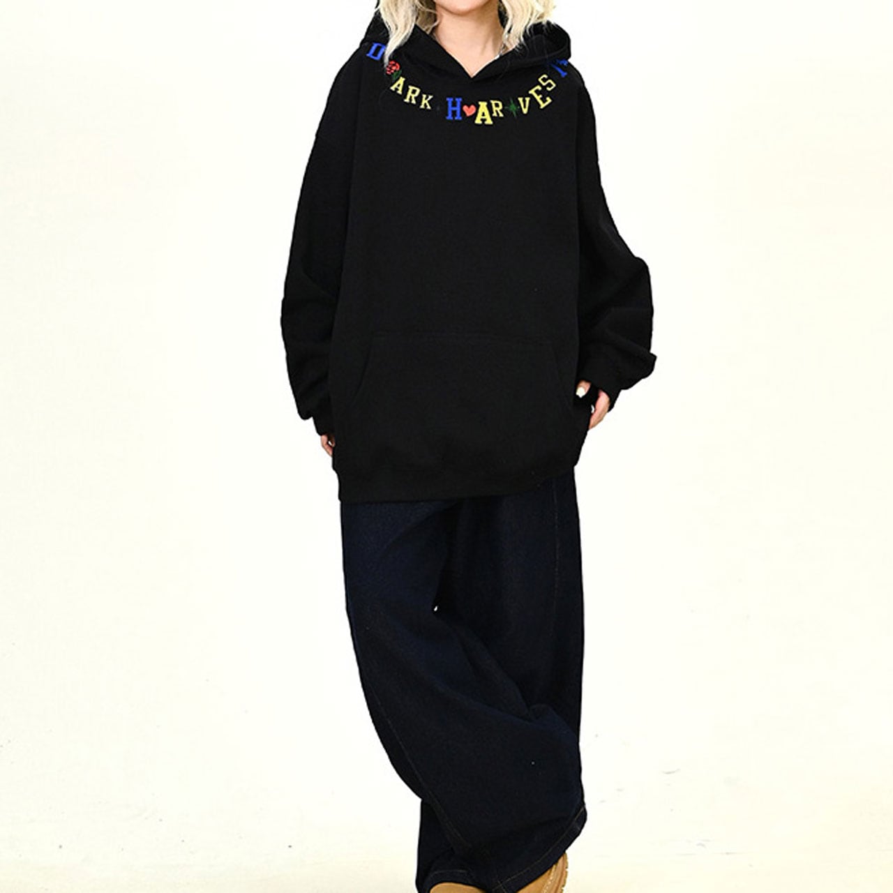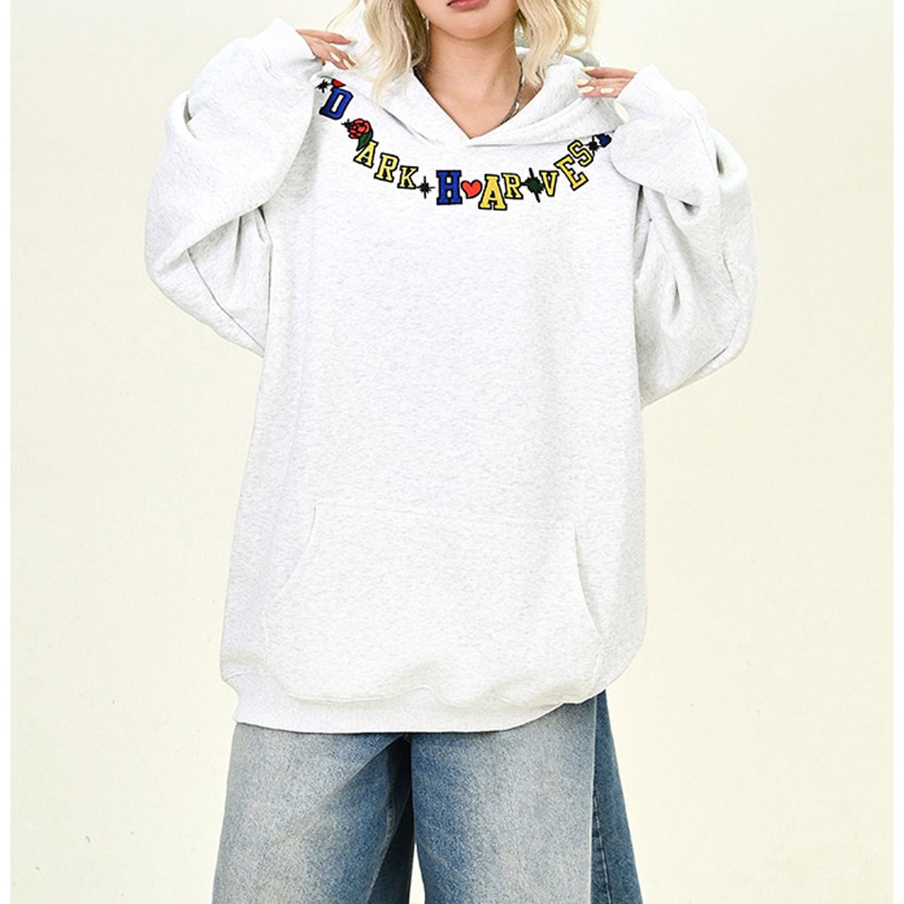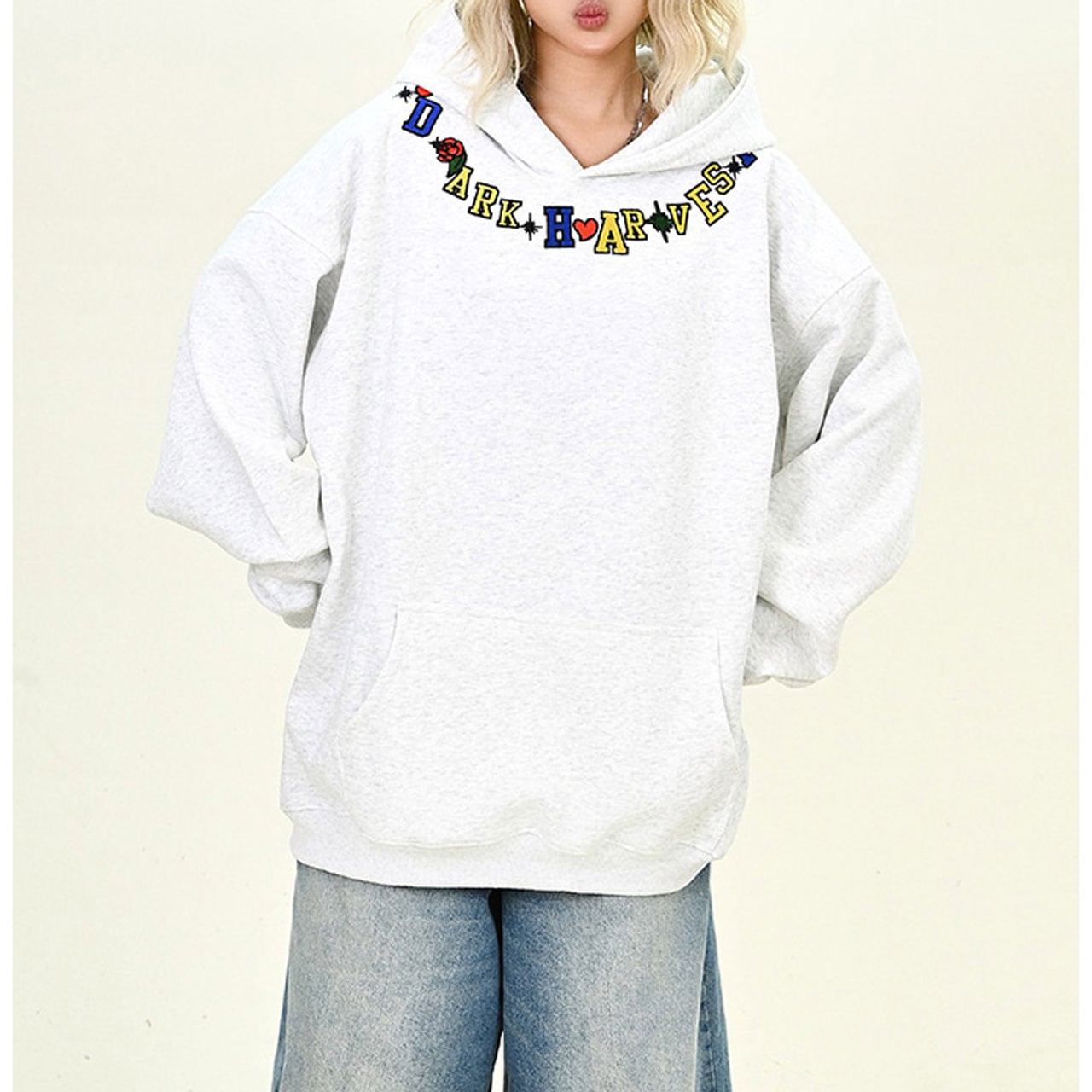 カラフルな刺繍ロゴが目を引くストリートフーディ。