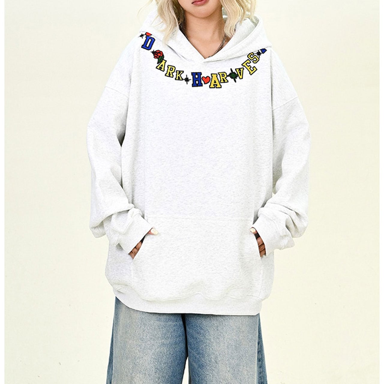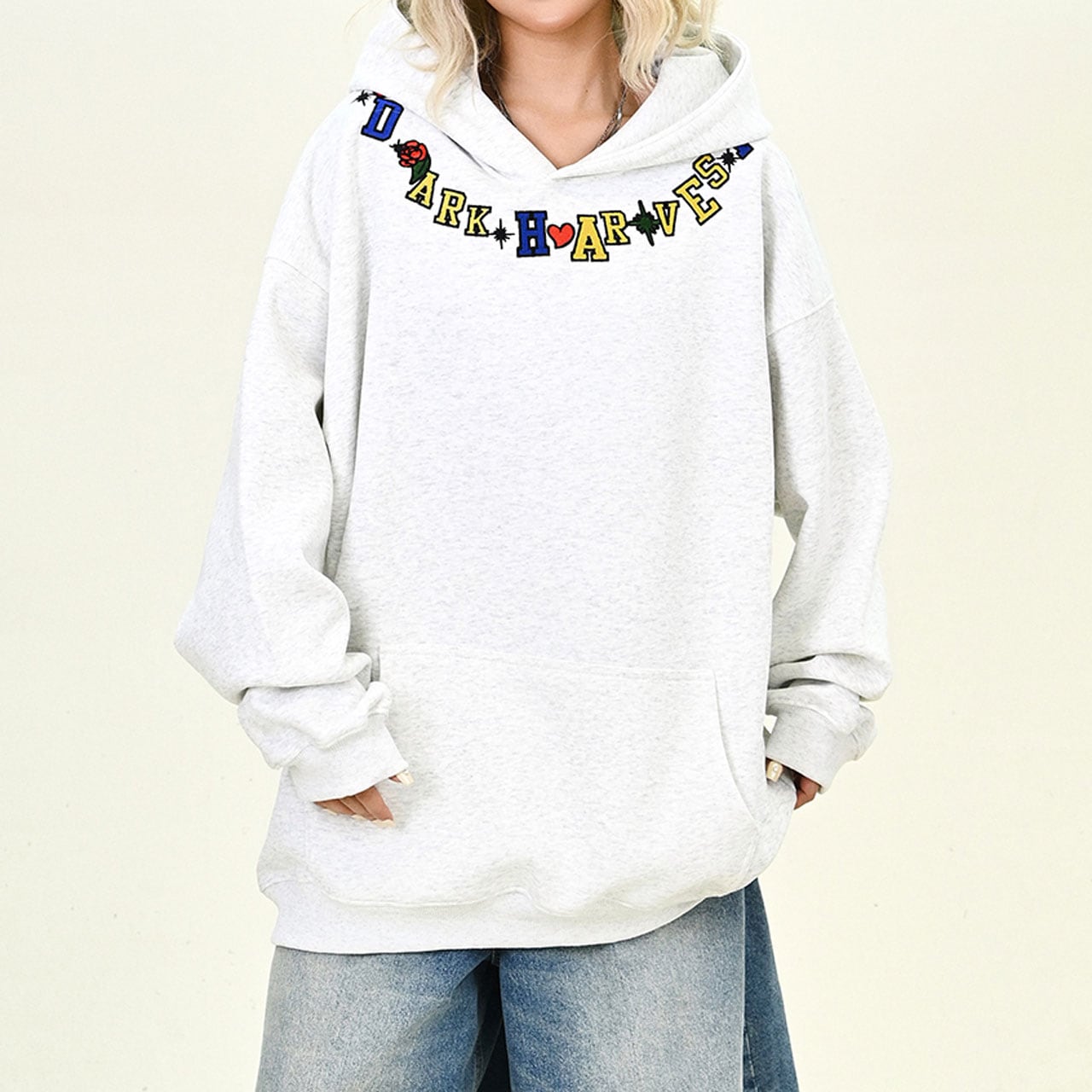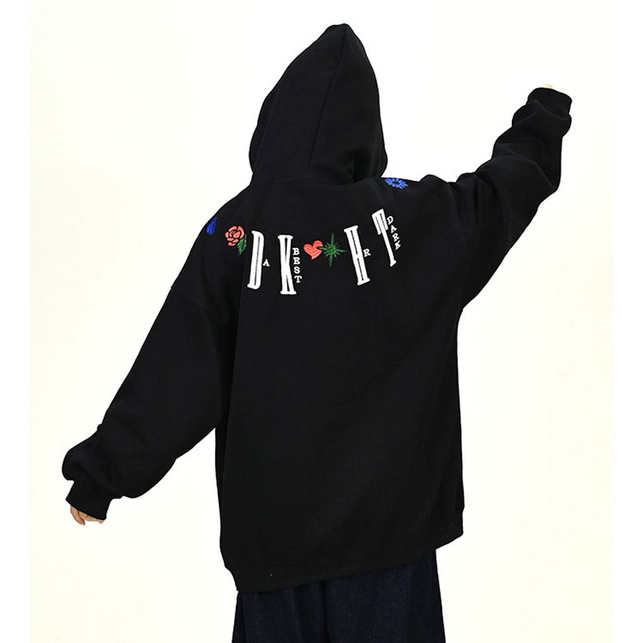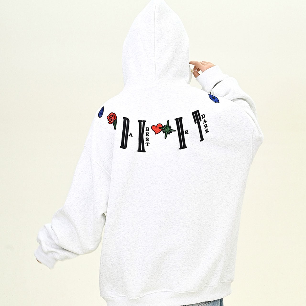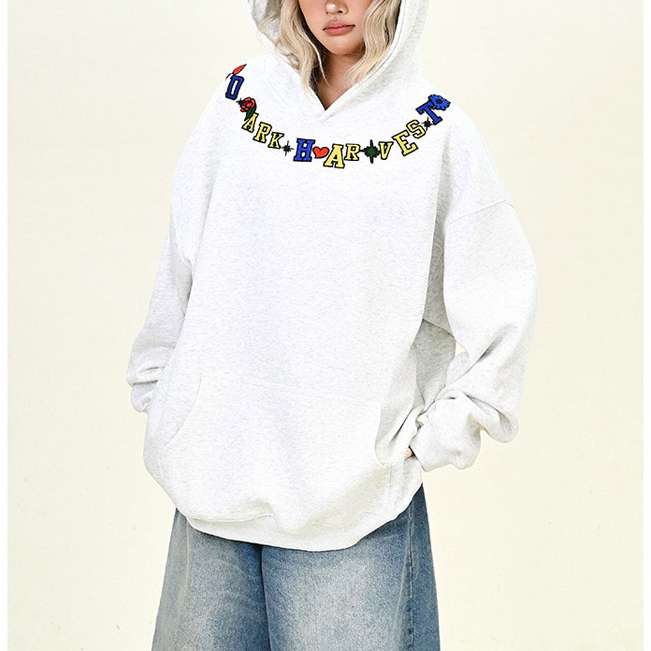 カラフルな刺繍ロゴが目を引くストリートフーディ。