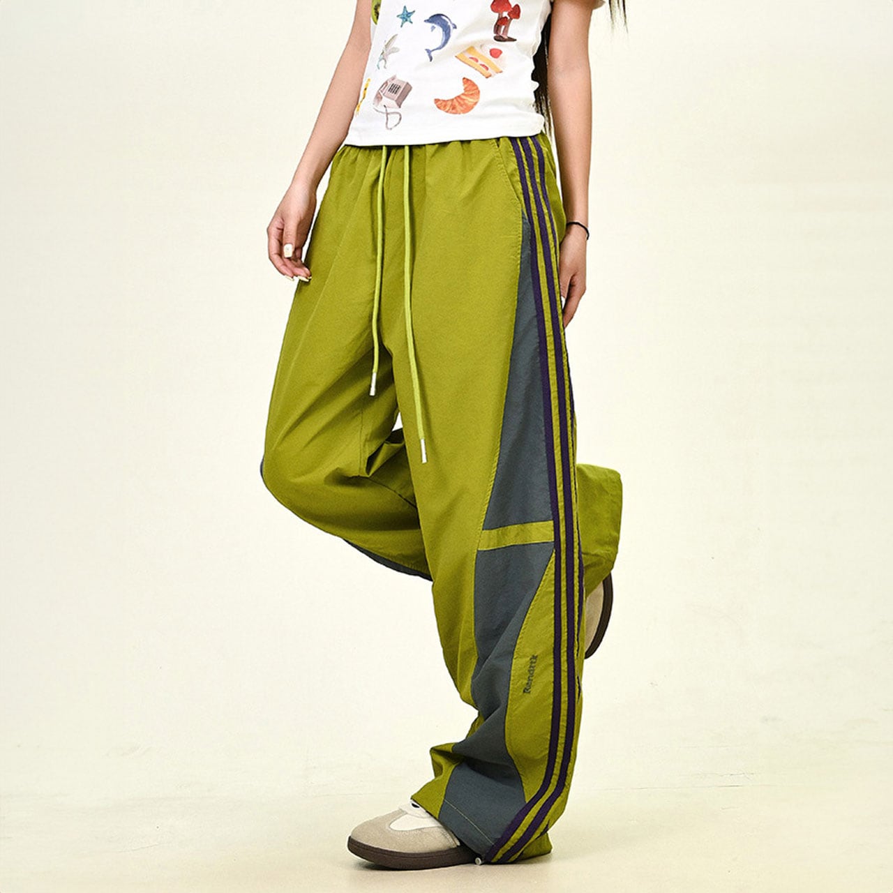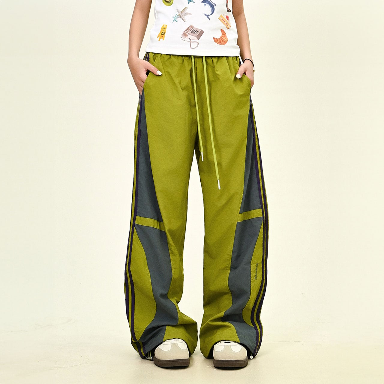 大胆なカラーブロッキングが目を引くトラックパンツ。