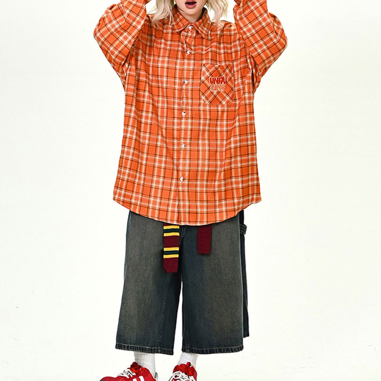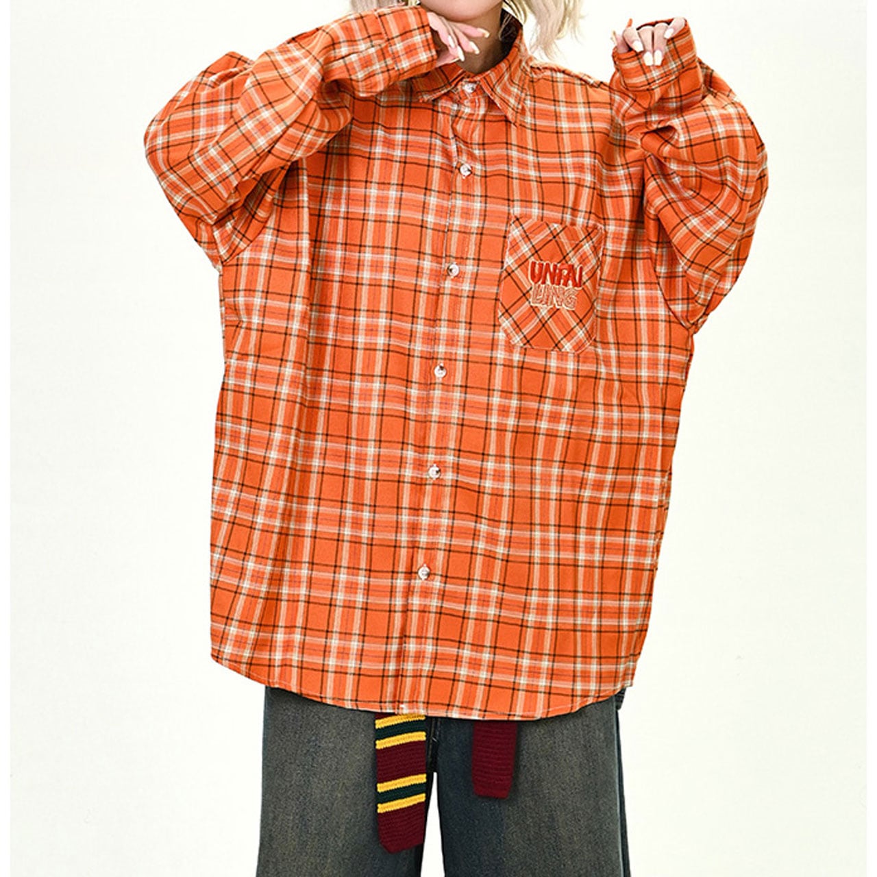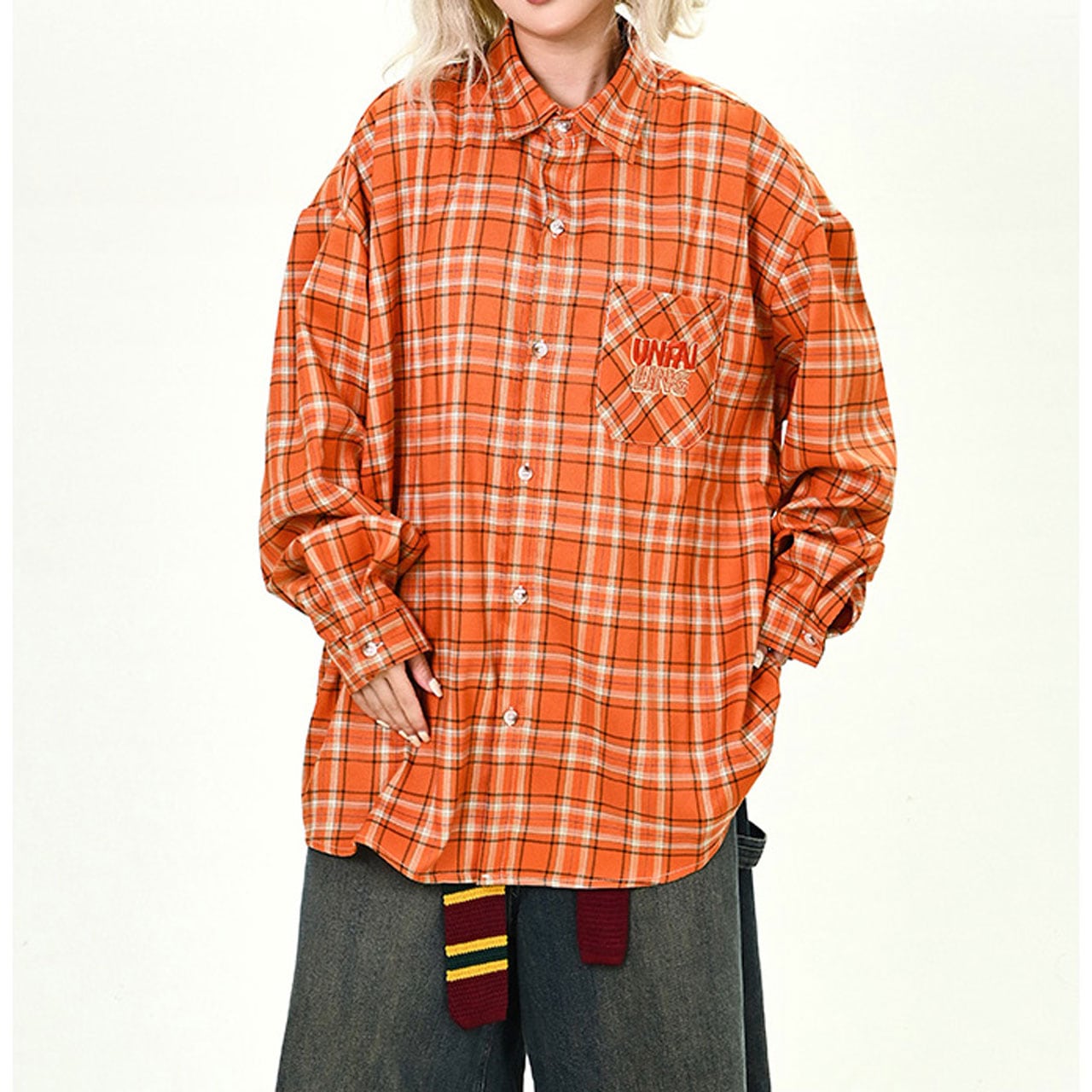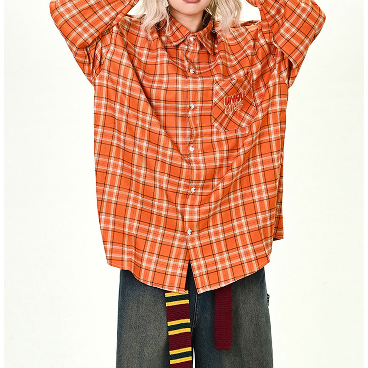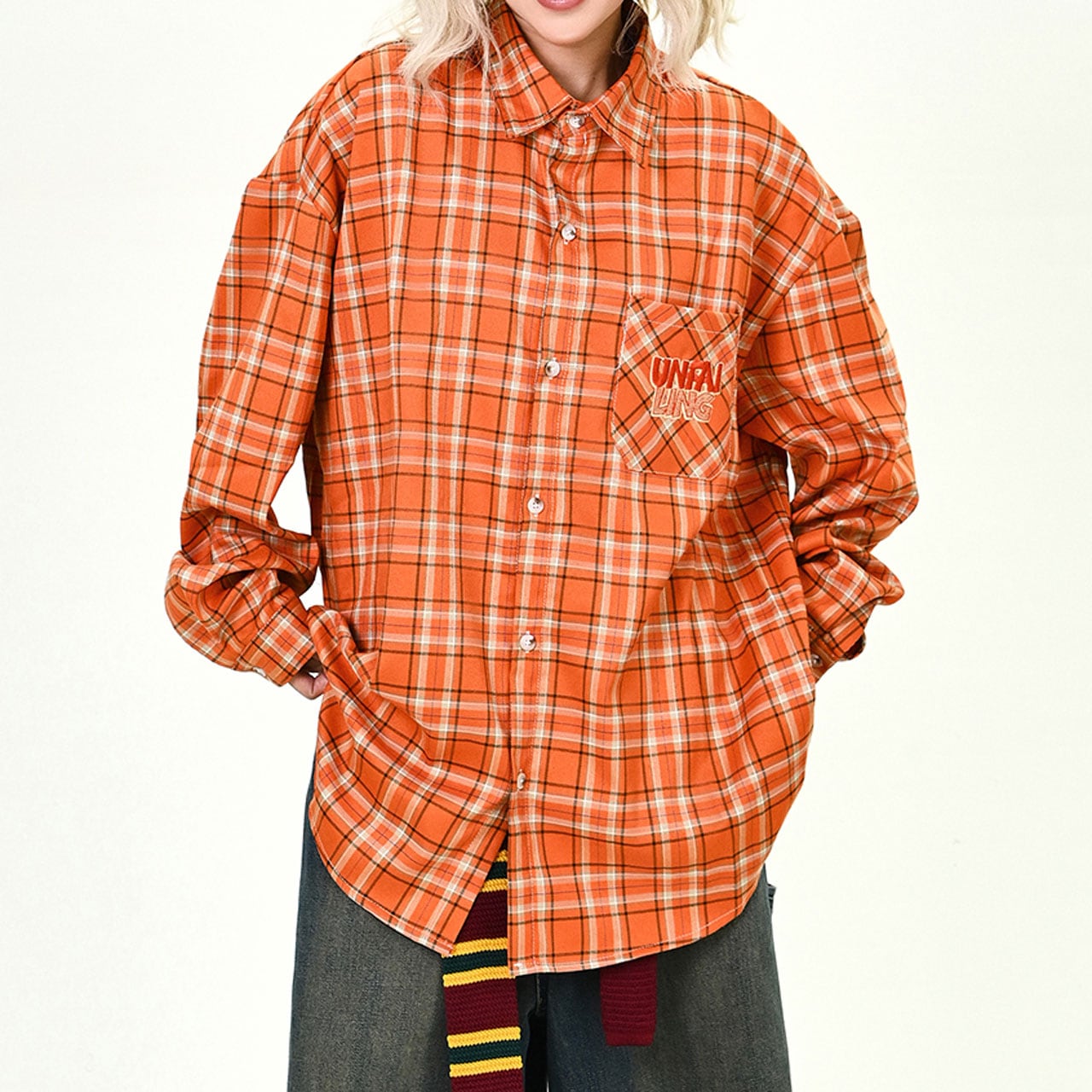 鮮やかなオレンジチェックが目を惹くシャツ。