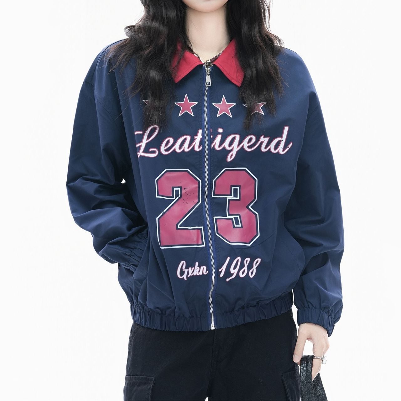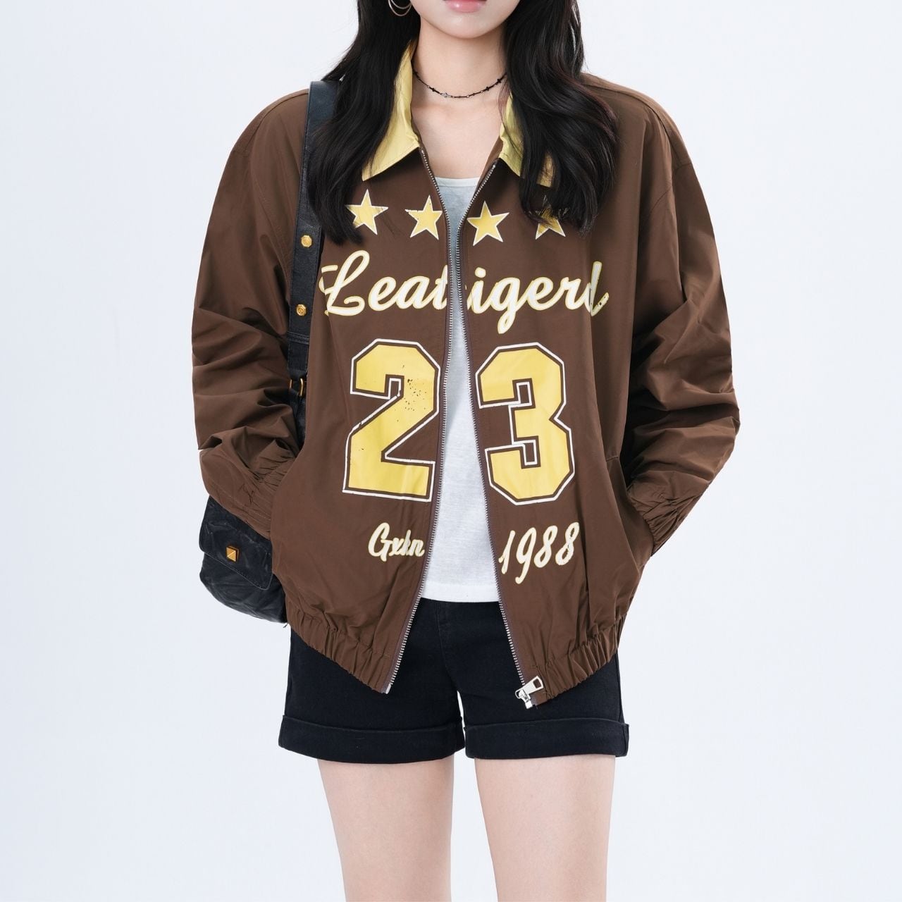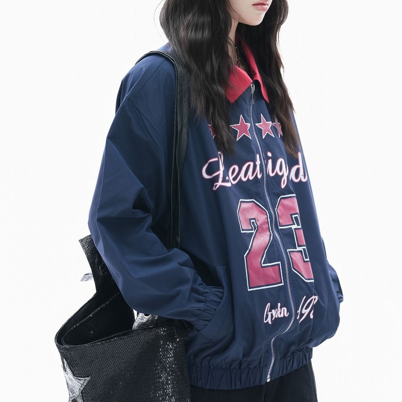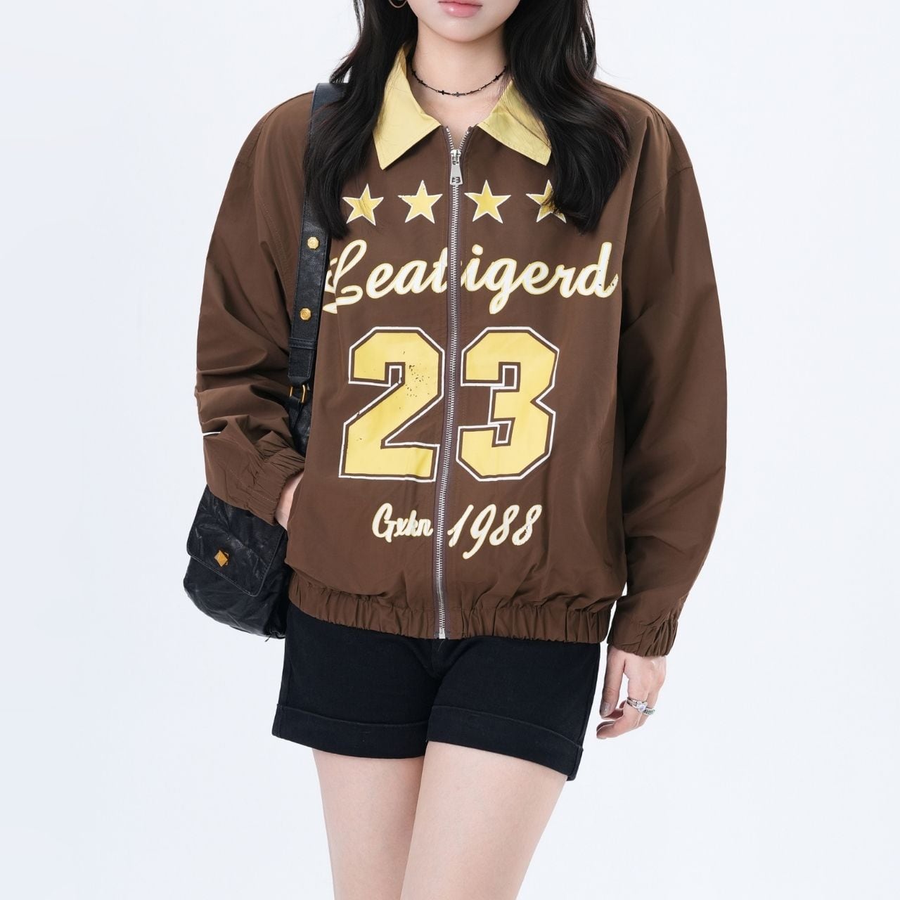 レタリングとナンバープリントが印象的なカラージップブルゾン。