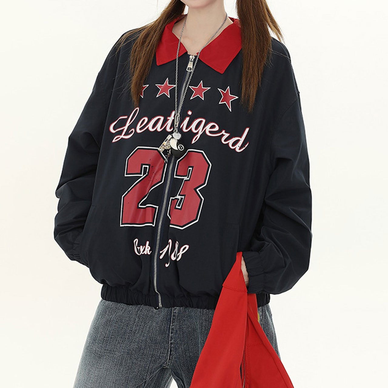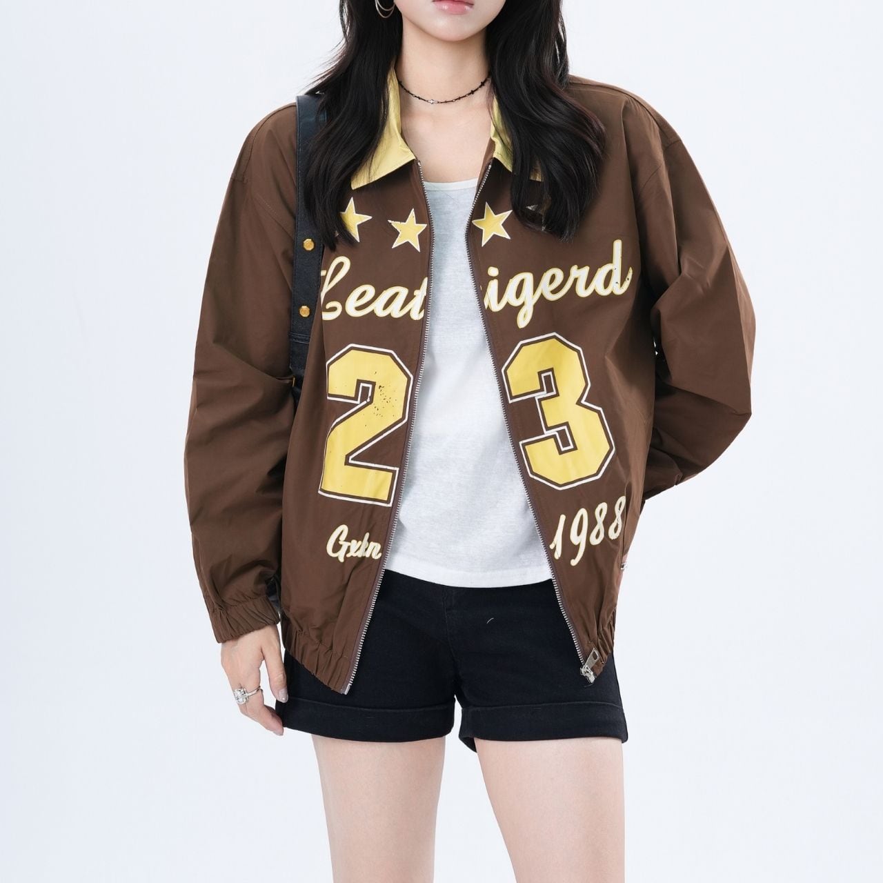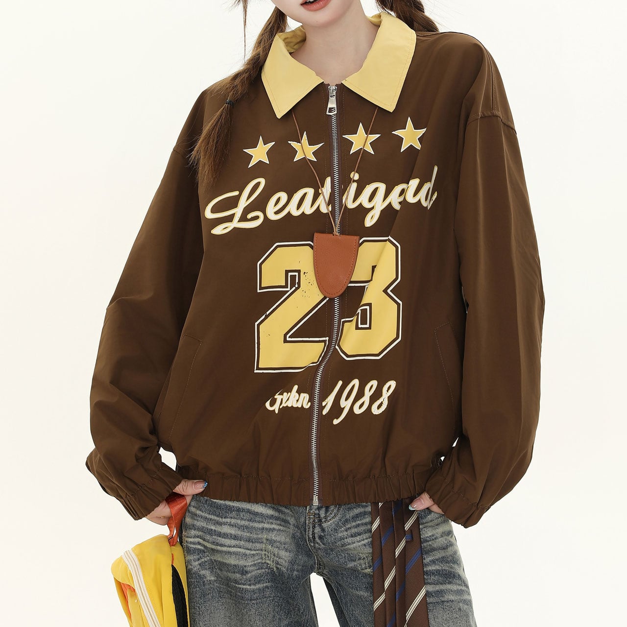 レタリングとナンバープリントが印象的なカラージップブルゾン。