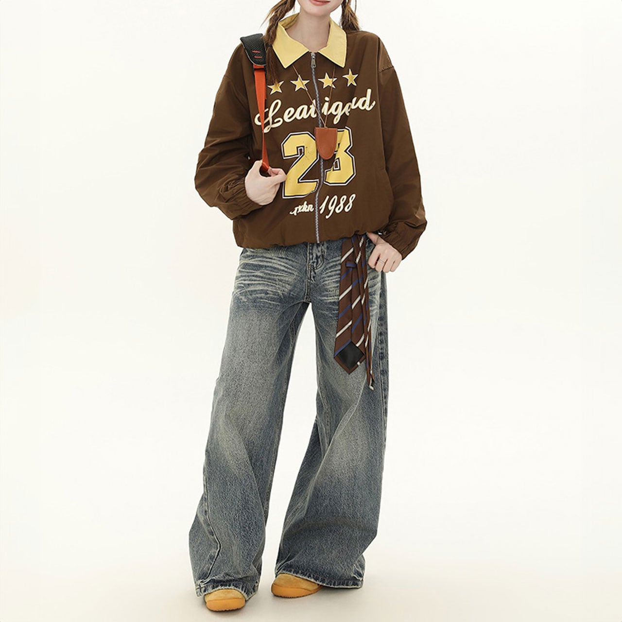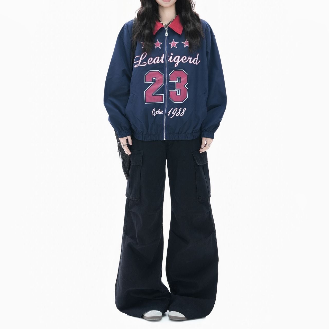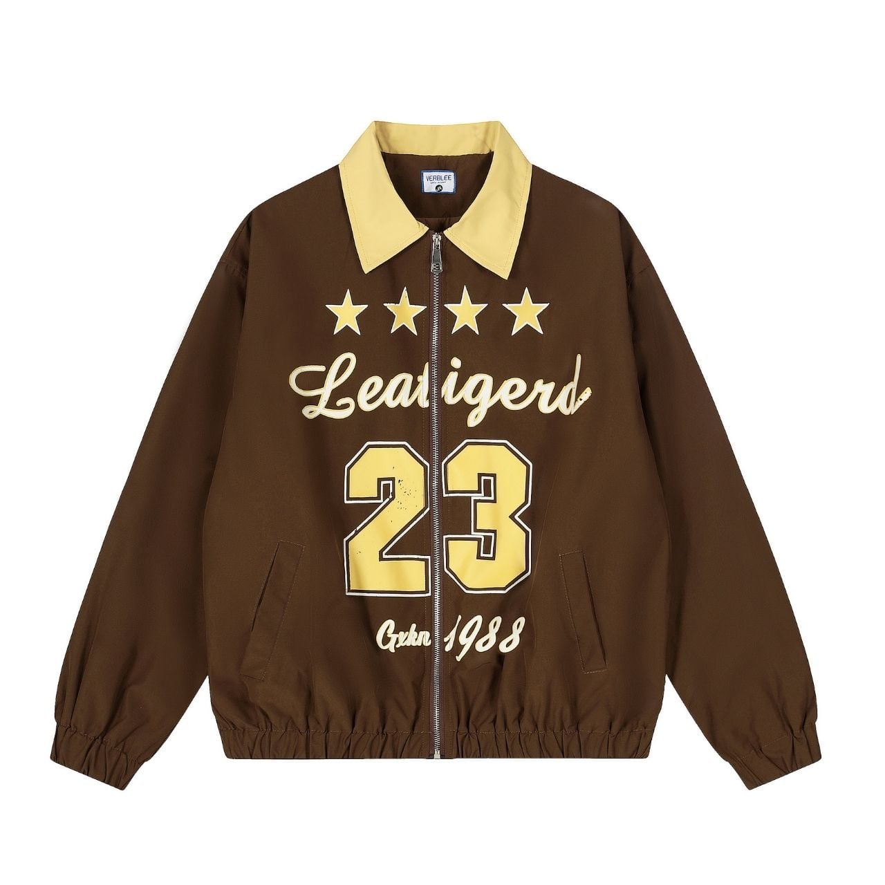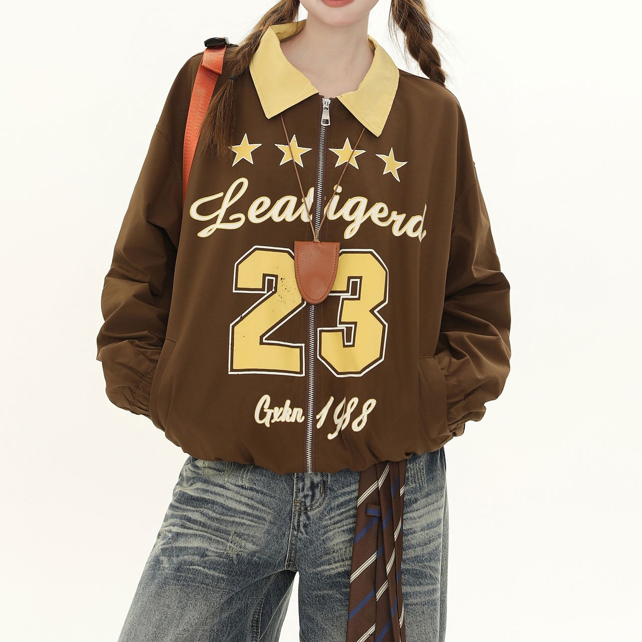 レタリングとナンバープリントが印象的なカラージップブルゾン。