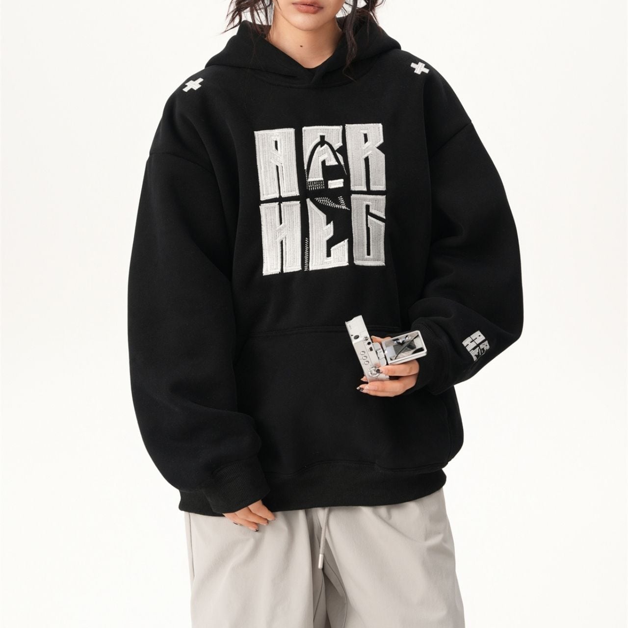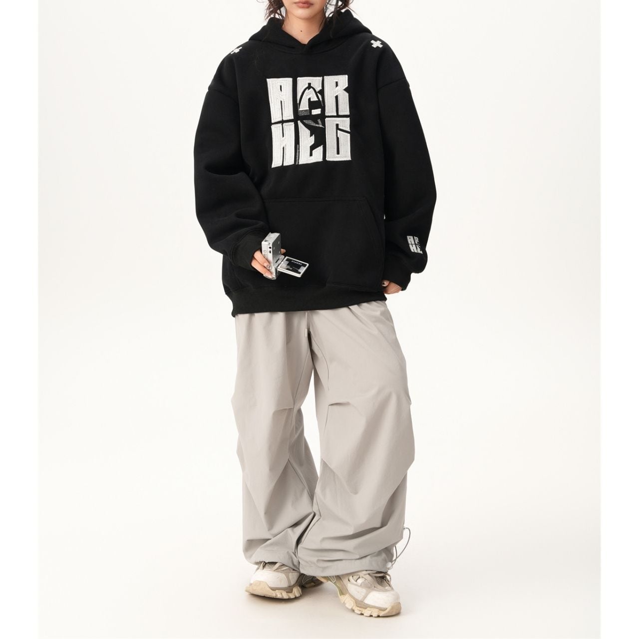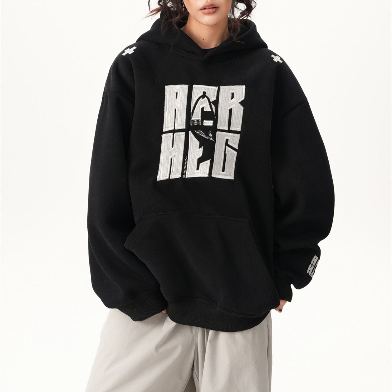 インパクトのあるフロントロゴが目を引くフーディ。