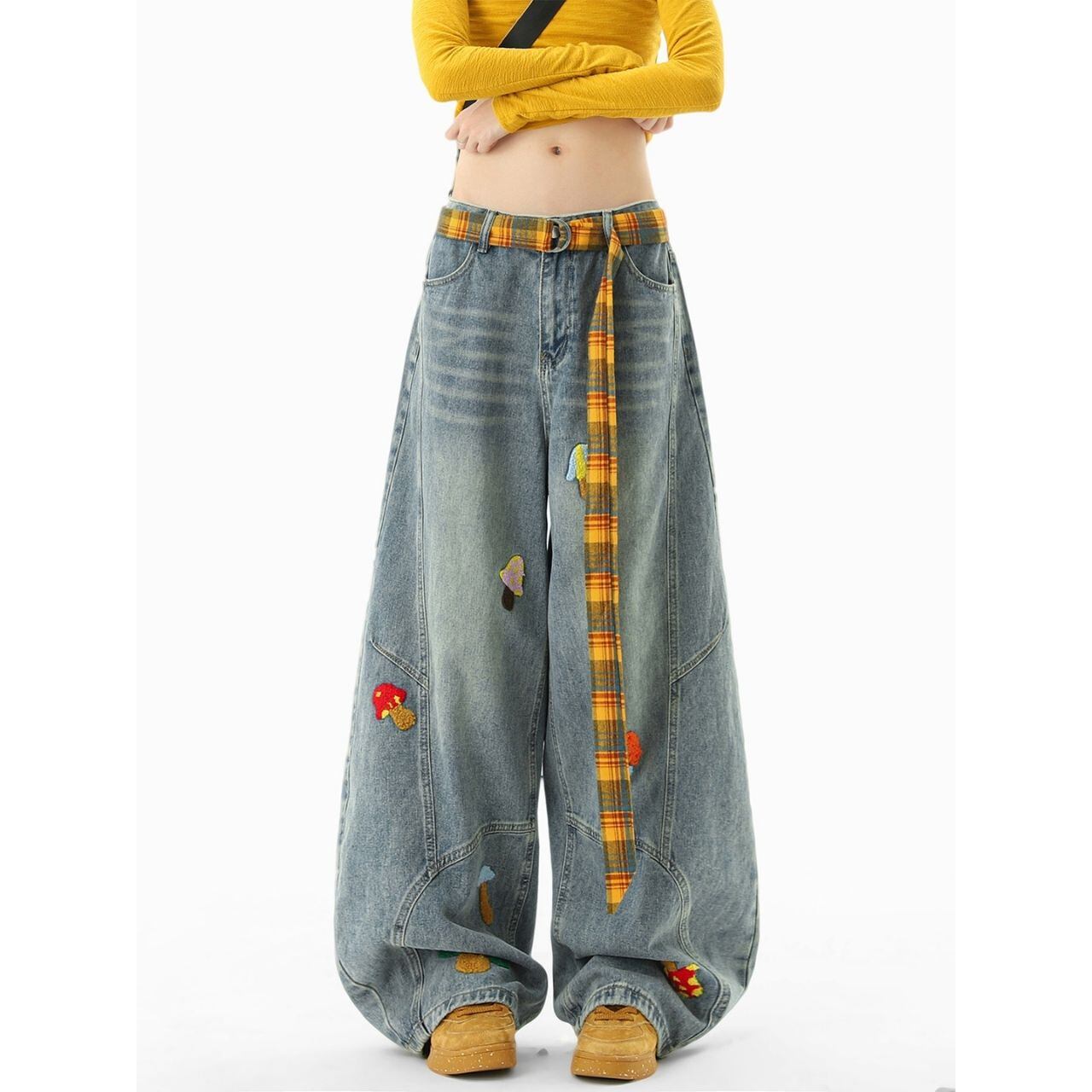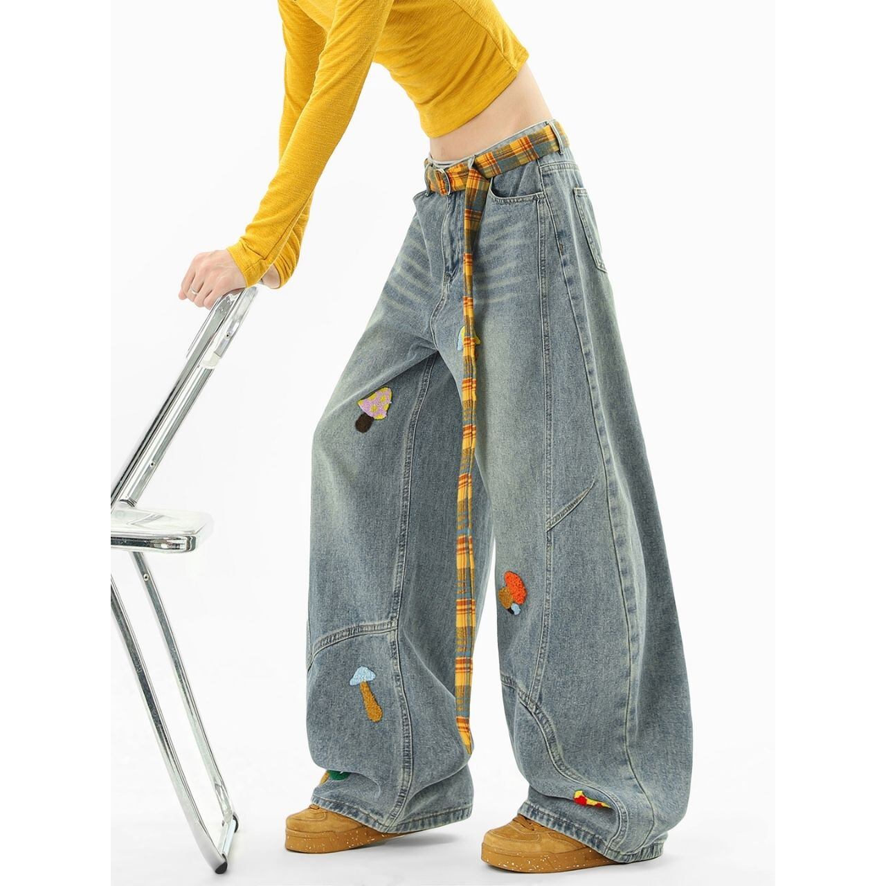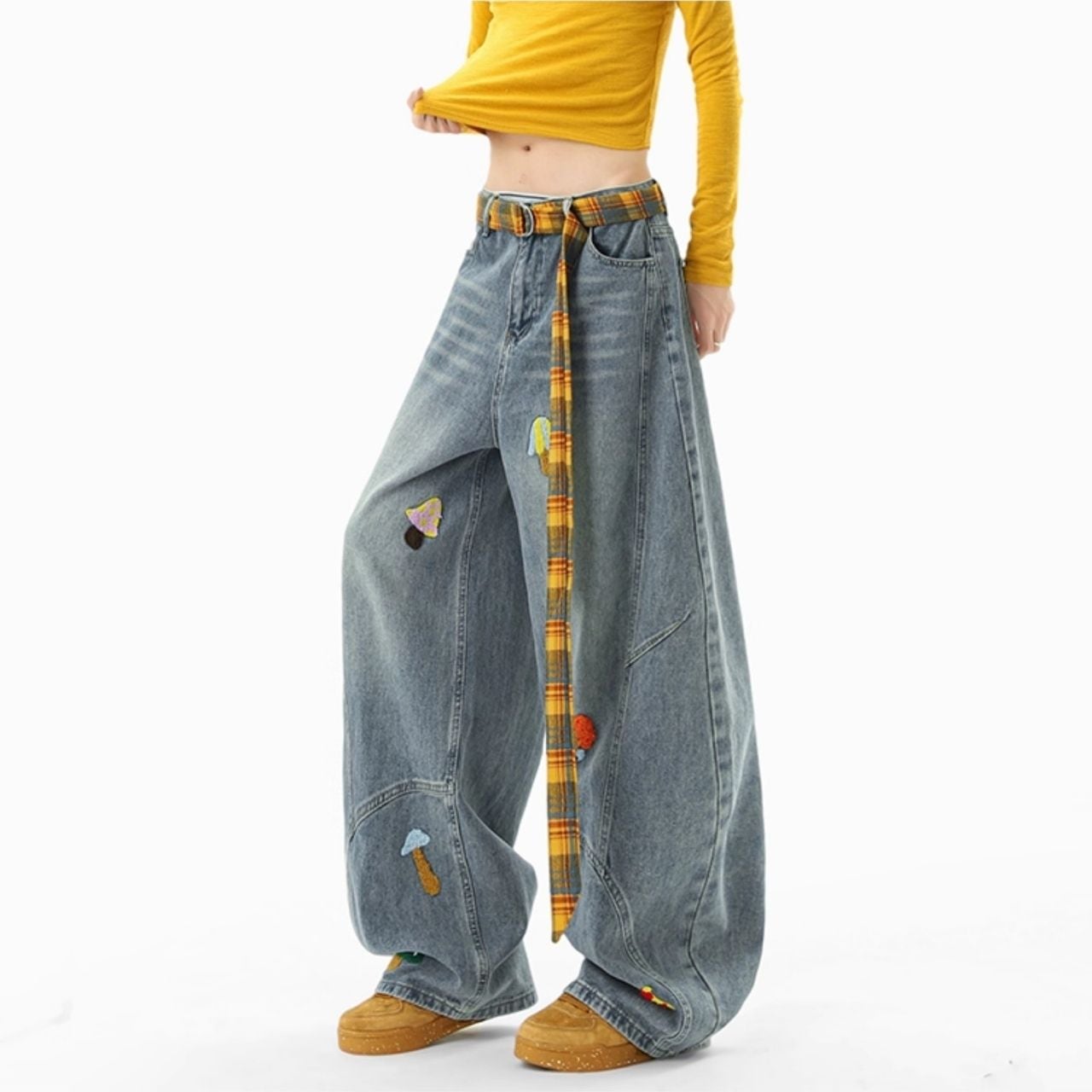 ポップなきのこ刺繍が遊び心をくすぐるデニムパンツ。