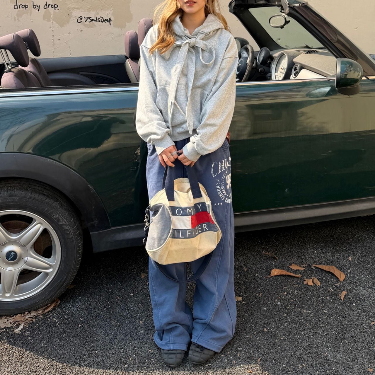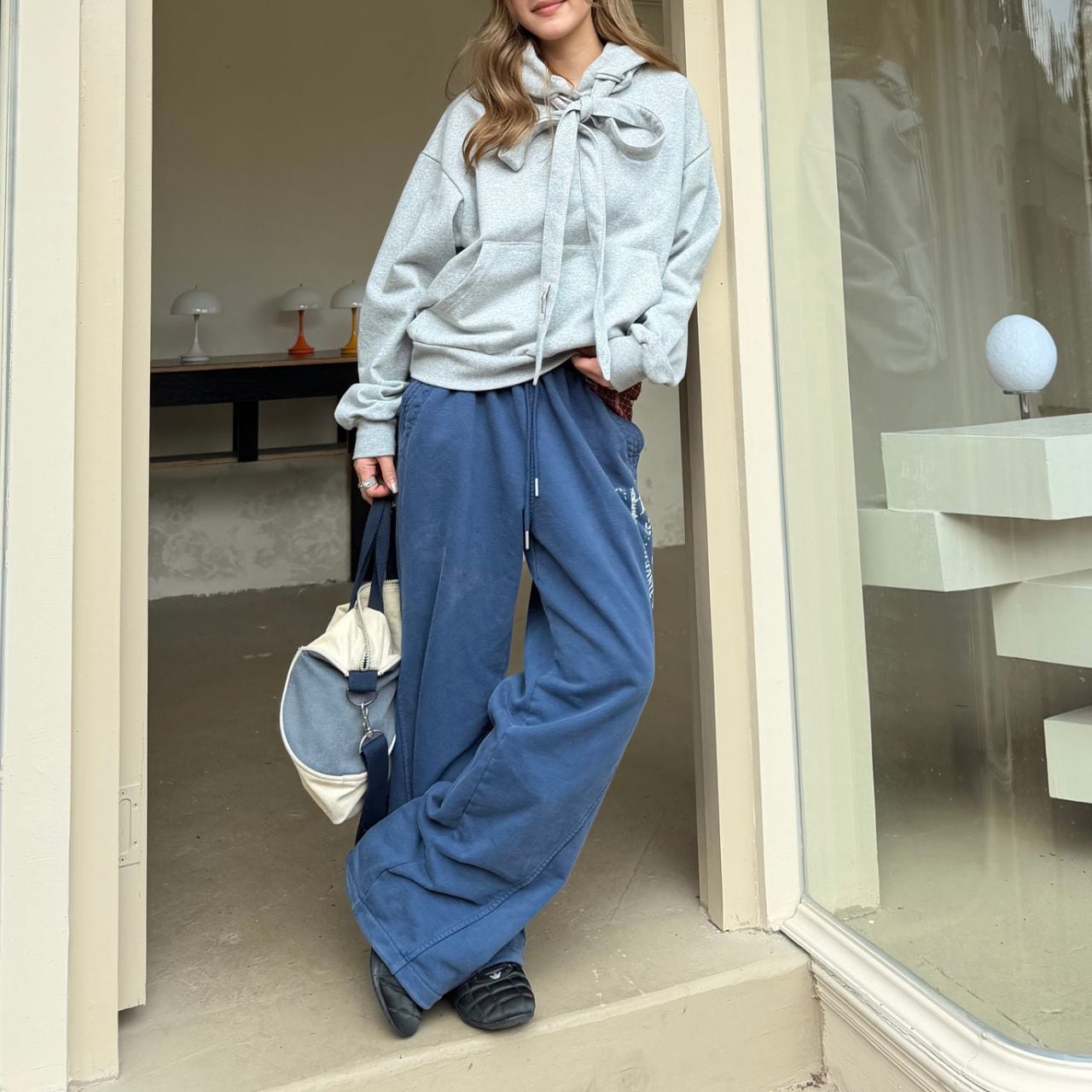 ベーシックなグレーにさりげない甘さをプラス。