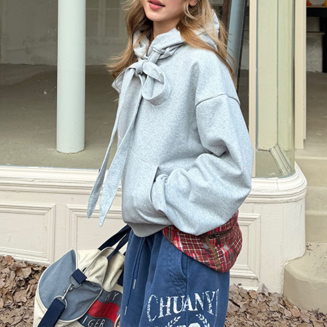 首元のリボンデザインがポイントのスウェットパーカー。