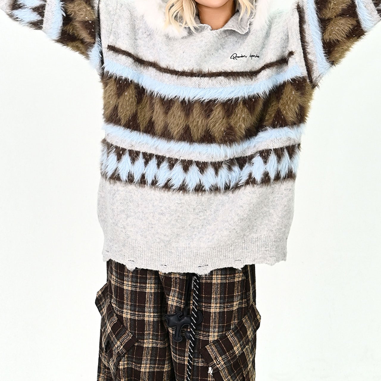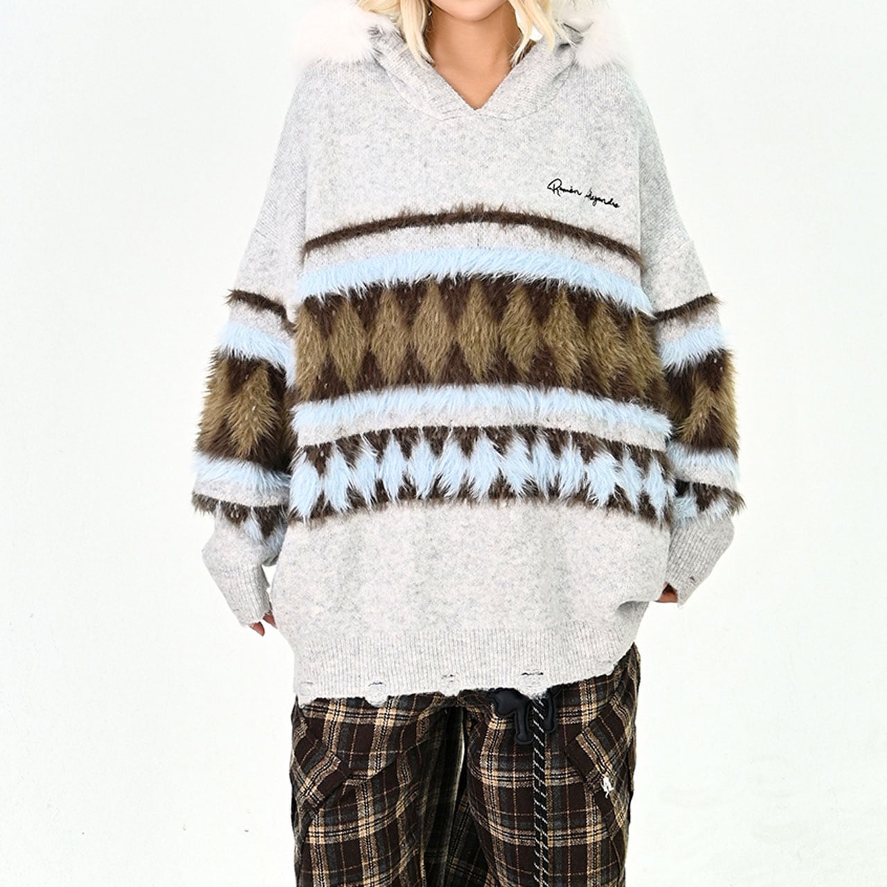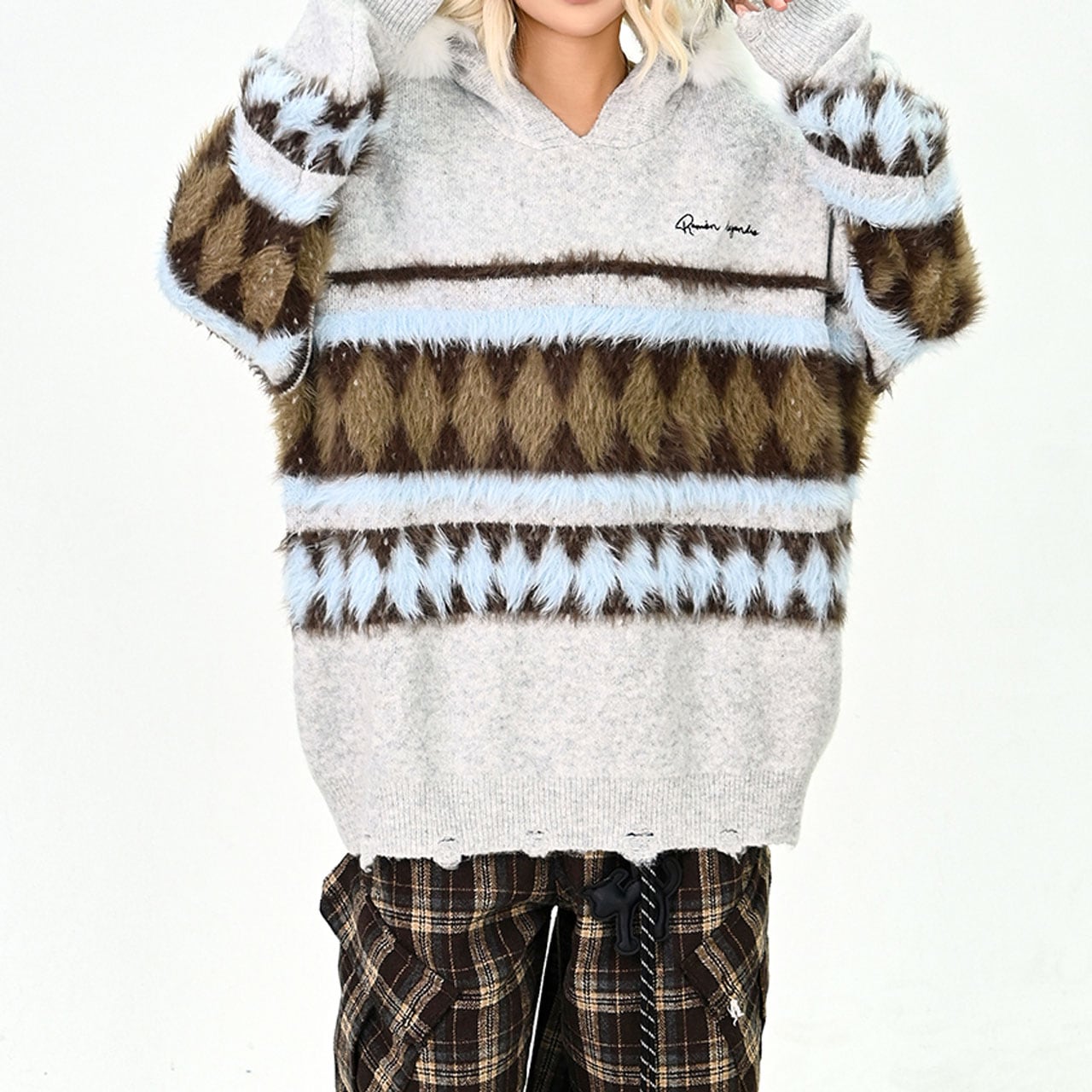 ふわっとした毛足とダイヤ柄が可愛いルーズニット。