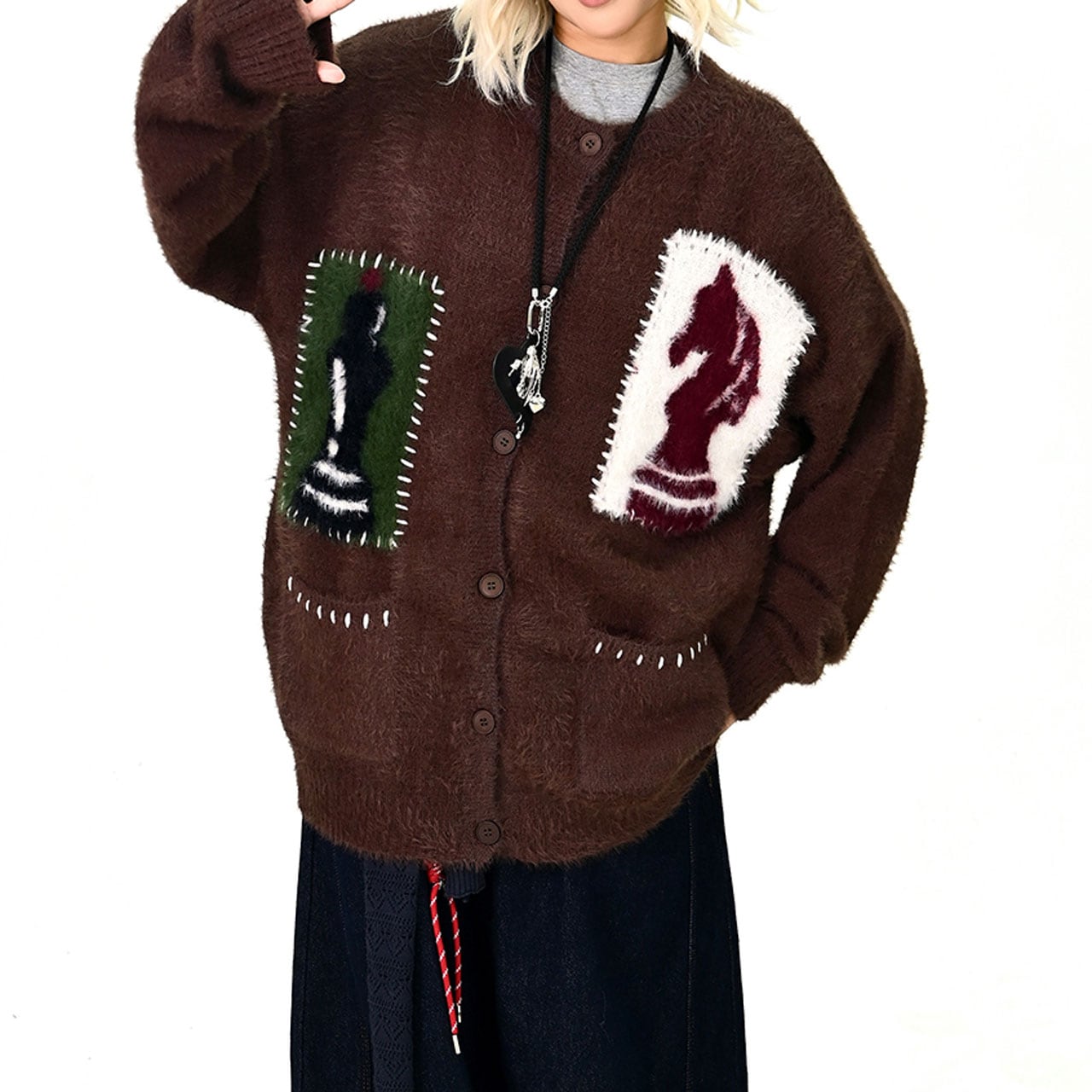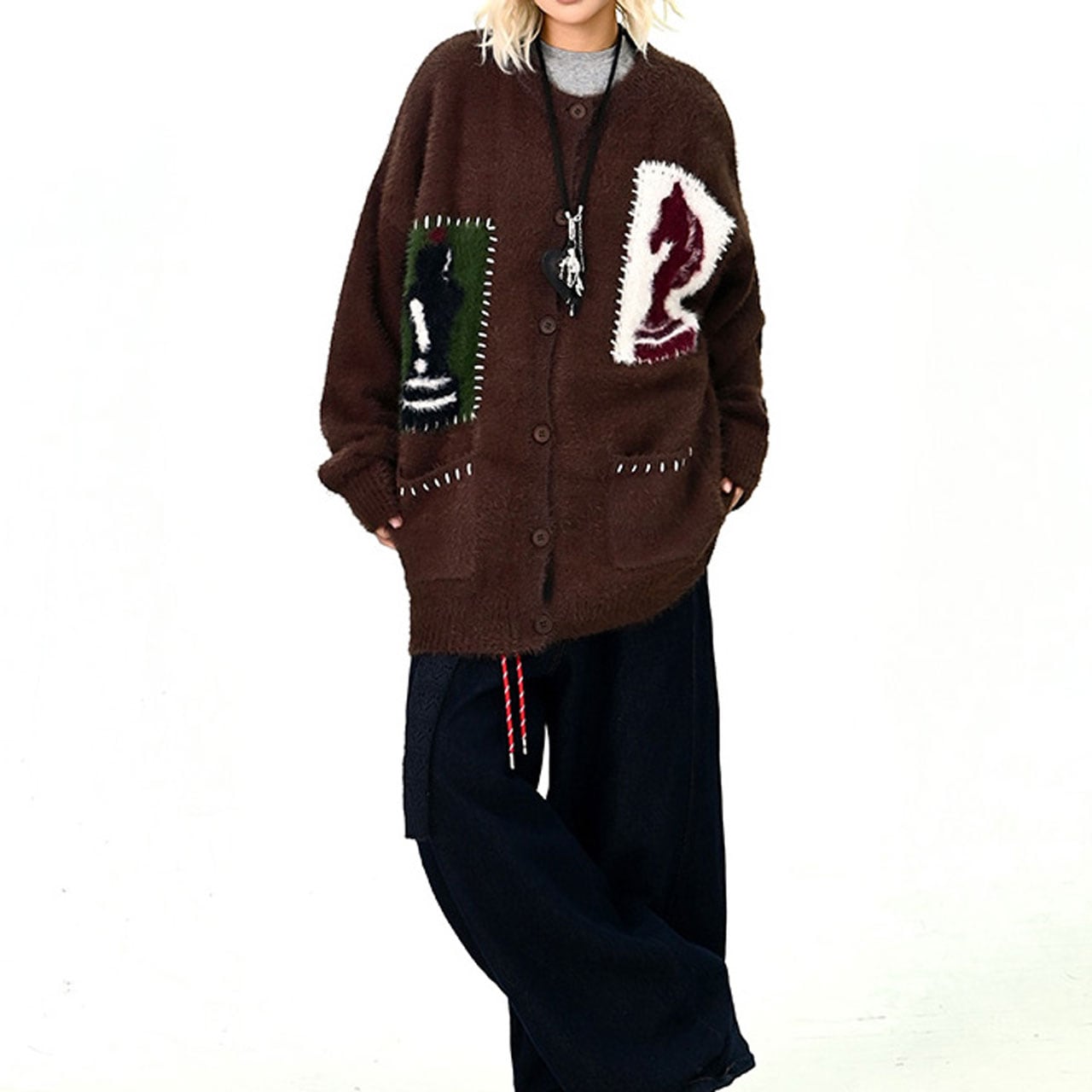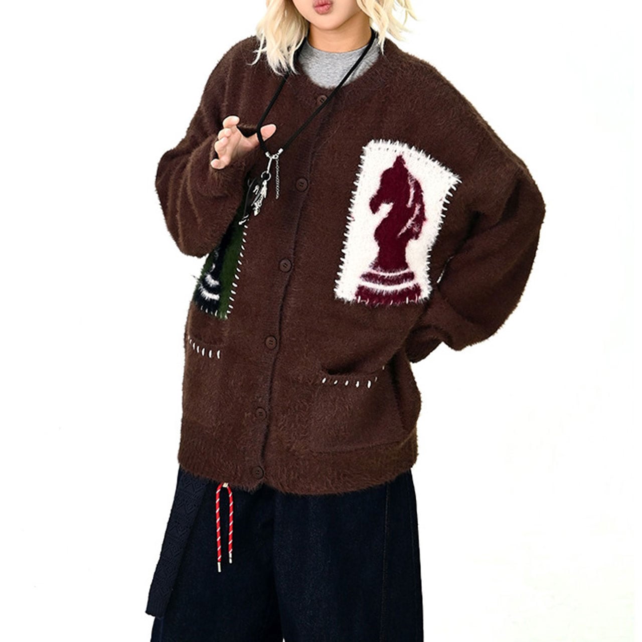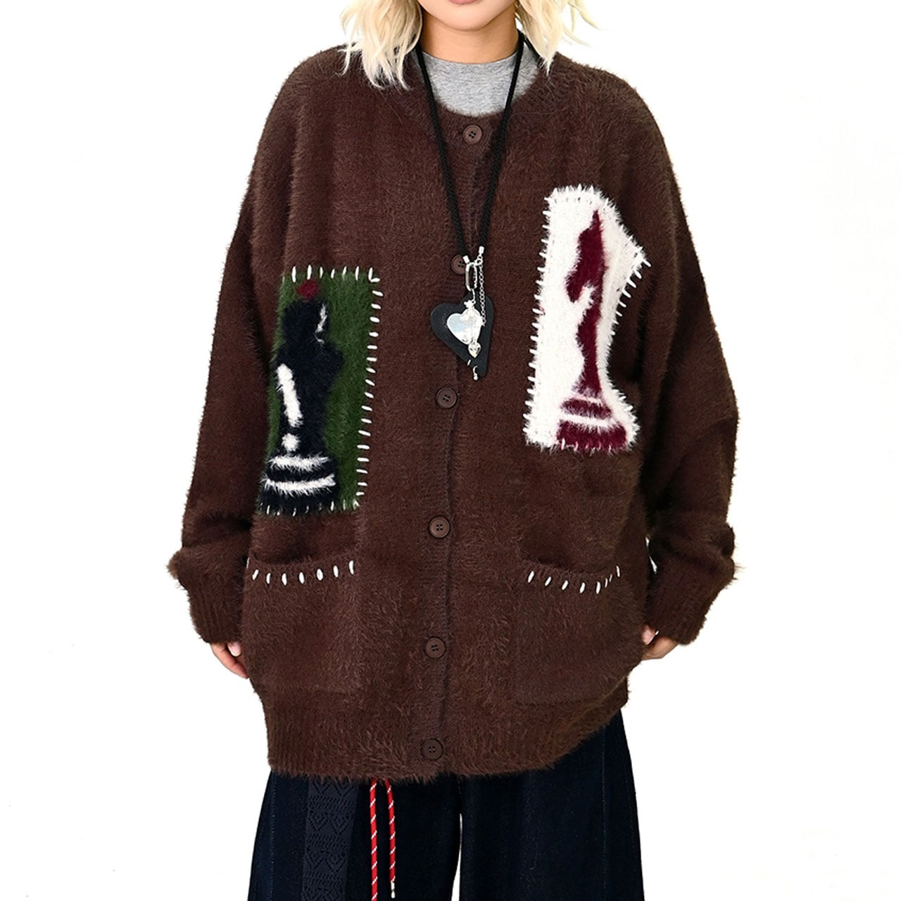 チェス駒モチーフのポケットデザインが印象的なカーディガン。