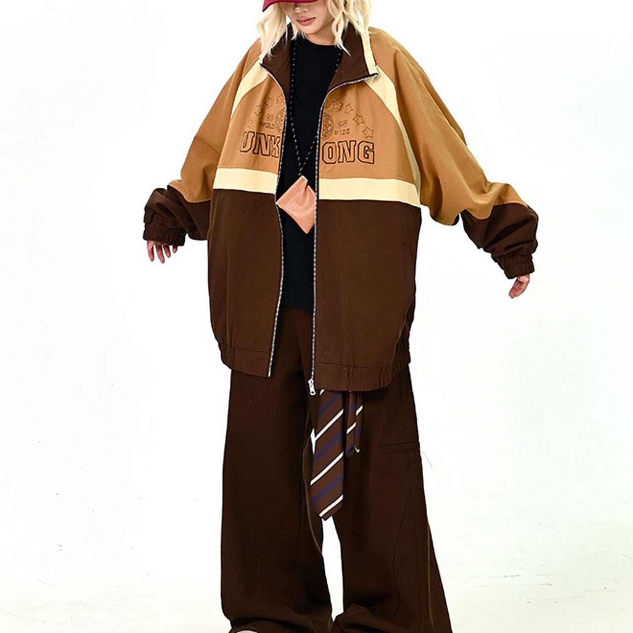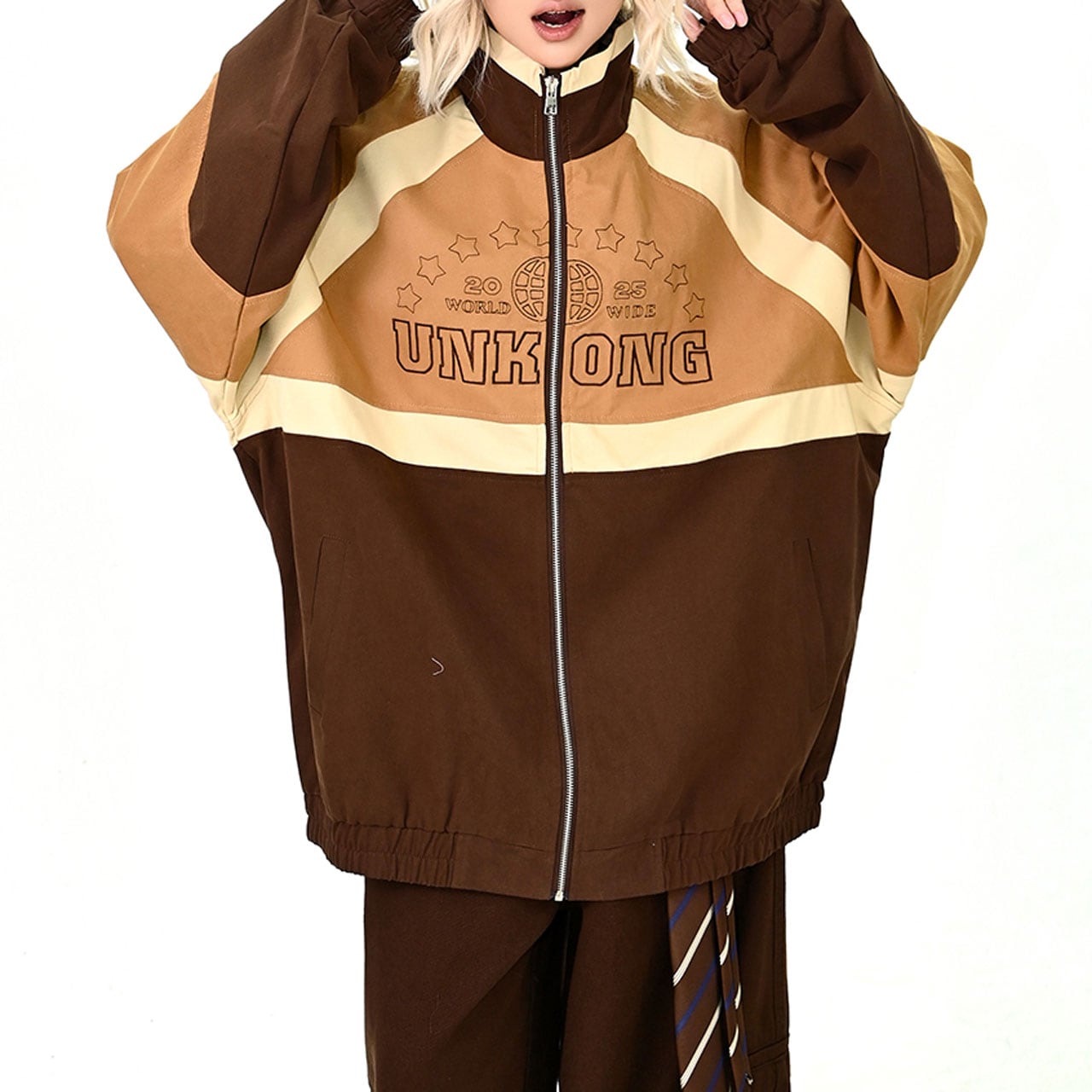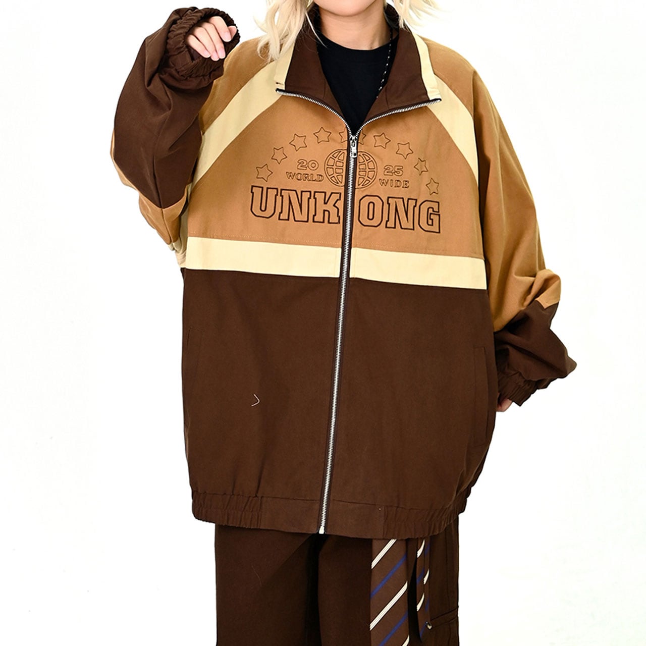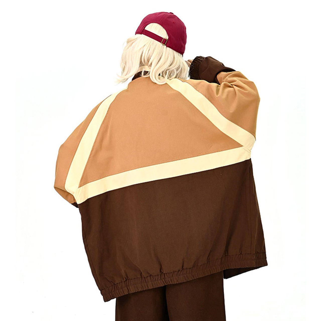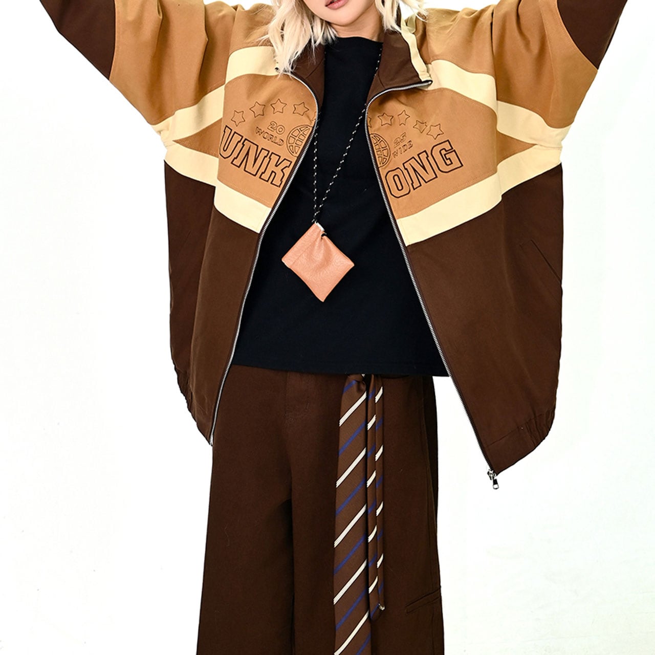 レトロなブラウン系のカラーブロッキングが目を惹くライトアウター。