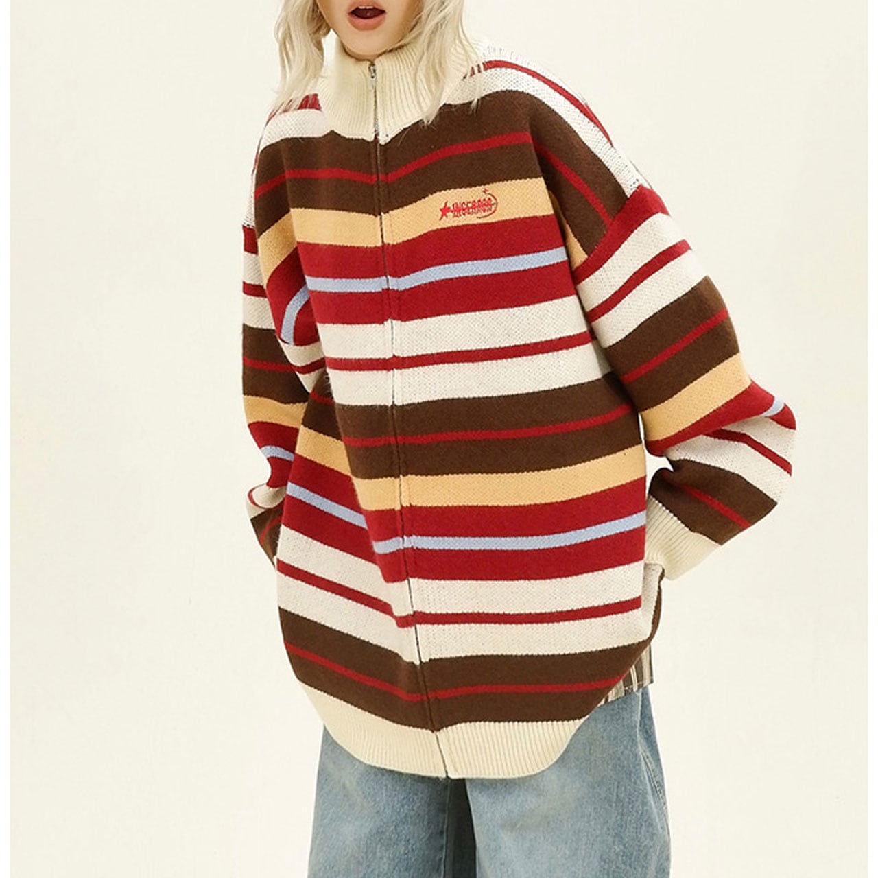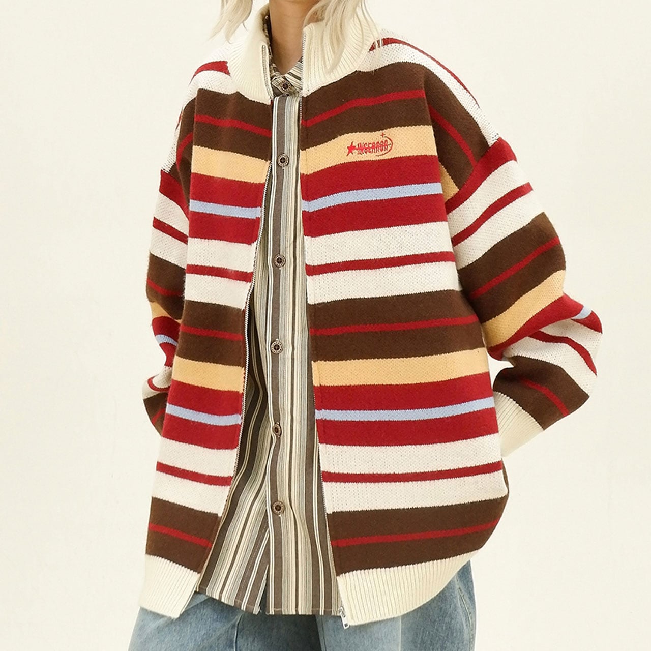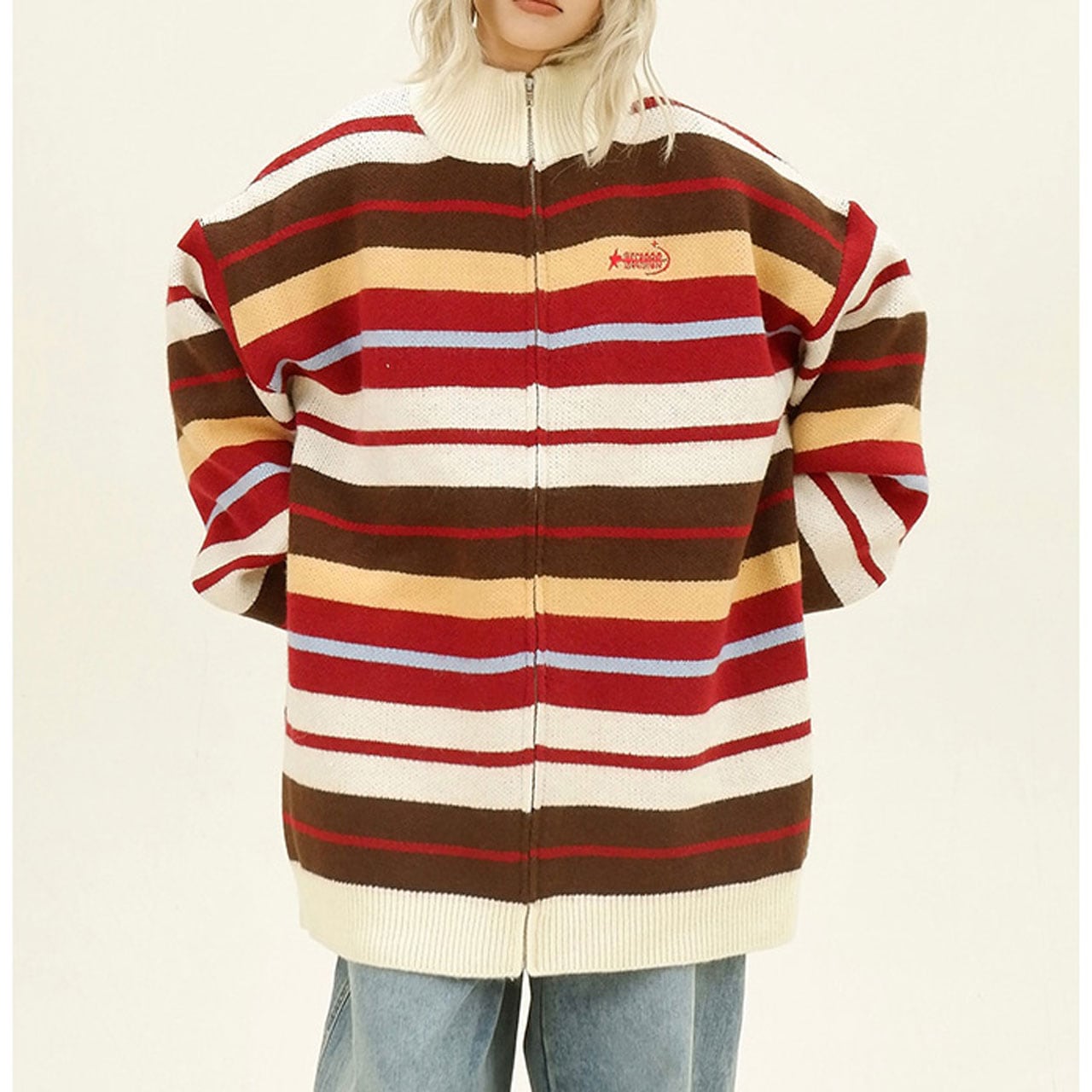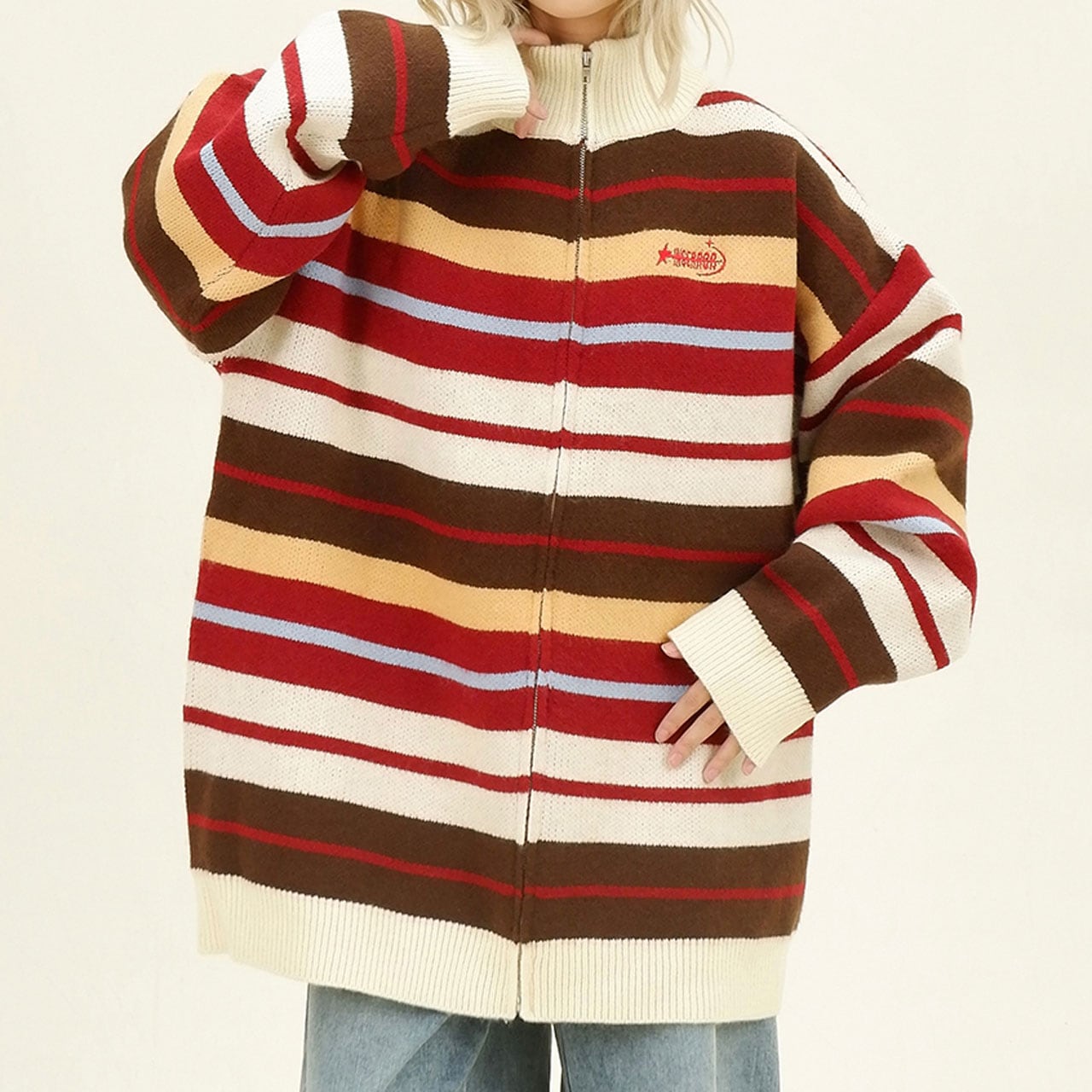 レトロな配色ストライプが目を惹くジップニット。