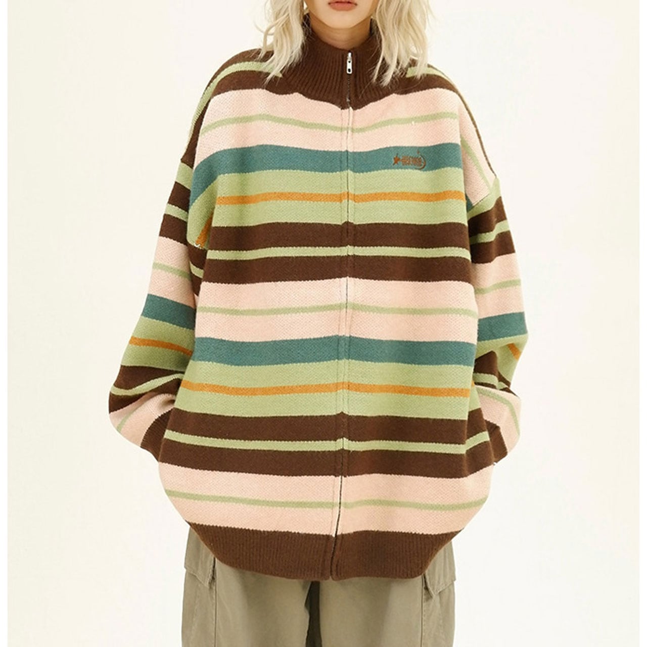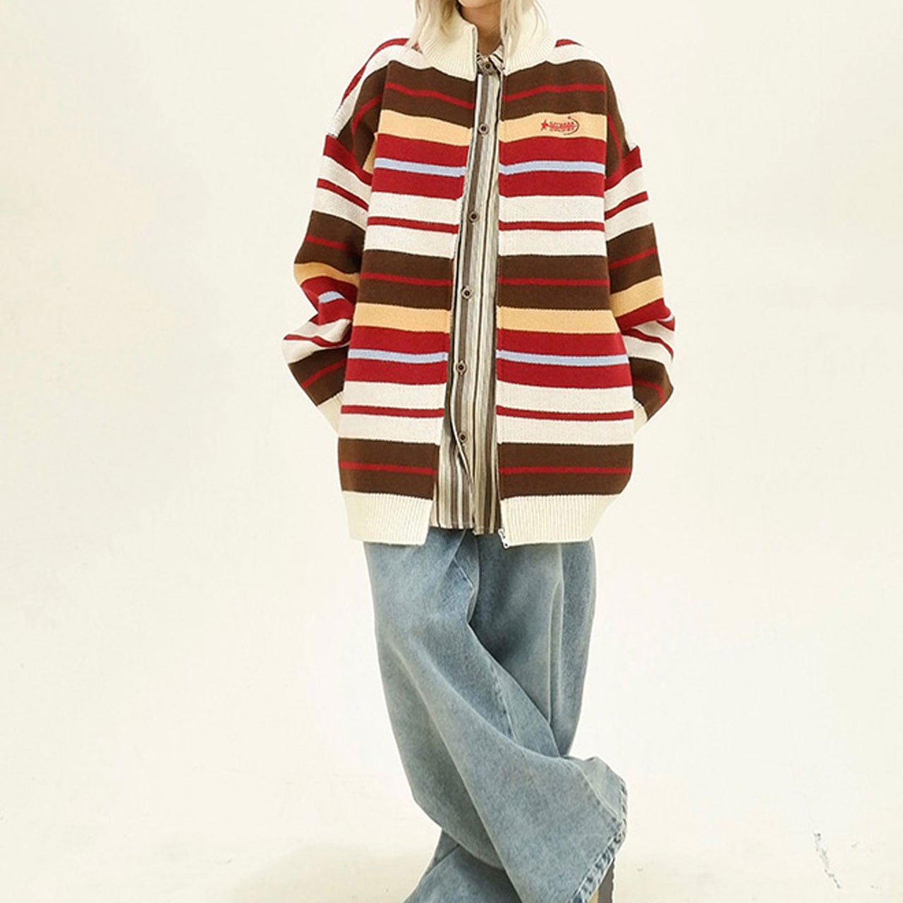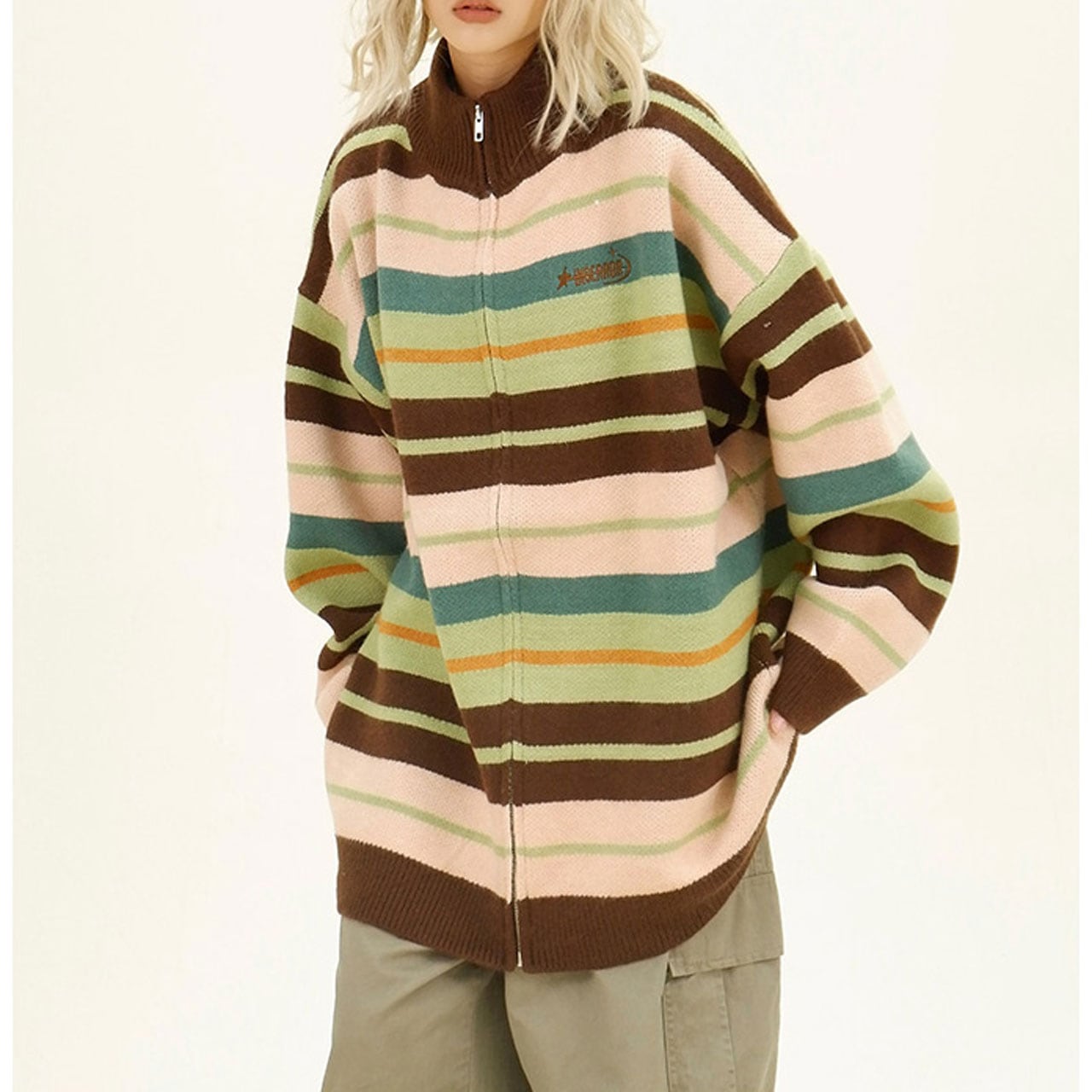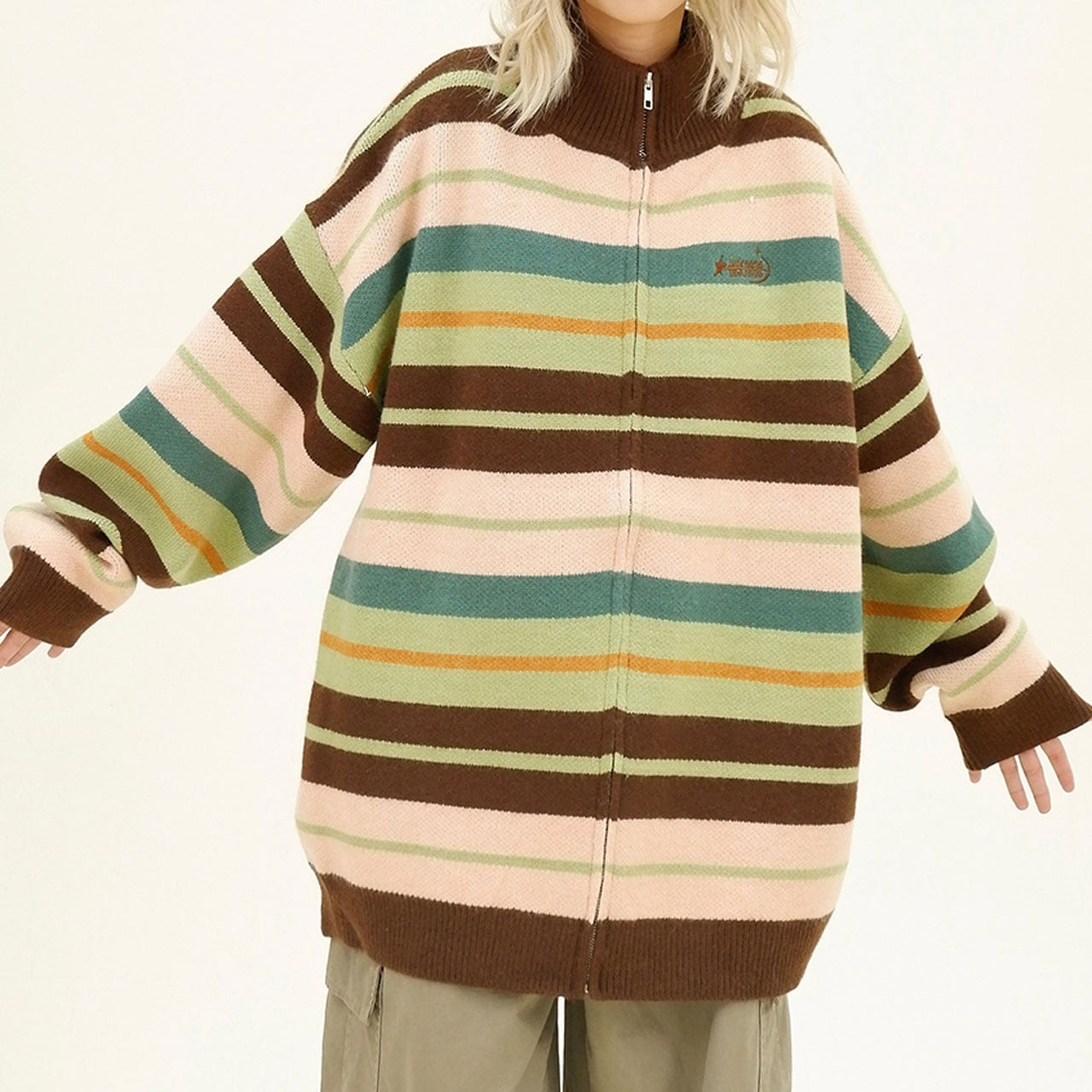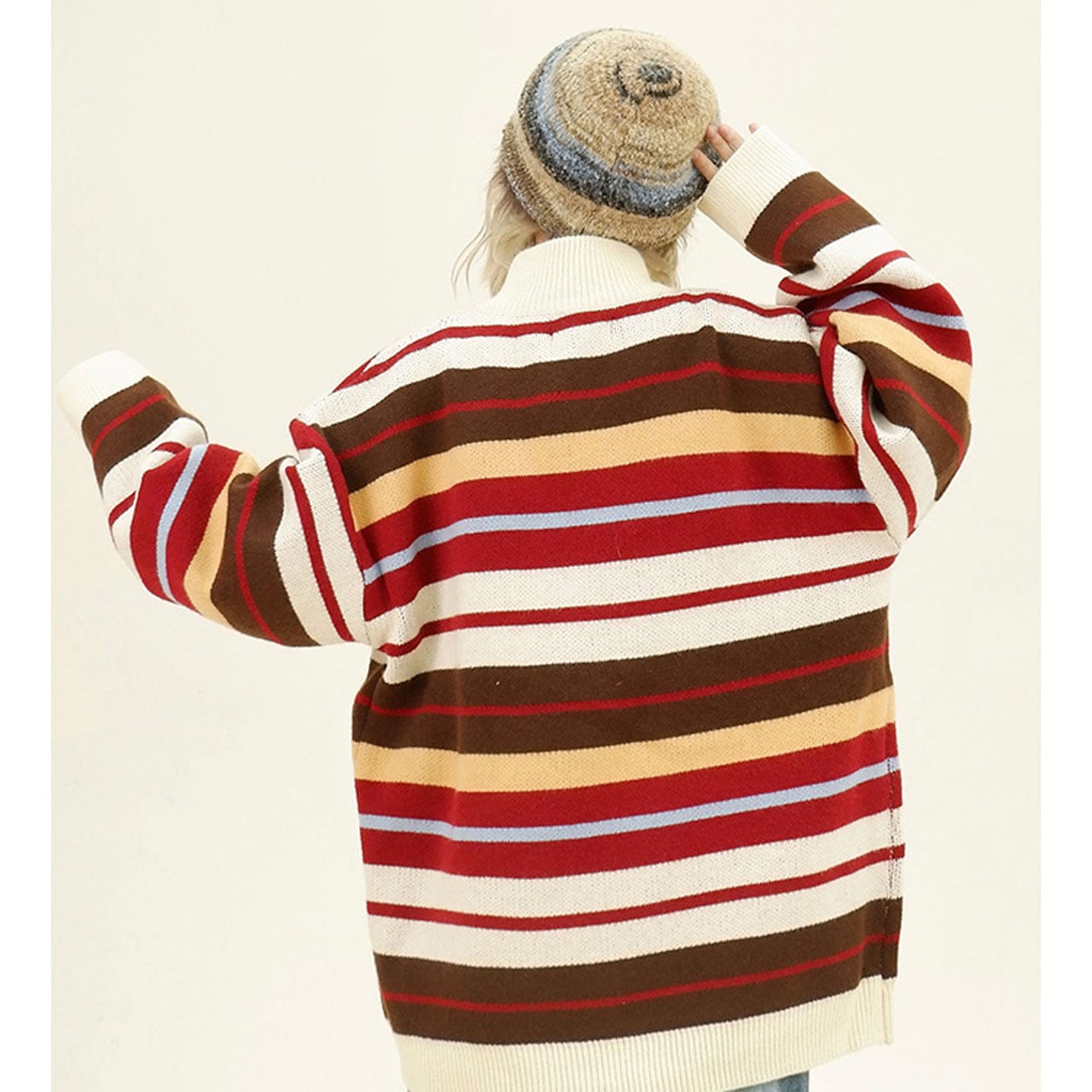 レトロな配色ストライプが目を惹くジップニット。