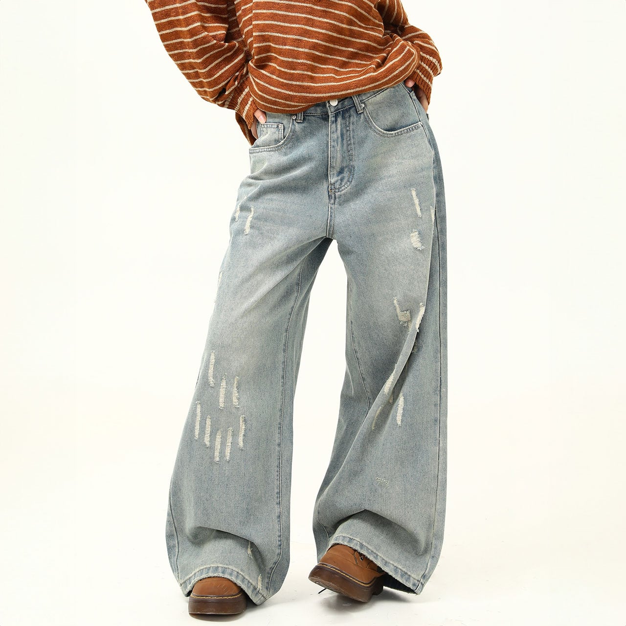フロントの細かなダメージがこなれ感をプラスし、ゆるめトップスと合わせるだけで洒落たバランスに。