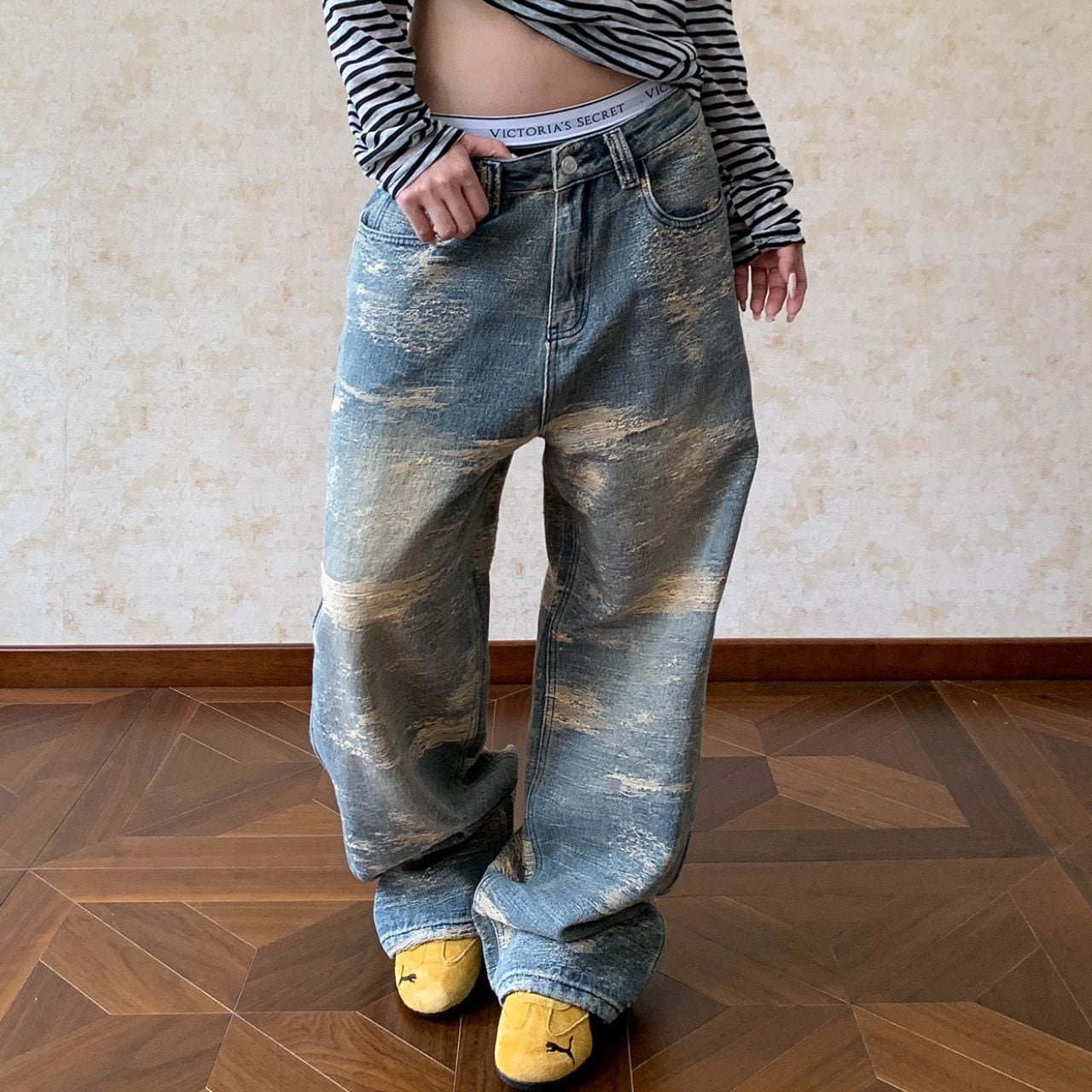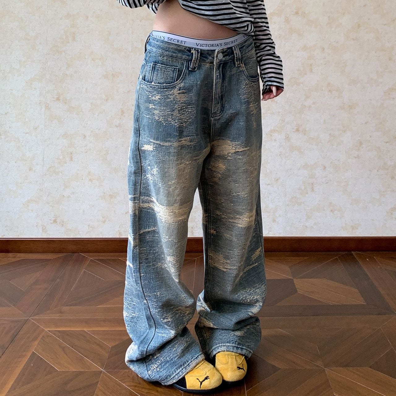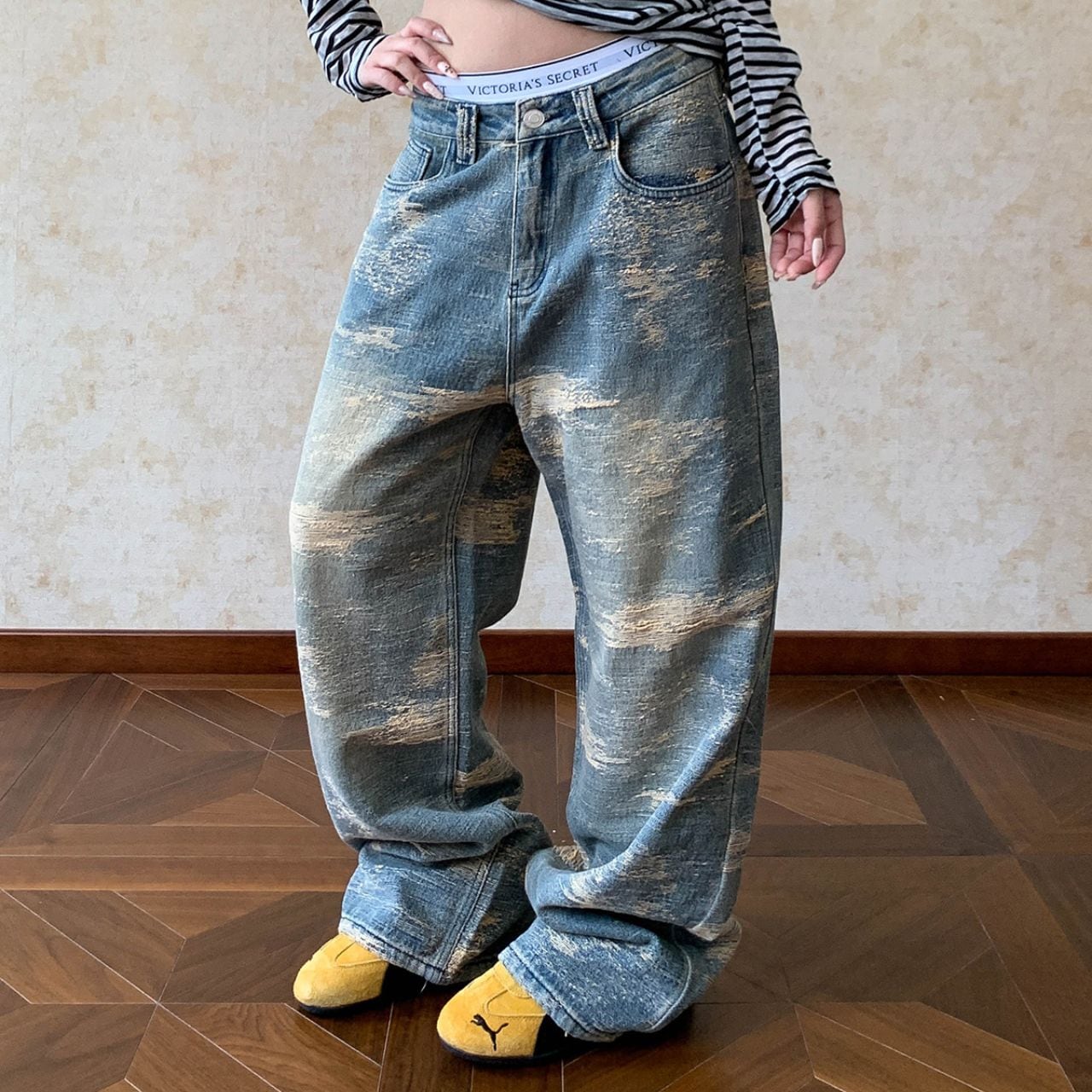 大胆なクラッシュ風デザインが主役になるワイドデニム。