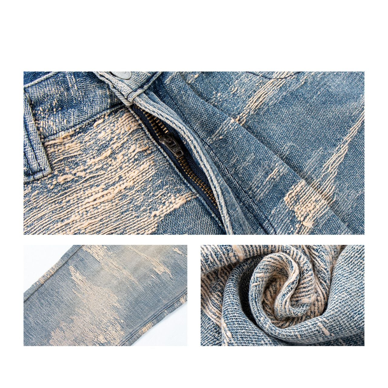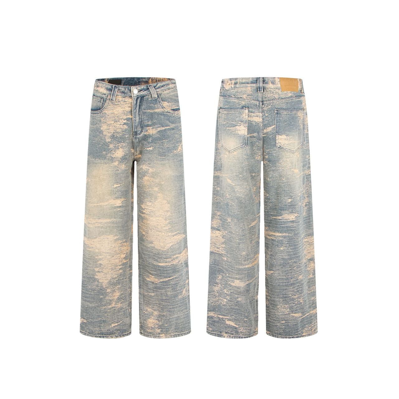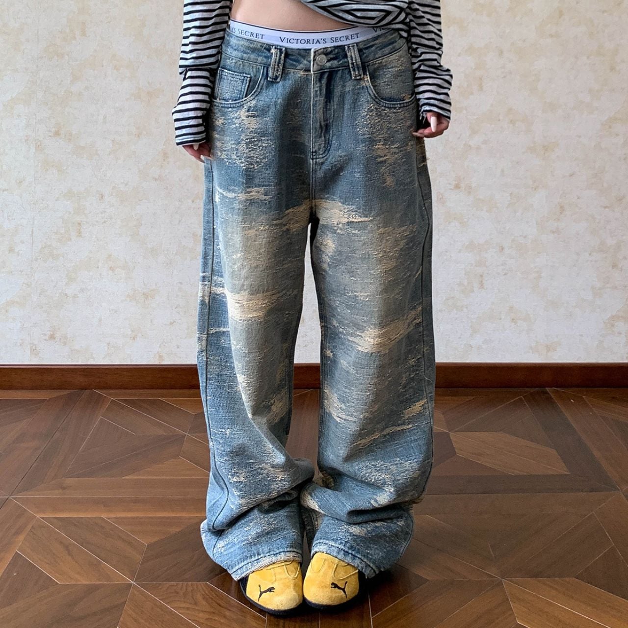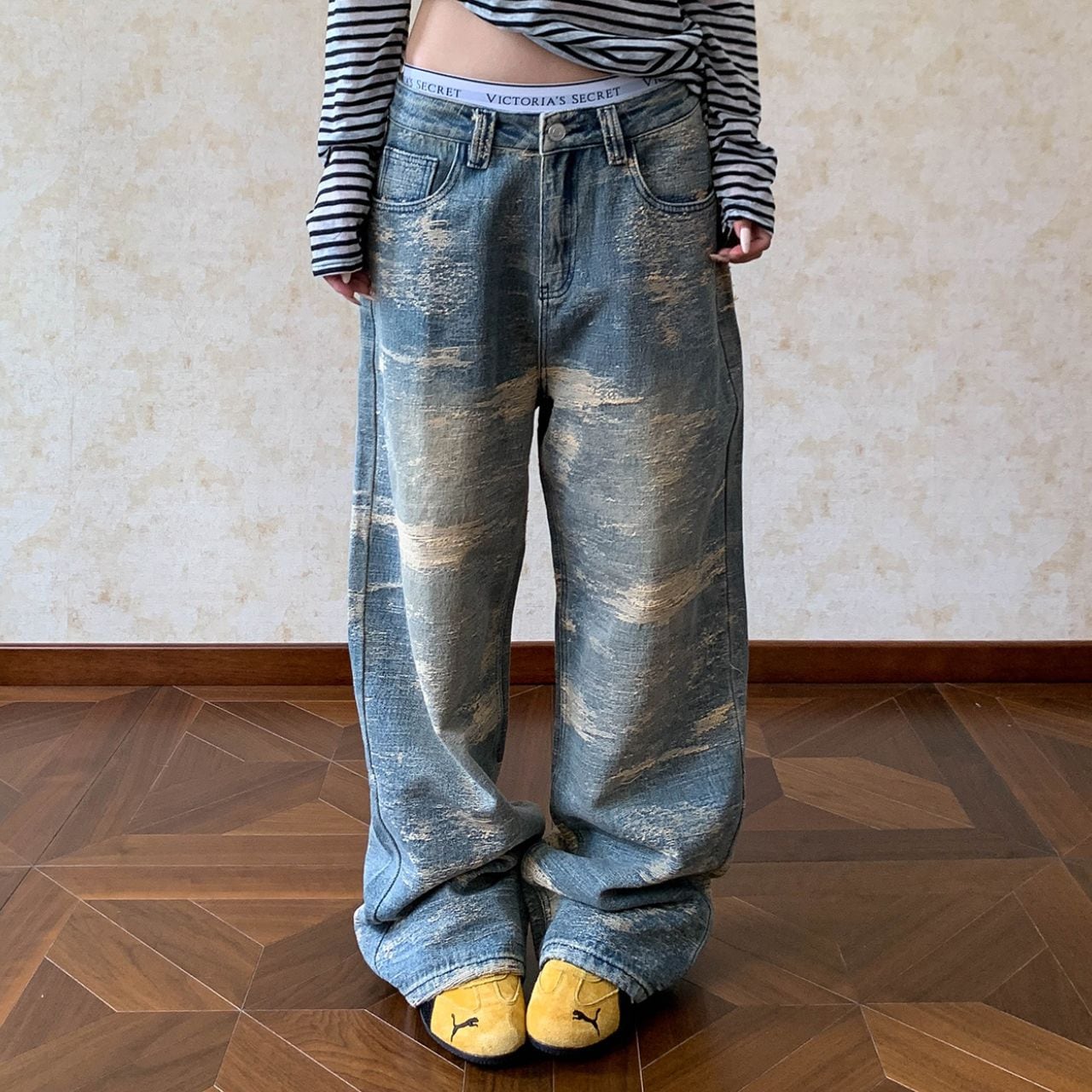 大胆なクラッシュ風デザインが主役になるワイドデニム。
