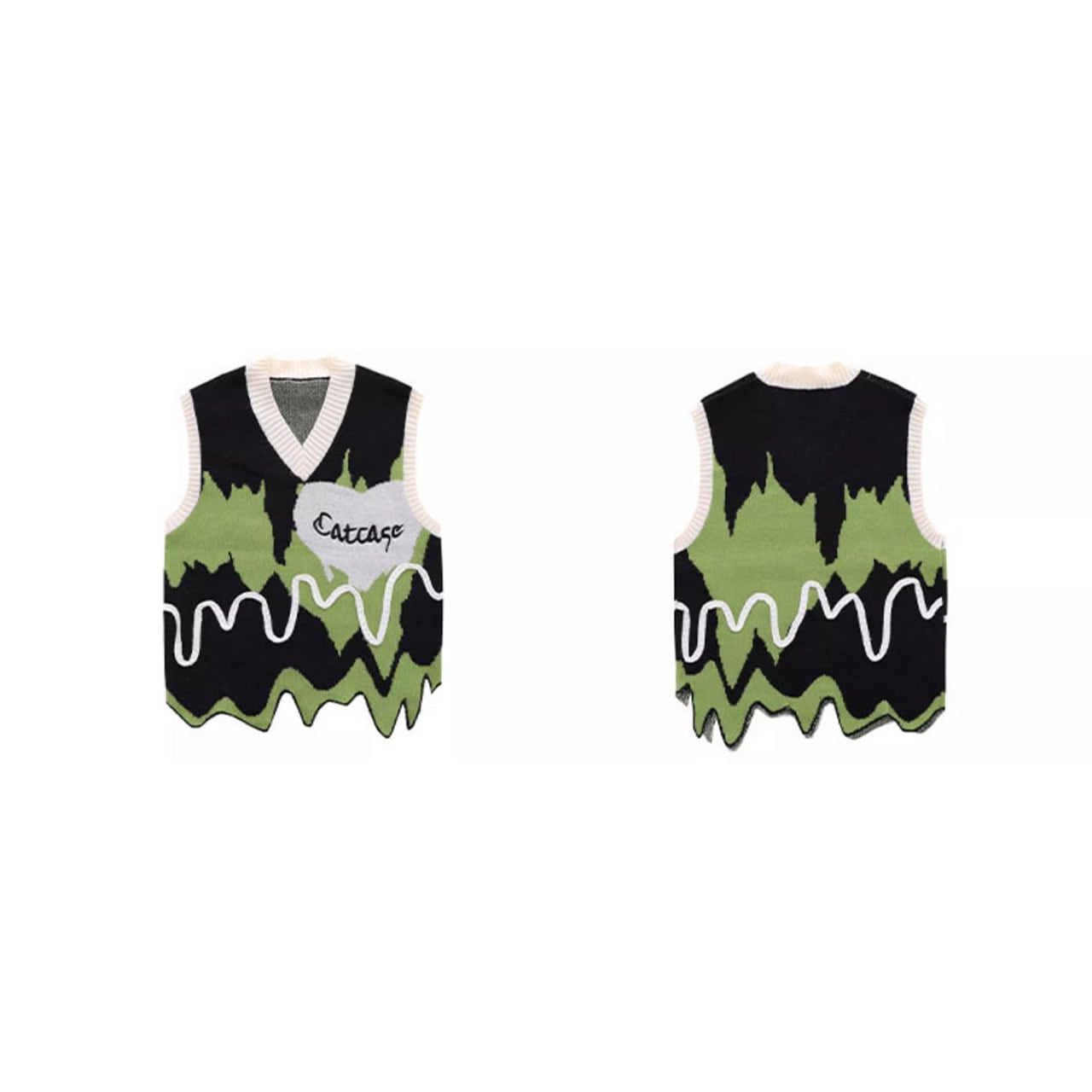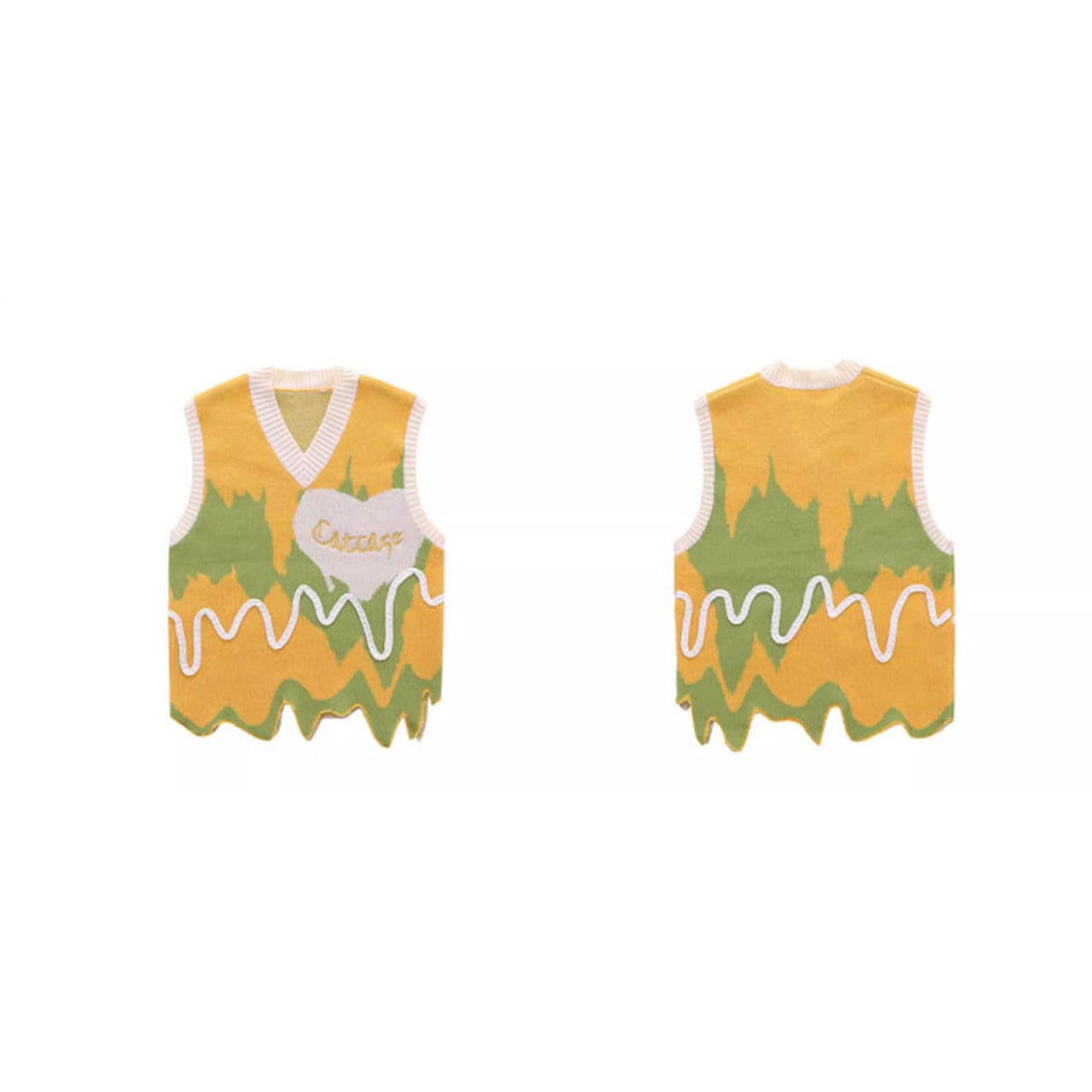 インパクト抜群のアート柄とウェーブカットが主役級のベスト。