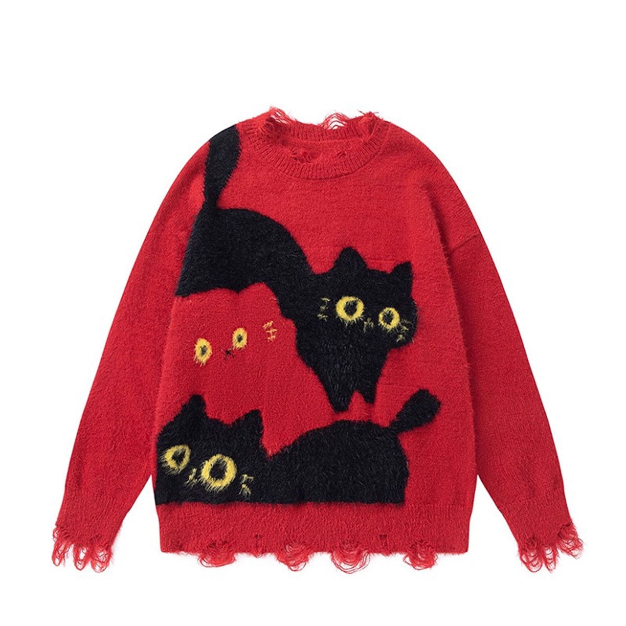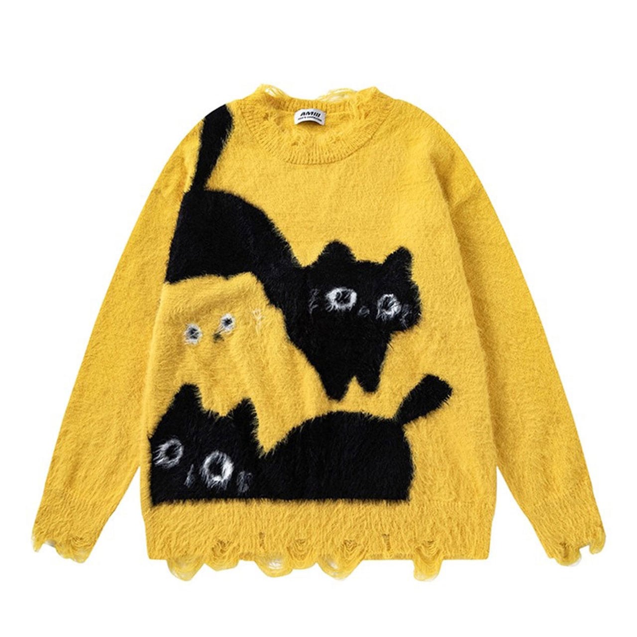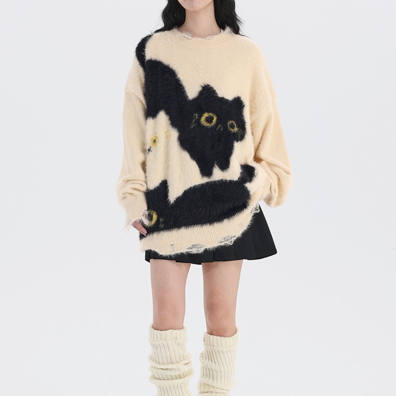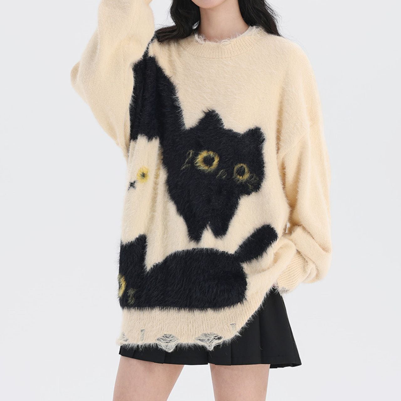 レトロポップな猫柄がコーデ全体を明るく見せるカジュアルニット。