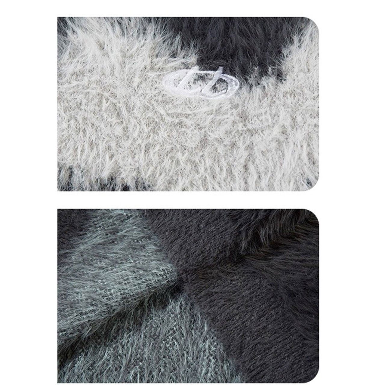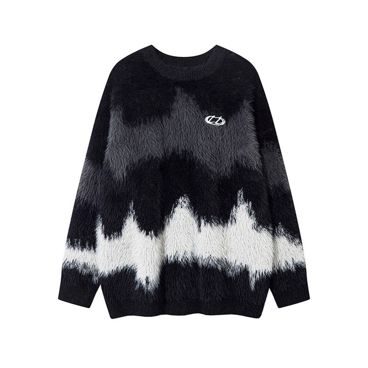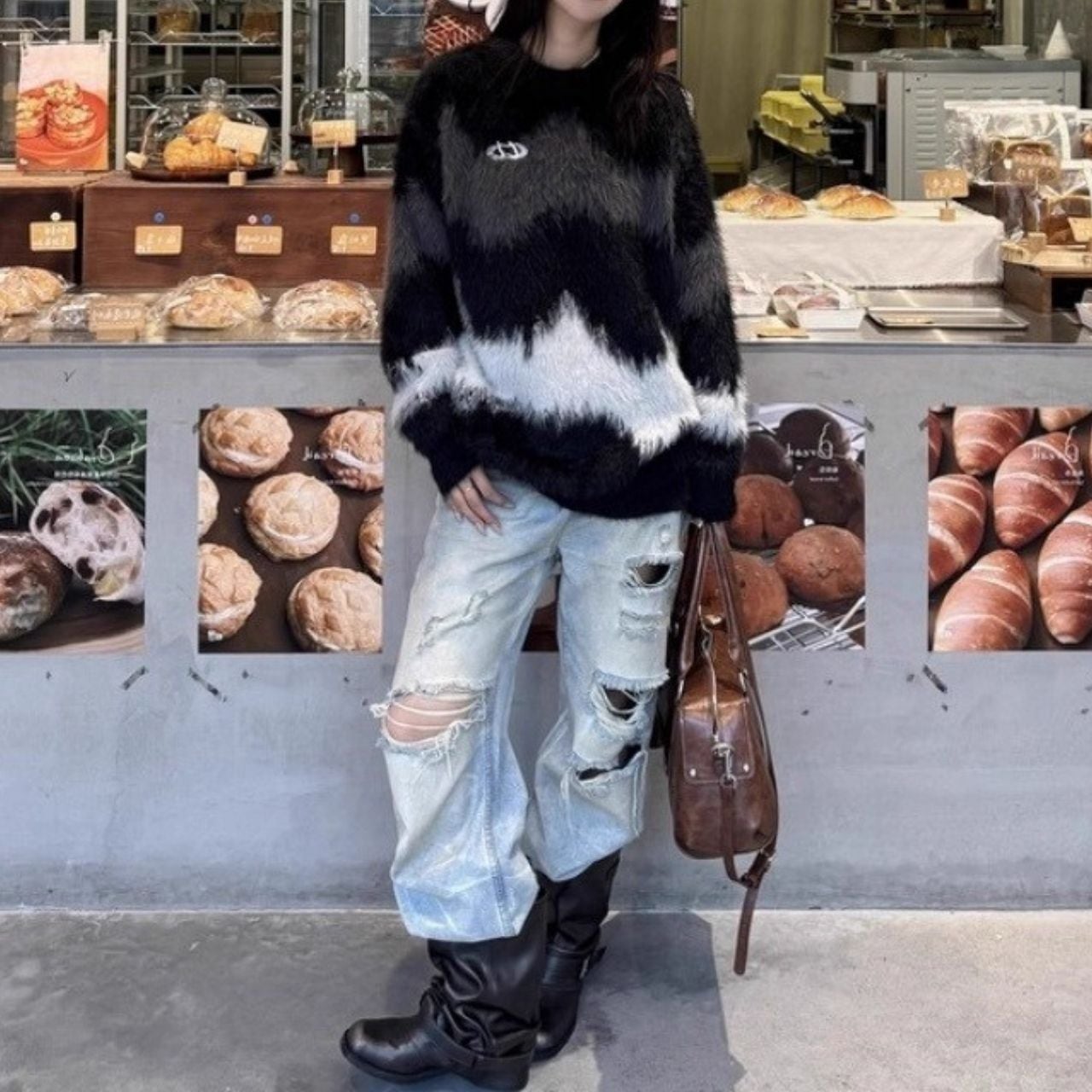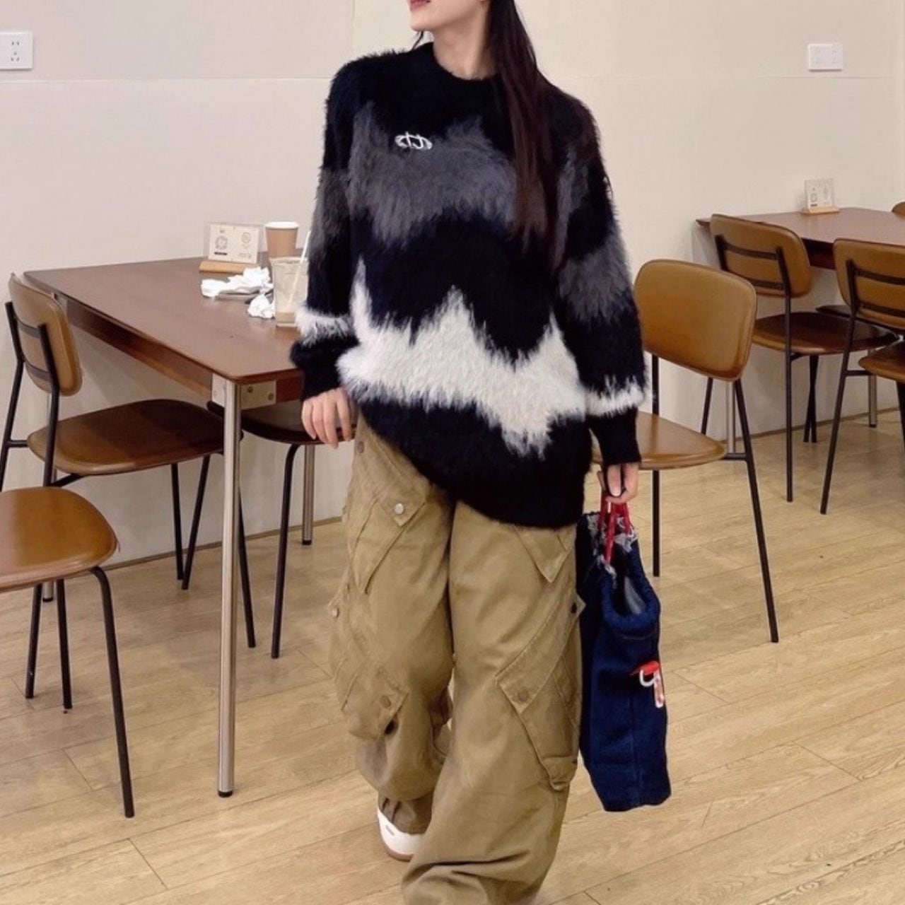 モコっとした質感に大胆なパターンをのせたアート系ニット。